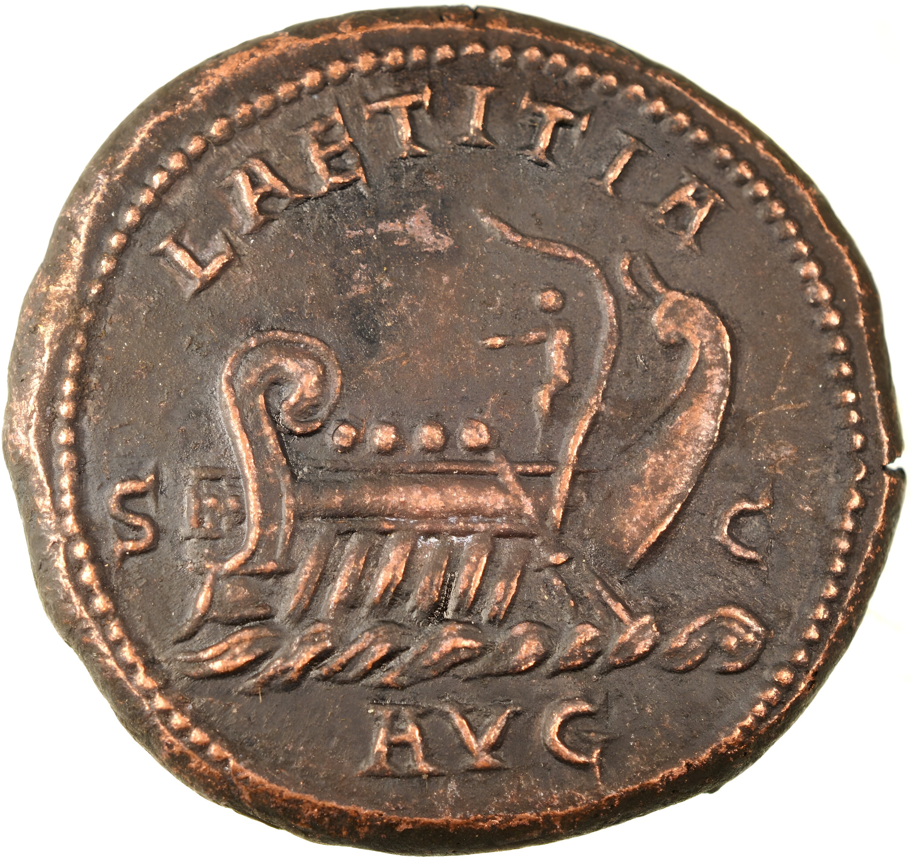 Reverse side: Galley, right, with four rowers and steersmen, LAETITIA AVG S-C