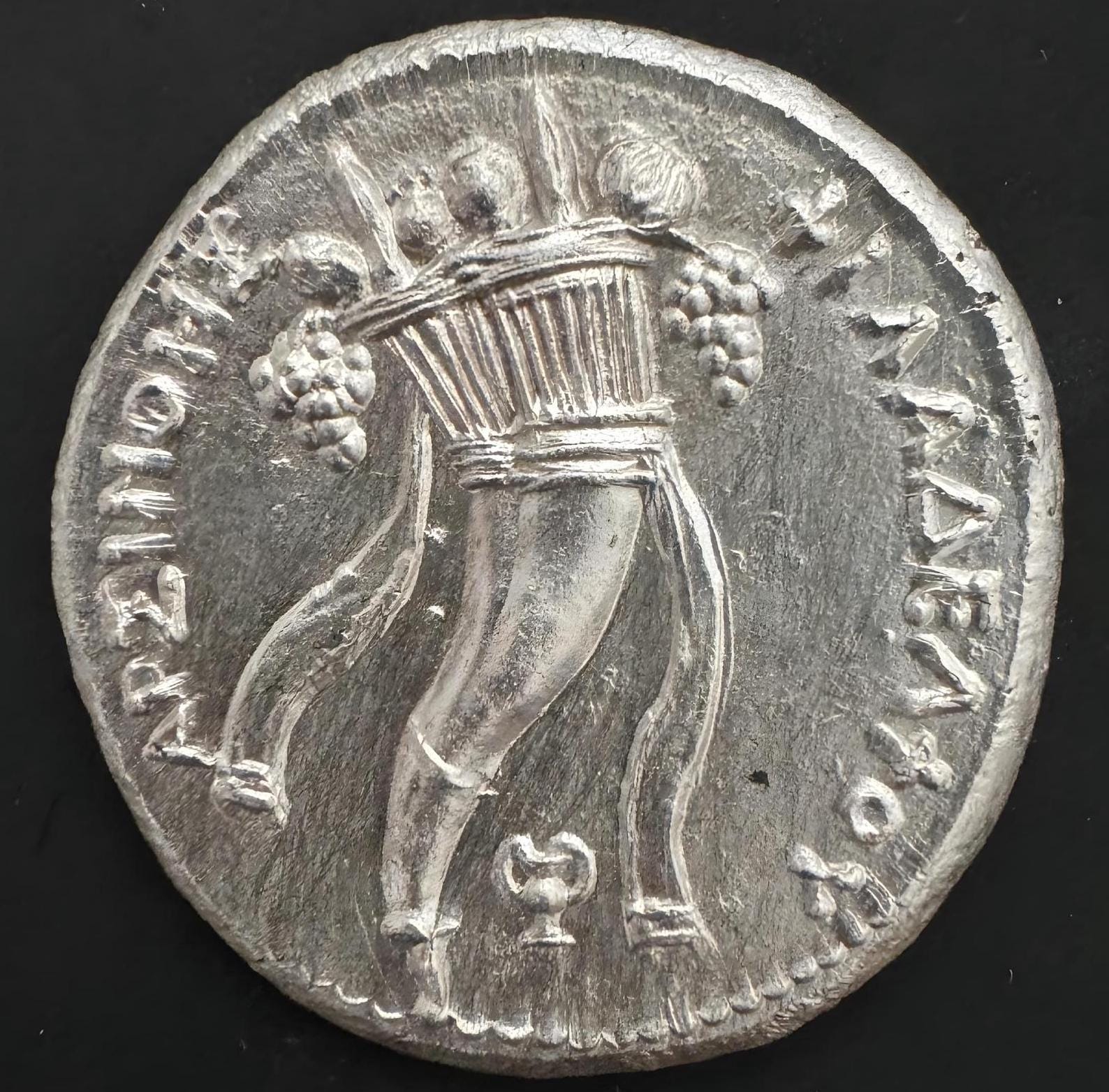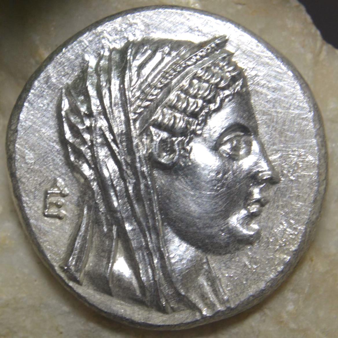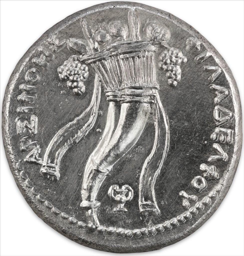 The ostentatious display of Egypt’s wealth under the Ptolemies was not confined to gold coinage. Ptolemy I and his immediate successors also struck silver coins in larger denominations than any contemporary kingdom or city-state. Along with the vast outpouring of gold in the name of his sister-wife Arsinöe II, Ptolemy II also struck silver decadrachms displaying her veiled portrait backed with the cornucopia, symbolizing Egypt’s agricultural abundance.