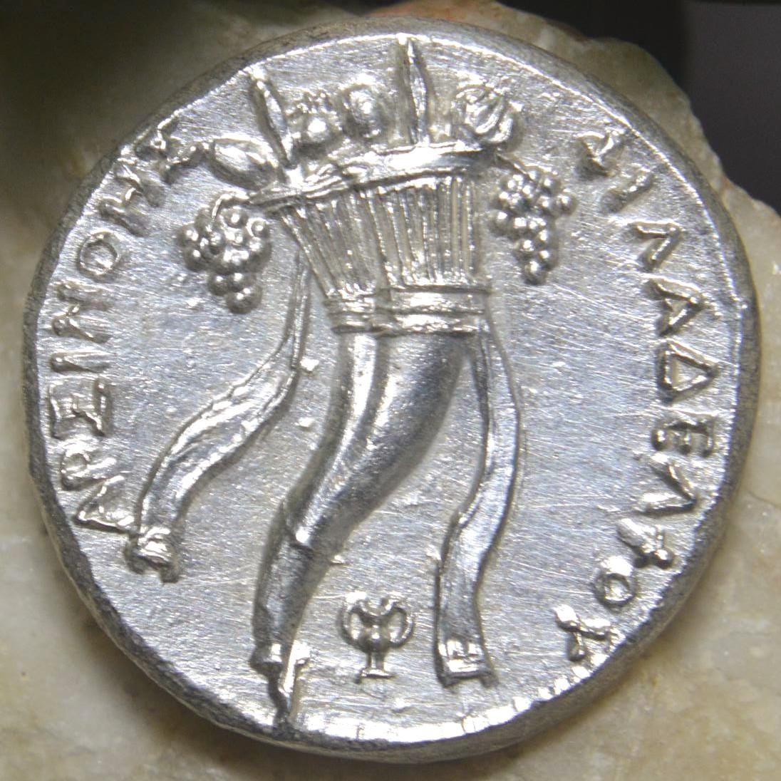 Rev: Double cornucopiae with fruits and grape bunches hanging at sides, bound with fillet; amphora with high handles below. APΣINOHΣ ΦIΛAΔEΛΦOY