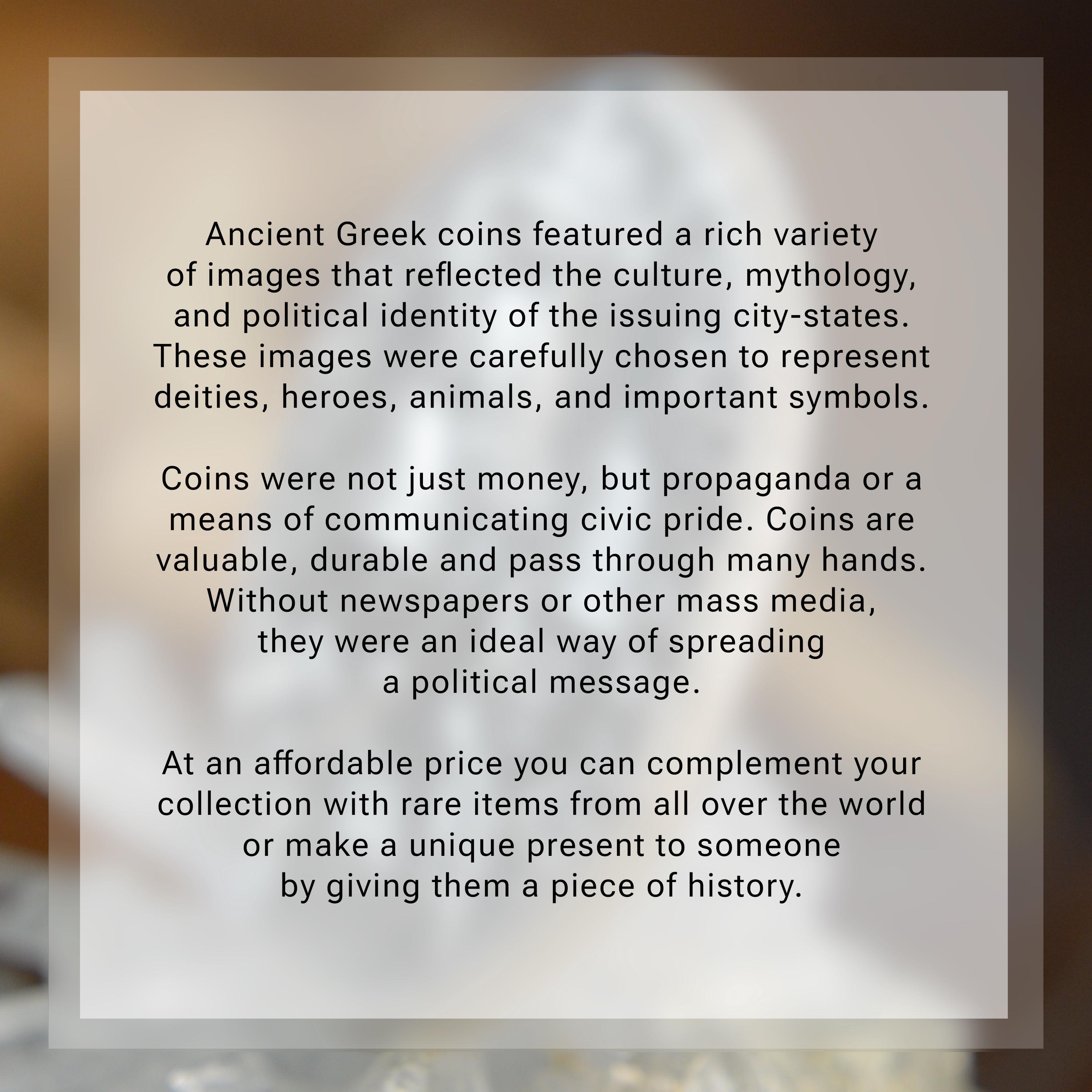 The images on early Greek coins give us a lot of information about Ancient Greek life and culture . For example images of sacred and important buildings and temples, show us what their buildings looked like thousands of years ago. Coins were not just money, but propaganda or a means of communicating civic pride. Coins are valuable, durable and pass through many hands. Without newspapers or other mass media, they were an ideal way of spreading a political message.