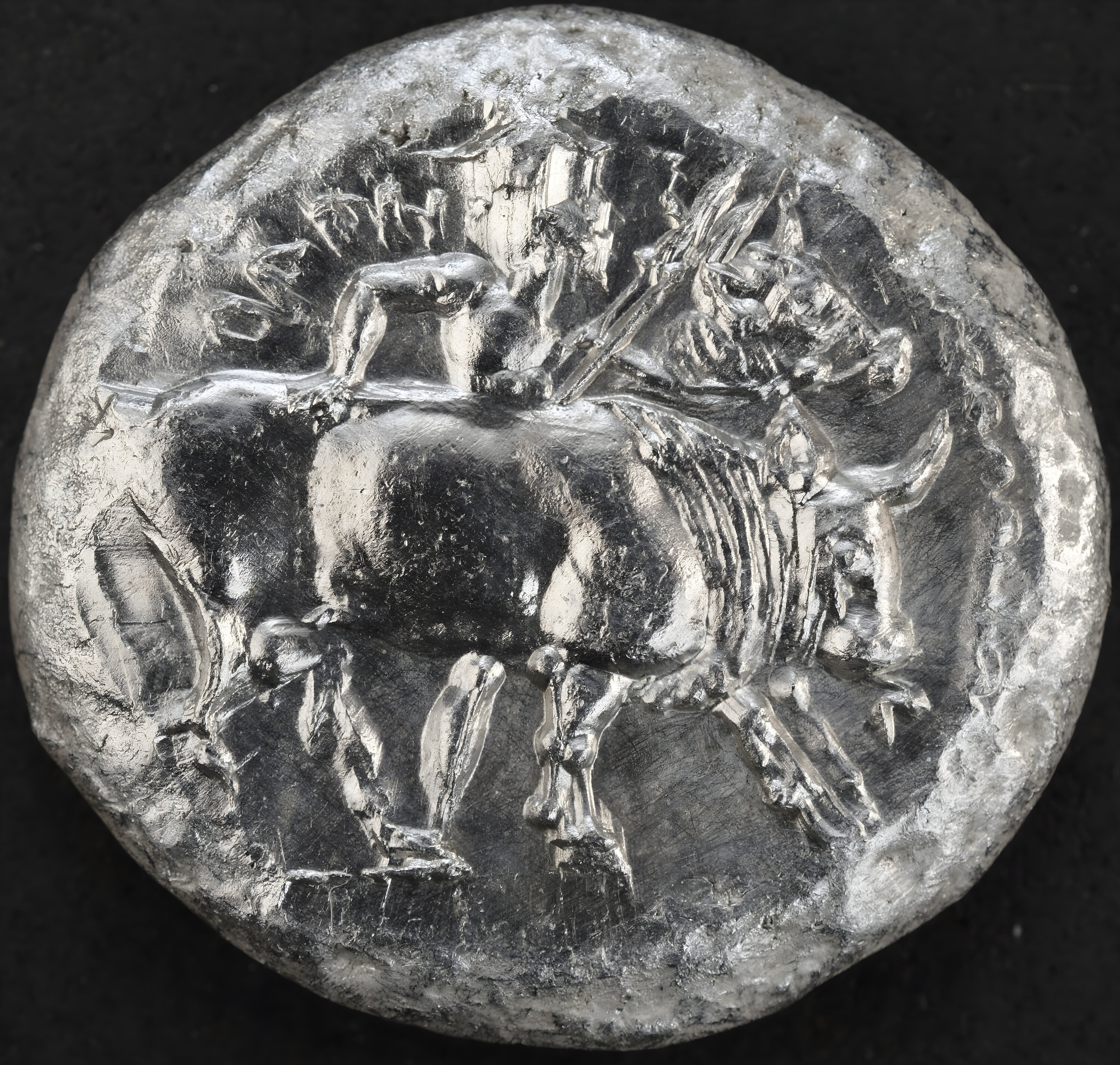 Known only from their coinage, the Orreskioi, like many of the other Thraco-Macedonian groups, inhabited the mountainous region along the Strymon River which divided Macedon, Paionia, and Thrace, though the exact location remains uncertain. Their name may almost certainly derive from the Greek oreskwoi, meaning mountainfolk, an epithet associated since Homer with the wild, mountain-bred Centaurs. The lack of any evidence for the Orreskioi in the Greek authors indicates an apparent lack of interest in the region prior to the rise to international prominence of the Macedonian royal house in the fourth century BC. What is clear is that the region’s coining authorities adopted a common weight standard and designs based on regional mythological associations: the horseman, or Ares type may refer to the Homeric hero Diomedes, renowned for his fire-breathing horses; the satyr-maenad type alluding to Dionysos; and the herdsman, or Hermes type, as evidenced by this coin and the contemporary oktadrachm of Getas, king of the Edones, which refers to the theft by the infant god of the cattle of the Sun (Apollo). Macedon had a close connection with both gods; in fact, the caduceus continued to be employed as a brand on Macedonian horses. The royal house, however, apparently found the allusion of the herdsman design too ambiguous or deemed it inappropriate as the new iconography. It therefore did not continue the type among its own regal types; instead choosing the horseman as its early type. “Of the gods they worship only Ares and Dionysus and Artemis. Their kings, however, apart from the rest of the people, worship Hermes more than all gods, and swear by him alone; and they say that they are descended from Hermes.” This is how Herodotus describes the customs of the Thracians. Naturally, here we have the typical misunderstanding of a Greek trying to refer to foreign deities by using the names of the gods he worships.