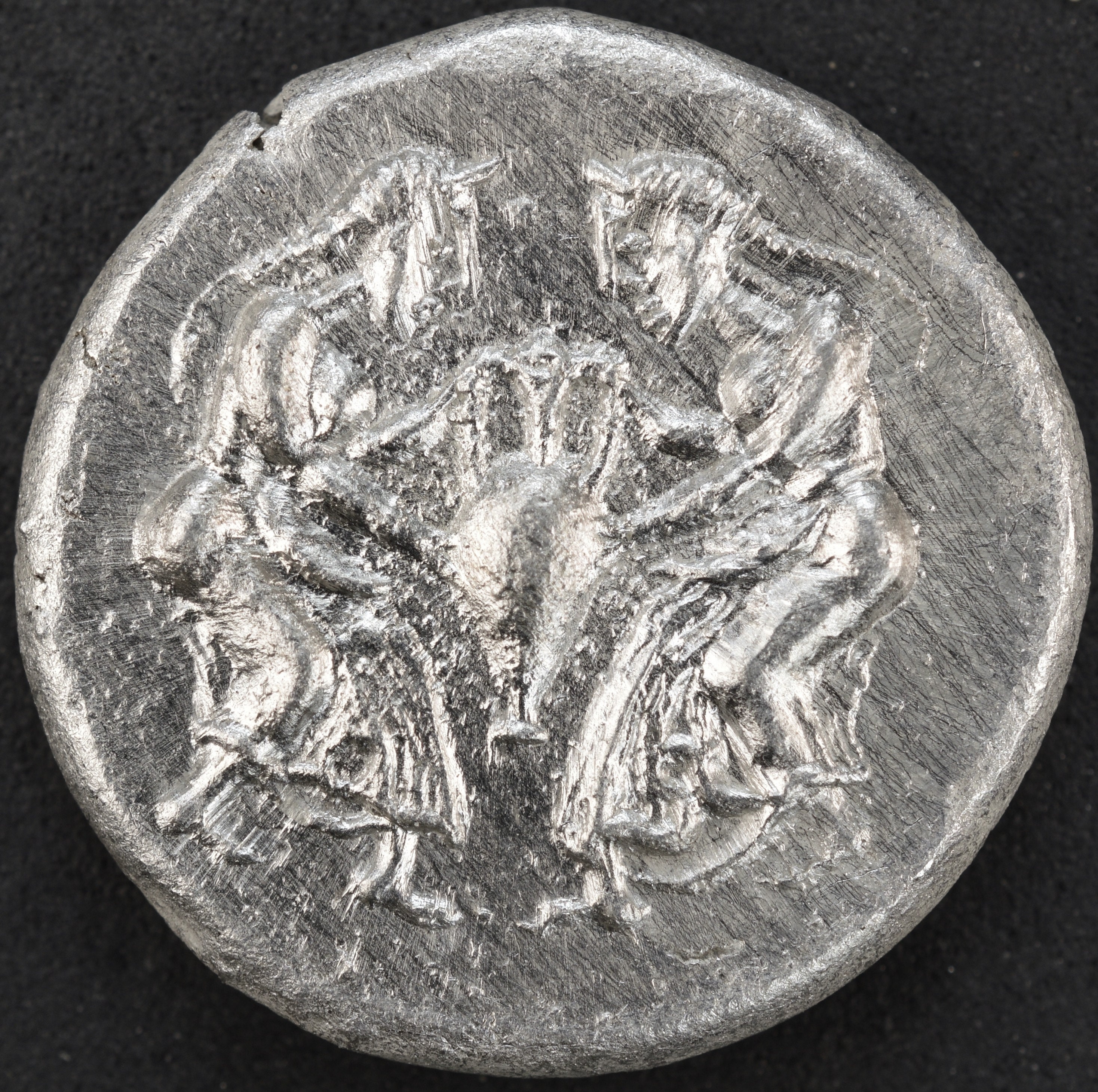 Obv.: Ithyphallic satyr holding amphora right, Ithyphallic satyr holding amphora left