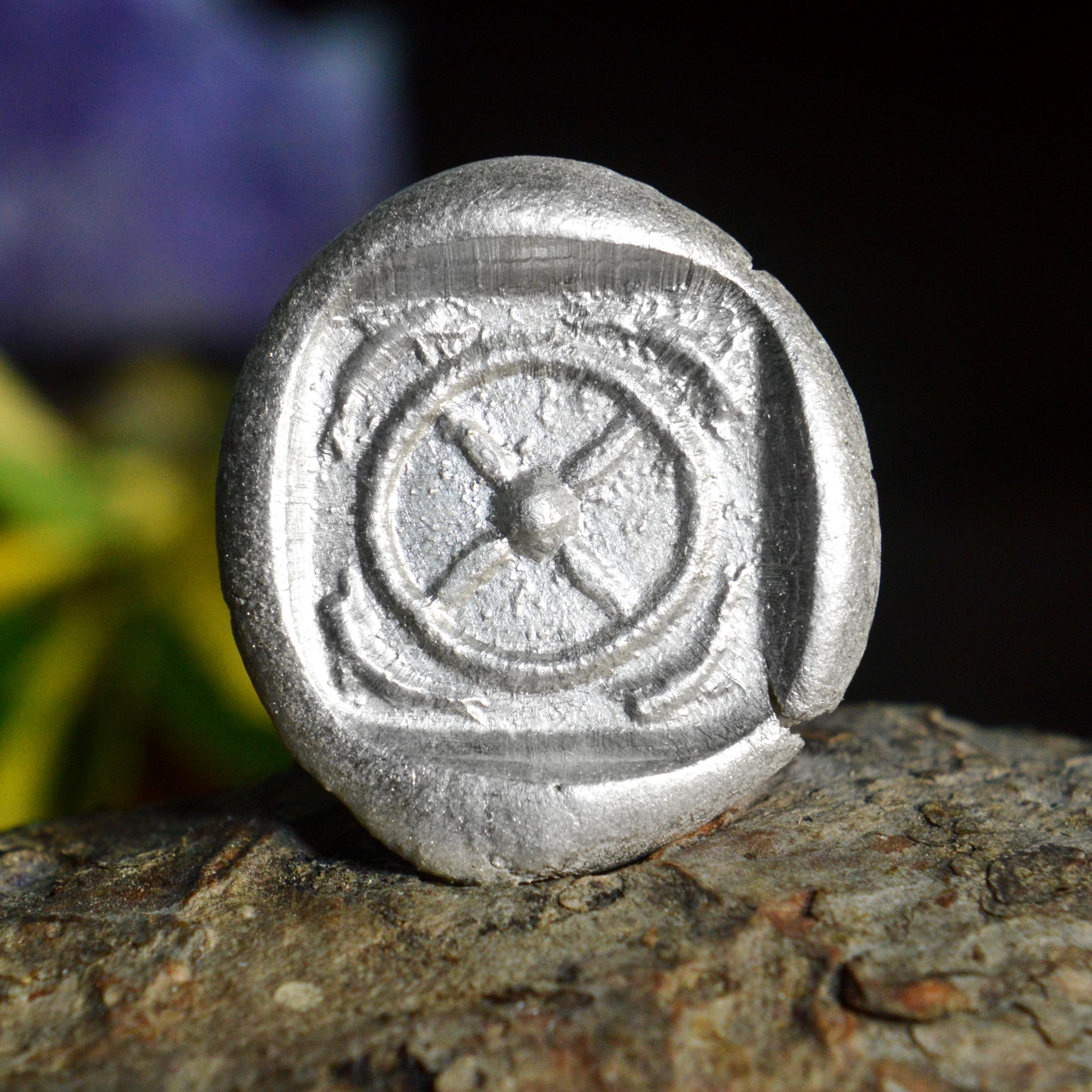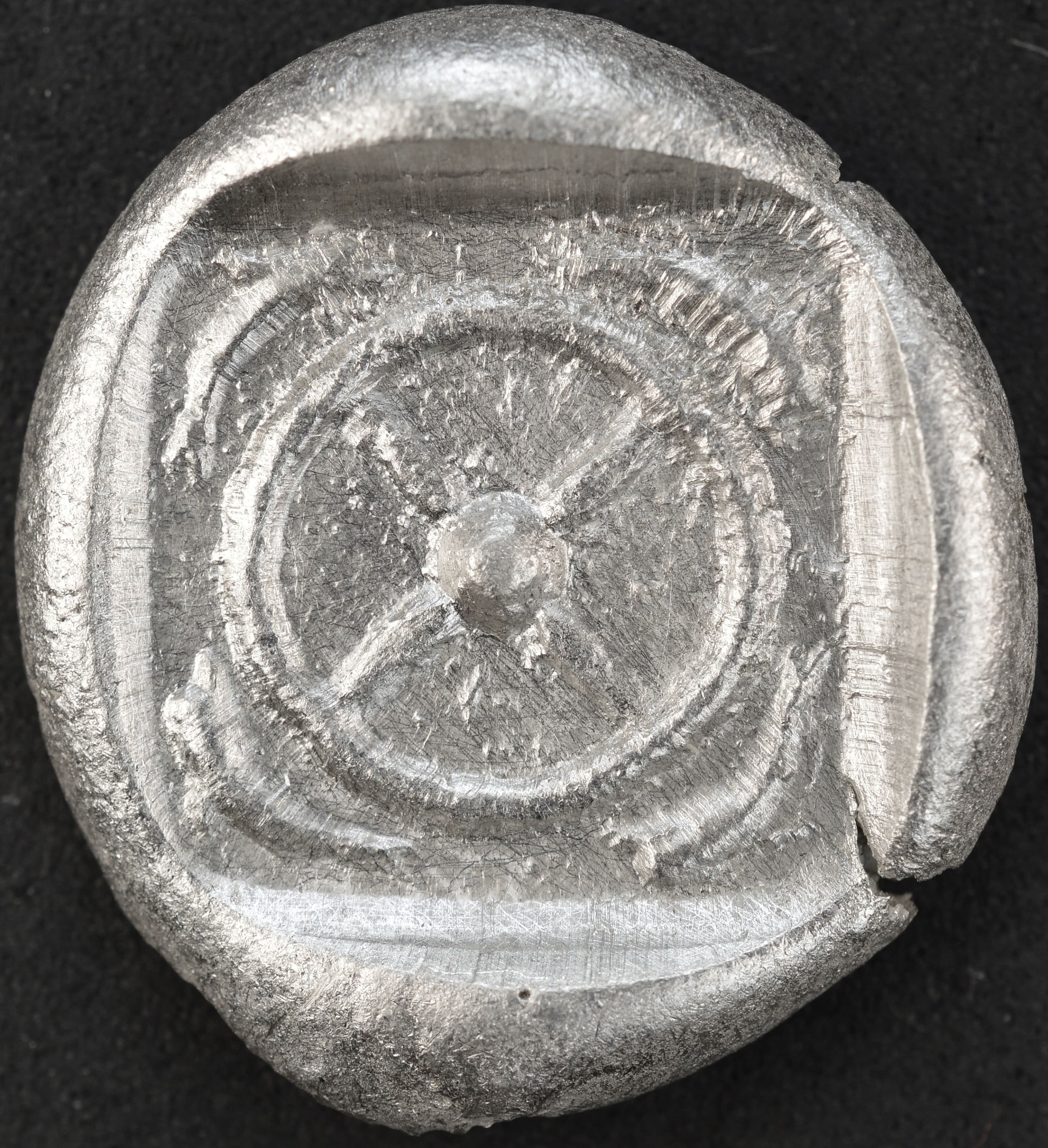 Reverse: Studded wheel with four spokes, four dolphins swimming clockwise around and all within incuse square