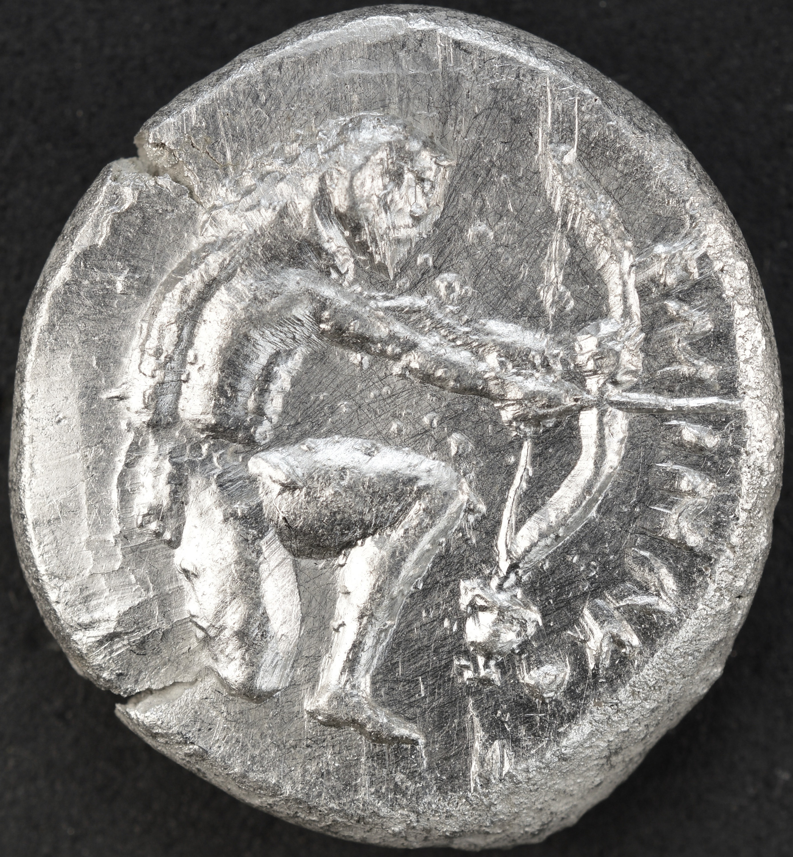 Obverse: Herakles, wearing lion skin, kneeling right, drawing a bow, EMINAKO