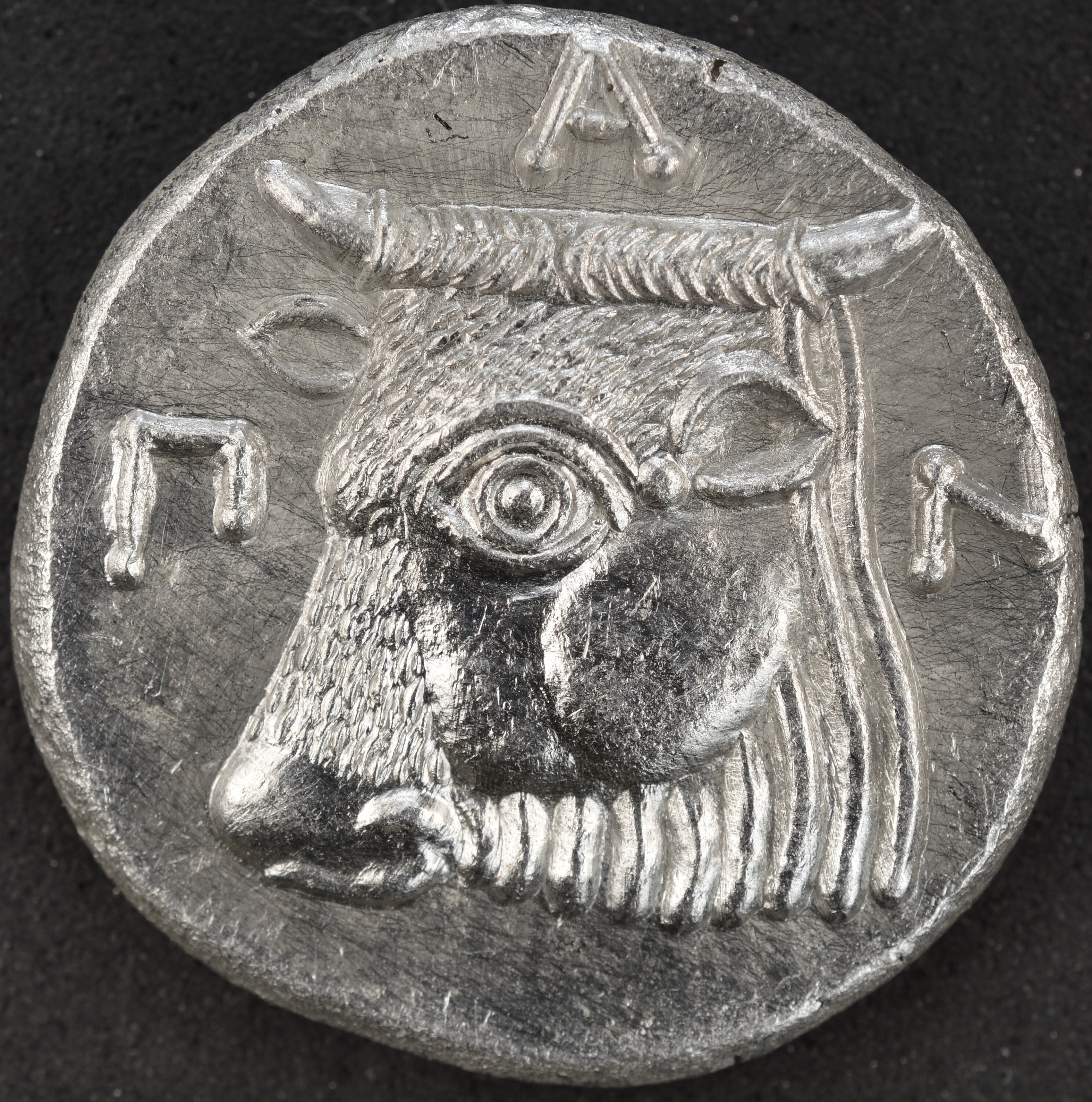 In Greek mythology, satyrs were half-man half-goat creatures who roamed the woods and fields, drinking wine, playing panpipes, and in constant search of nymphs. Attic painted vases depict them with snub noses, pointed goat ears, and long wavy hair, with mature satyrs often shown with goat’s horns and full beards. Satyrs closely resembled Pan, the Greek god of shepherds and fields, and were his devout companions. Because of the physical similarity between the satyr and Pan, there has been a long numismatic debate on whether the emblematic head appearing on Pantikapaion coins represents Pan or a satyr. The more traditional interpretation is to view the character as Pan, a view bolstered by the usual presence of the word PAN on the coins.