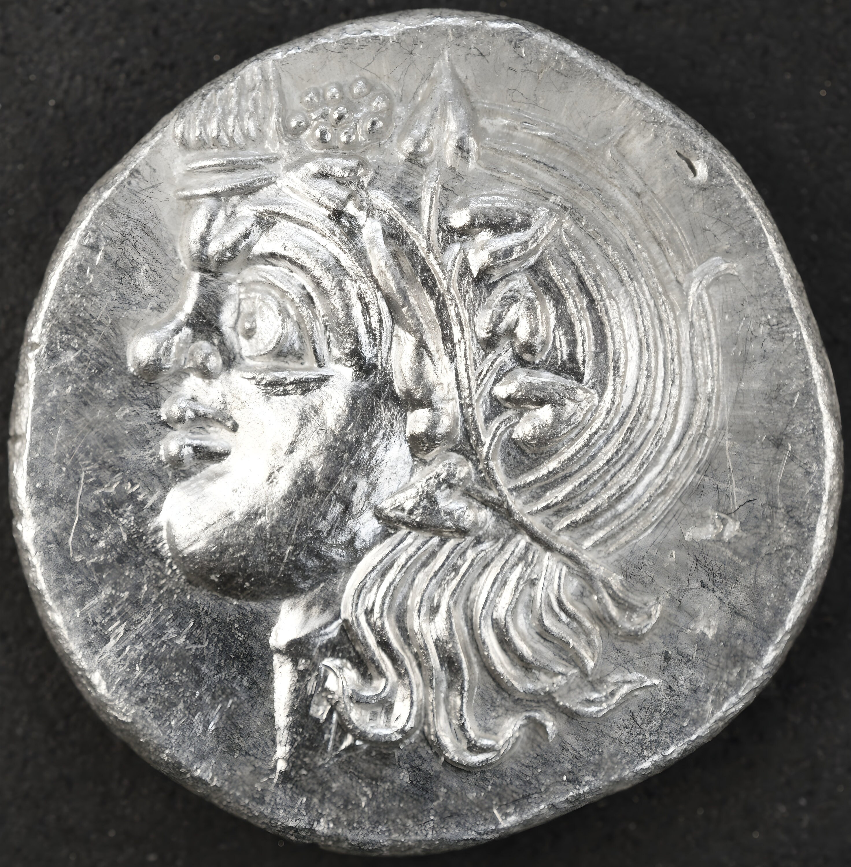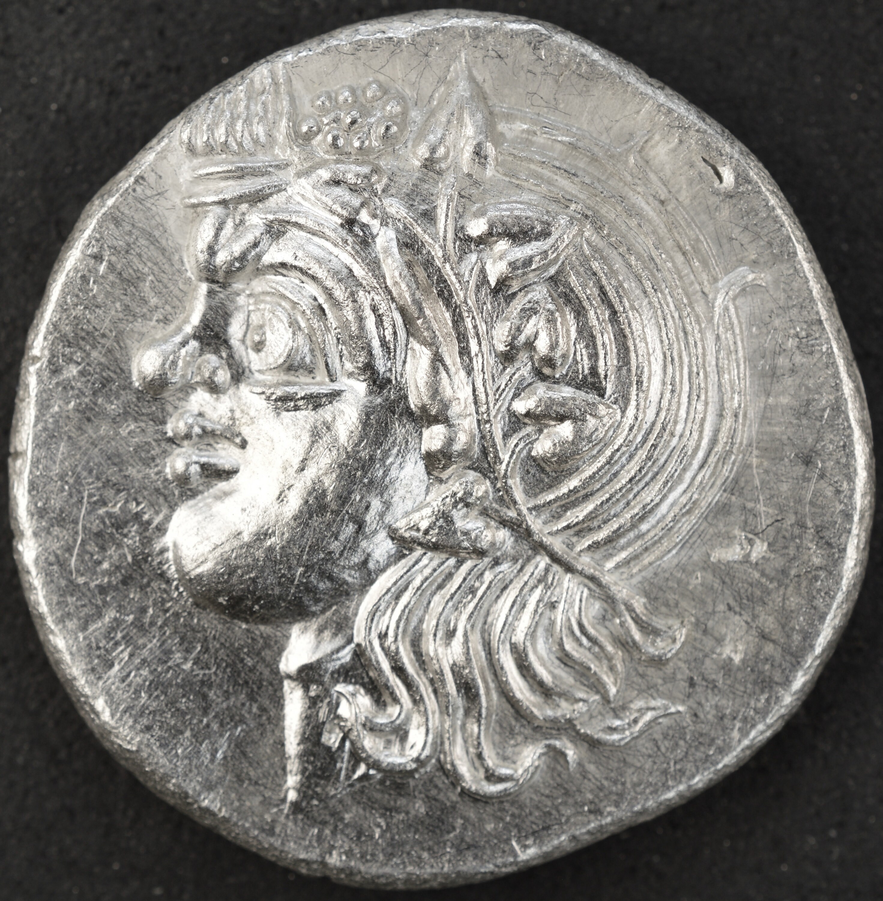 Obverse side: Head of a youthful satyr to left, with a pug nose, a bony knob on his forehead, a pointed animal’s ear and an ivy wreath