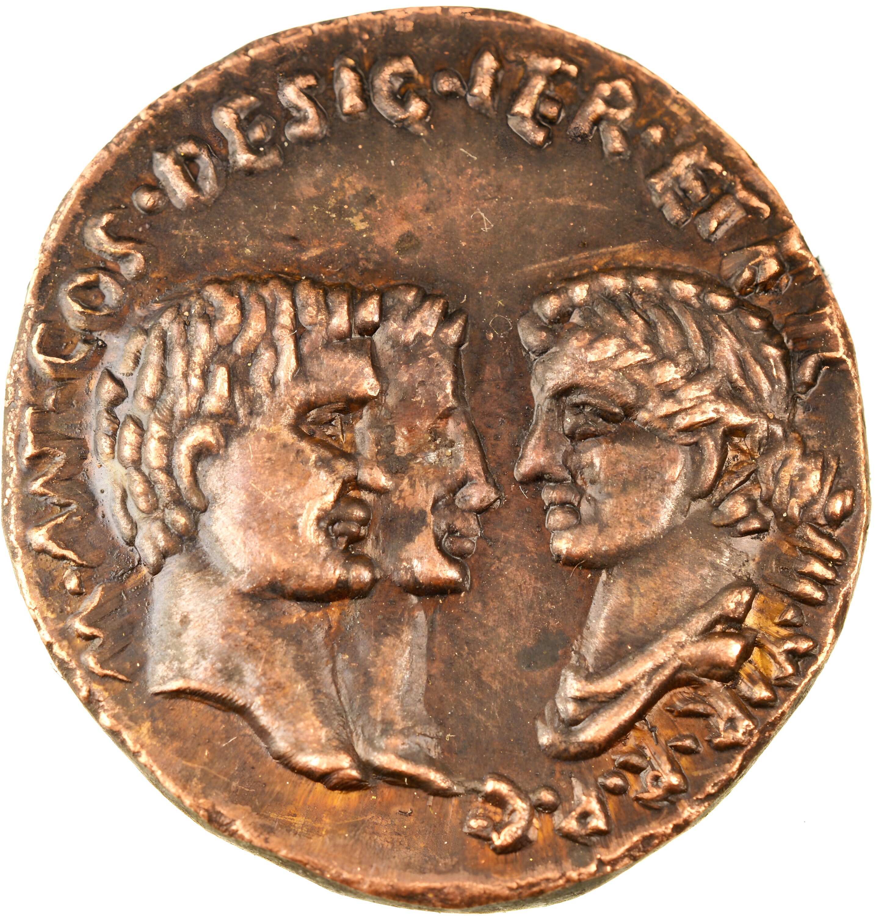 Obverse side: Bust of Antony and Octavian at l., facing r.; bust of Octavia, r., facing l., M ANT COS DESIG ITER ET TER III VIR R P C