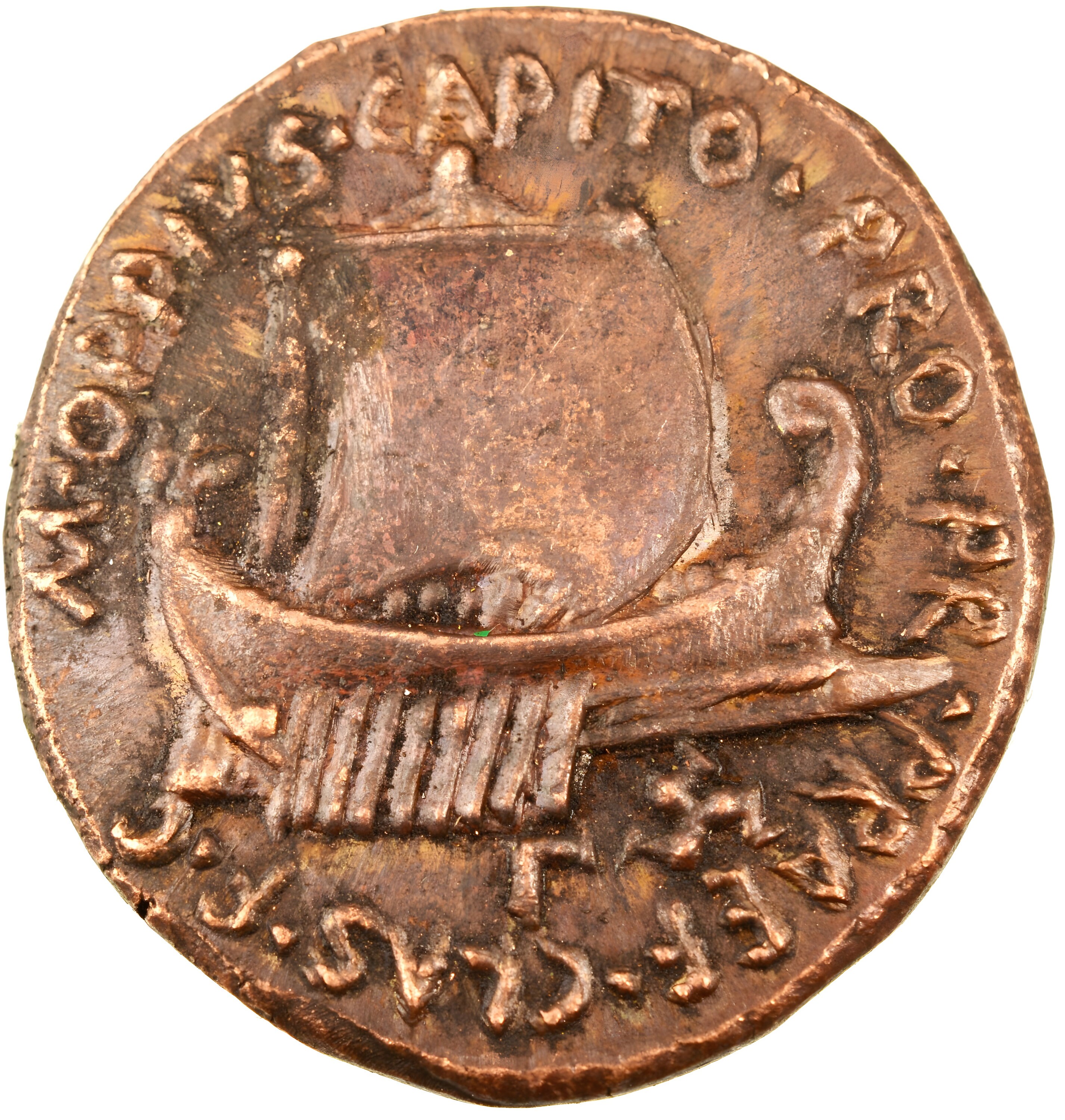 Reverse side: Ship under sail, right; triskeles, M OPPIVS CAPITO PRO PR PREAF CLASS F C, Γ (below)