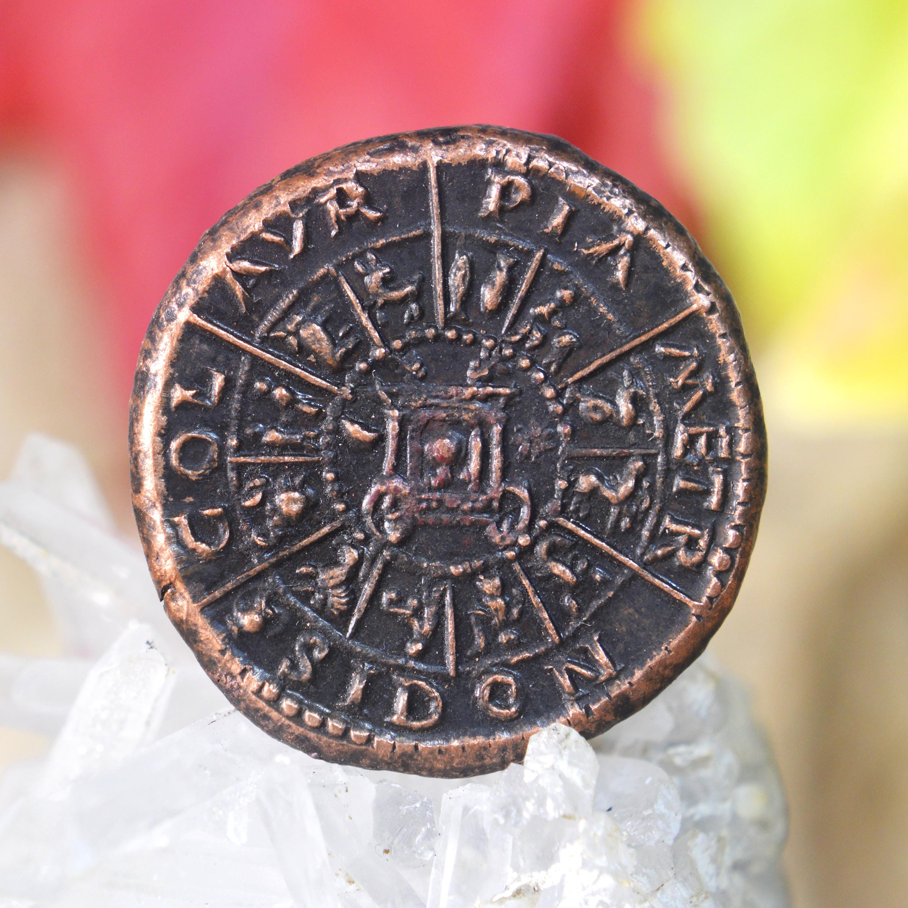 Reverse side: Cart of Astarte containing baetyl within center of zodiacal wheel divided by registers, COL -AVR -PIA -METR – SIDON divided by registers