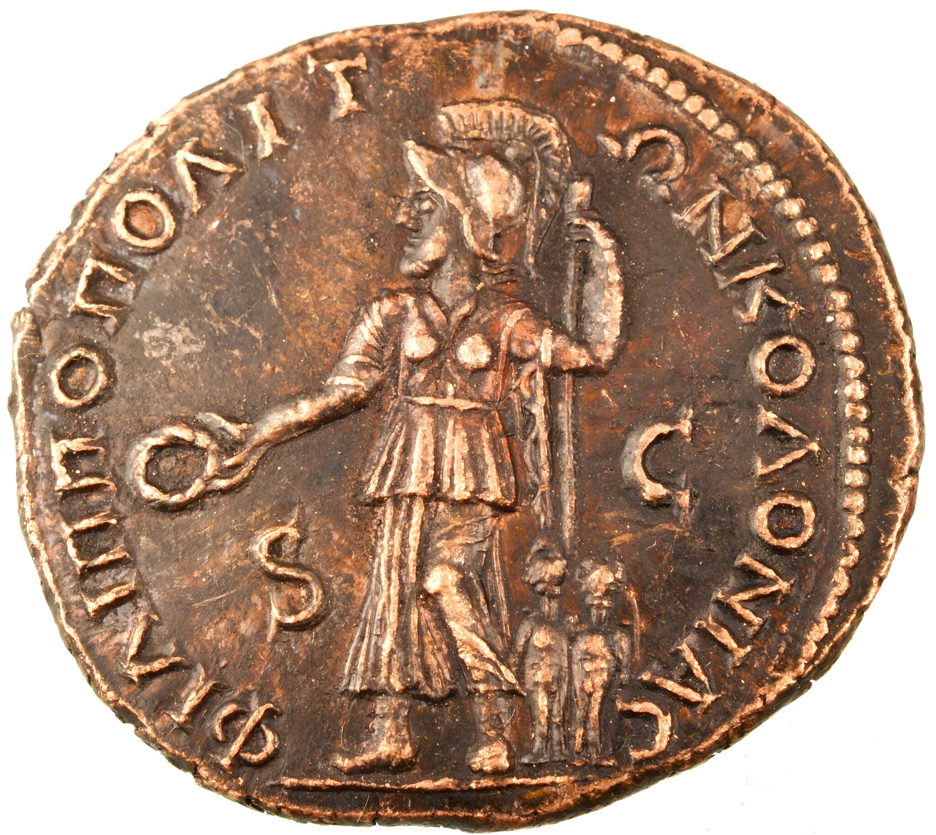 Rev.: ΦIΛIΠΠOΠΛIT-ΩN KOΛΩNIAC, Roma or Allat standing left, holding patera in extended right hand and spear in left; shield at her side, S C across field.