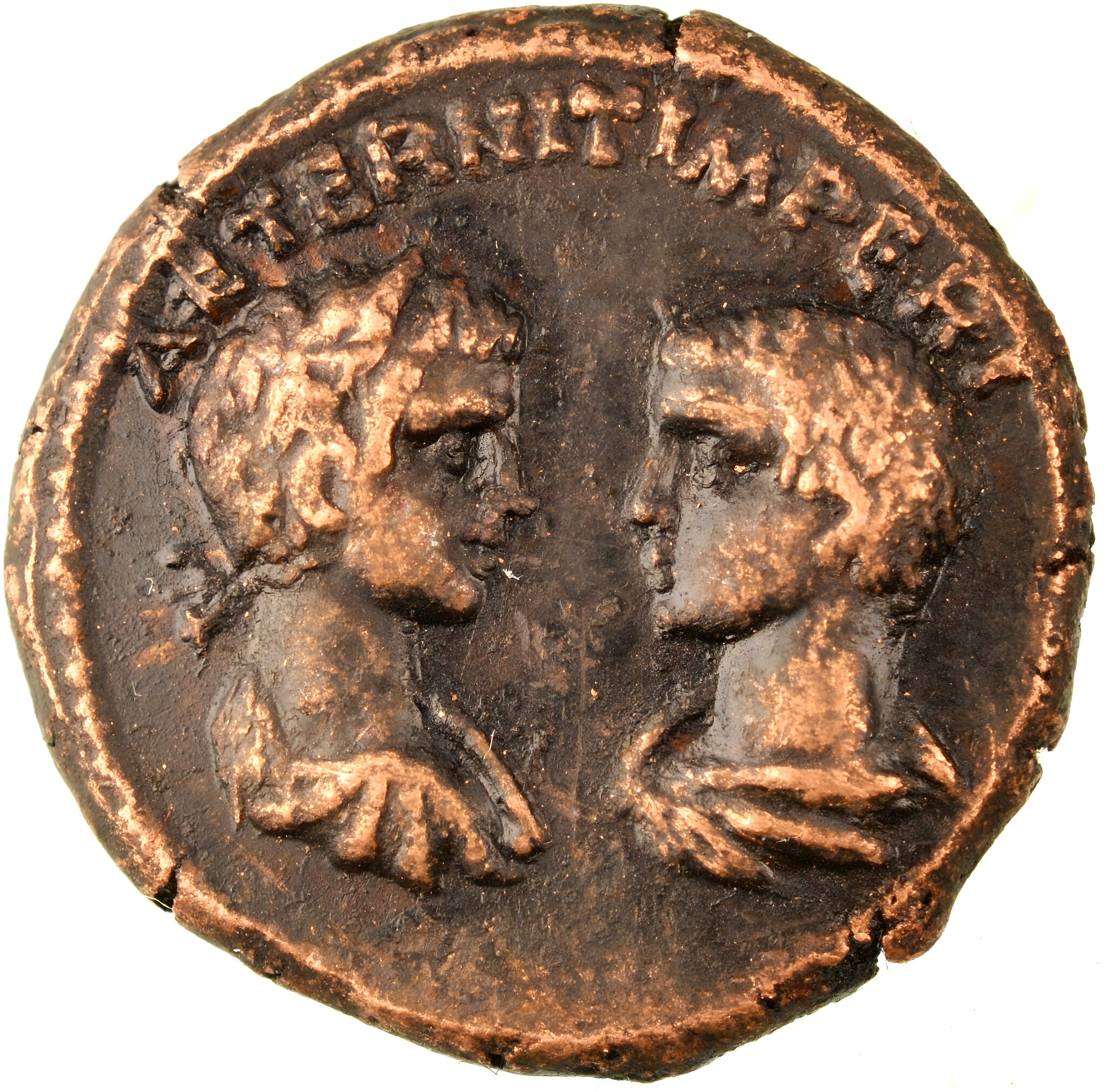 Reverse side: Laureate head of Caracalla right, vis-à-vis bare head of Geta left, AETERNIT IMPERI