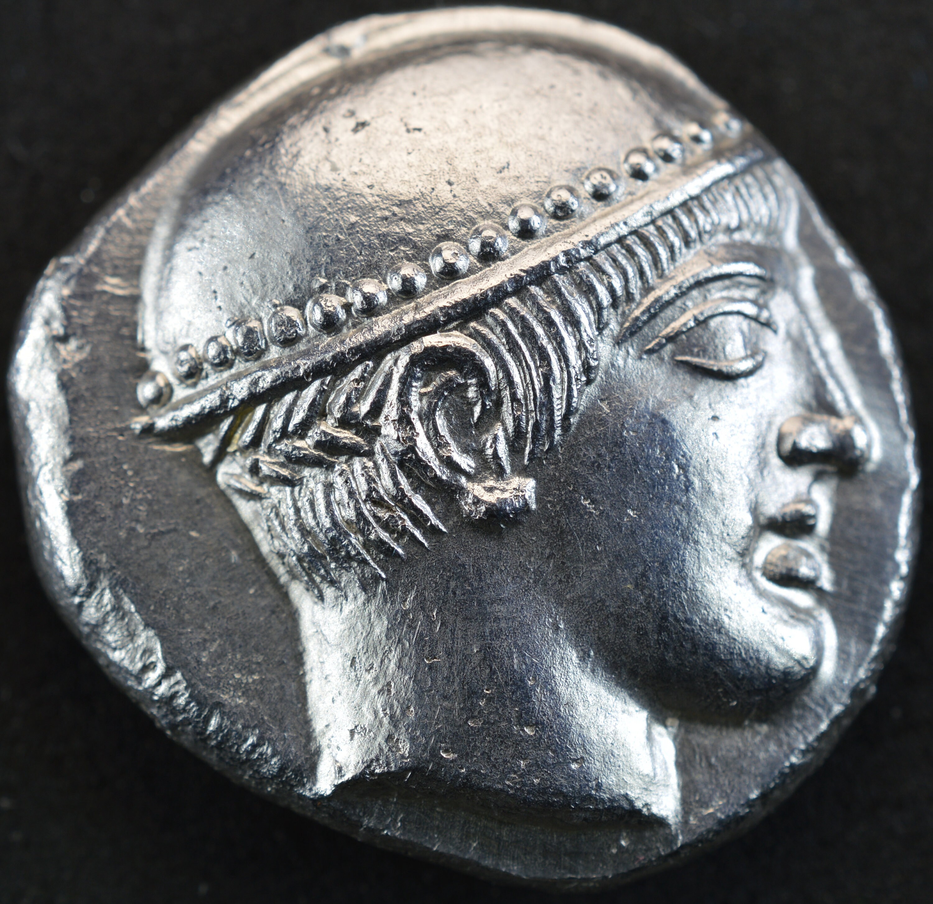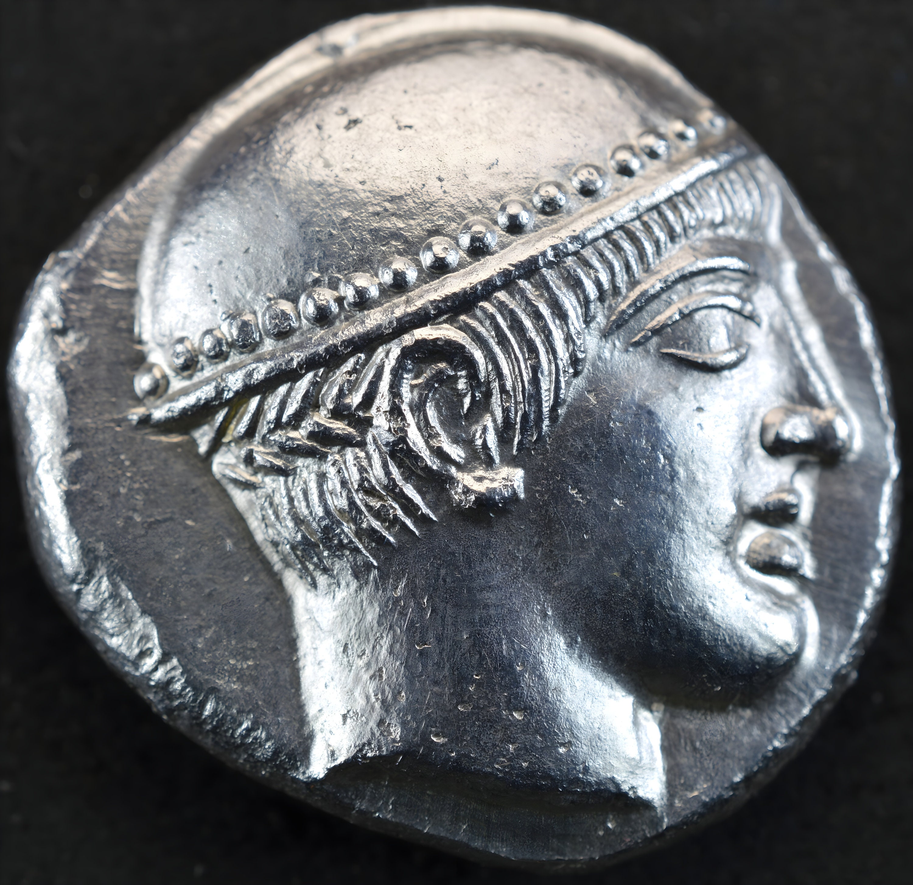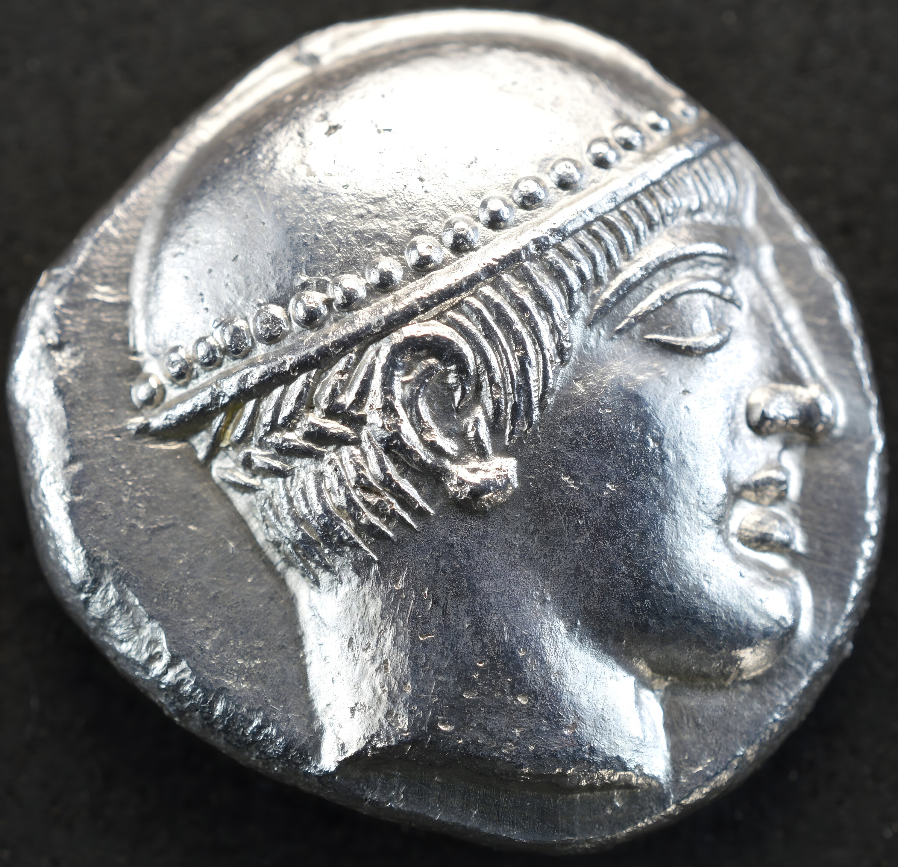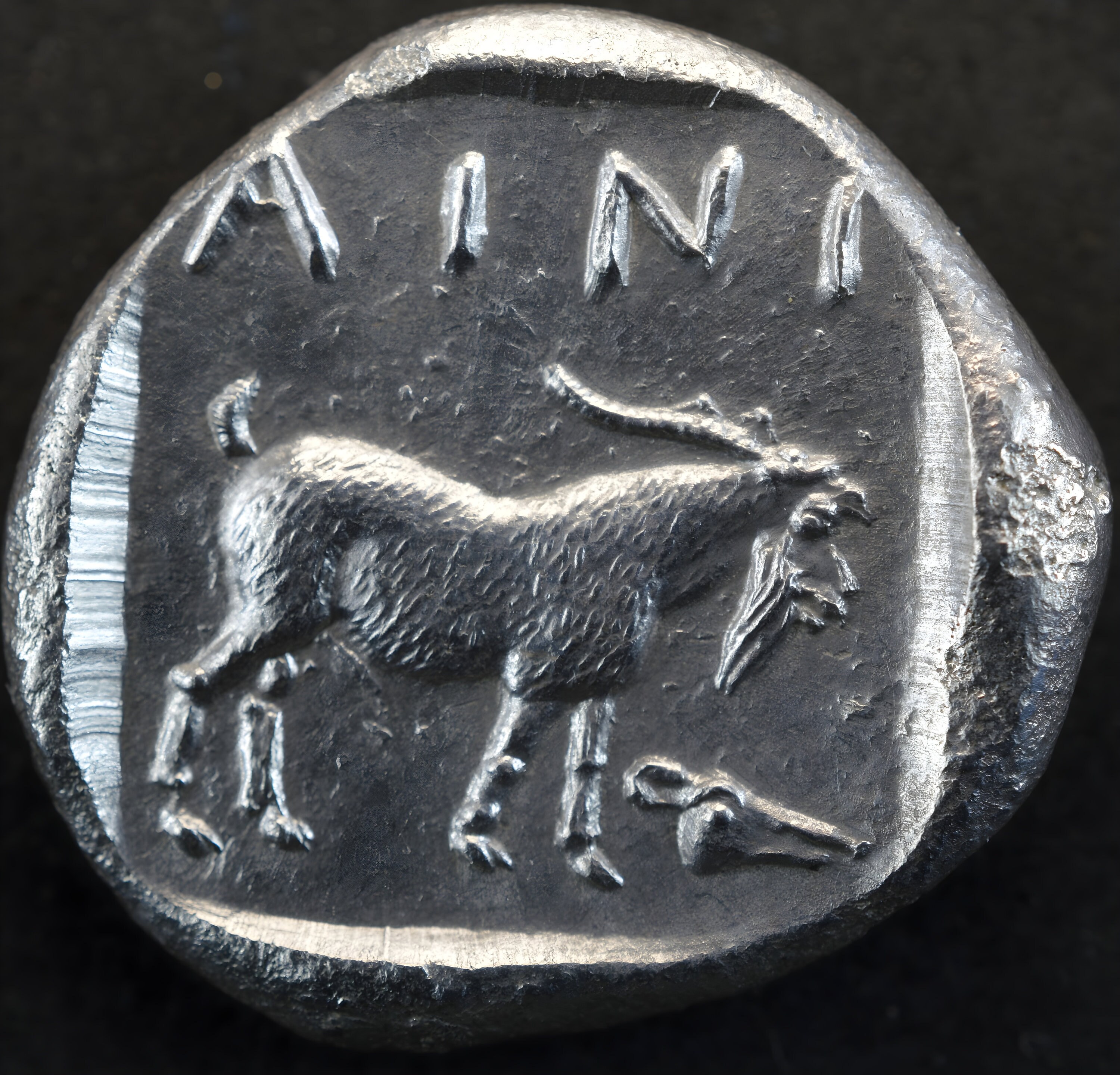 Ainos came rather late to currency production, striking its first tetradrachms only after the expulsion of the Persians from northern Greece following Xerxes’ defeat at Salamis. Its first period ended with the Athenian coinage decree of 449 BC, but the mint was in operation again by circa 435 BC, tapering off rapidly until disappearing with the conquest of the city by Philip of Macedon in 342 BC. Its uniform types throughout its history were Hermes and the goat, the latter the symbol of the pasture land that provided what prosperity Ainos had. Hermes was the patron deity of Ainos, dating from the time of the Trojan War. According to a poem by Kallimachos, the sculptor Epeios, who constructed the Trojan Horse, also made a wooden statue (ξοανον) of Hermes, which was washed out to sea and recovered by fishermen by the Hebros river. The fishermen, thinking it just a piece of driftwood, tried to burn it in their bonfire. When it failed to burn they took fright and threw it back into the sea, which promptly cast it back again. The natives accepted it as a relic of the gods, and erected the sanctuary of Hermes Perpheraios (the Wanderer) at the future site of Ainos. The later coins of Ainos, with their splendid facing head of Hermes, showcase some of the finest numismatic art of the Greek world. Nevertheless, Ainos never became an important city or trading center. The climate might have had something to do with it; according to Athaneus, Ainos had two seasons, eight months of cold and four months of winter. At least the goats liked it.