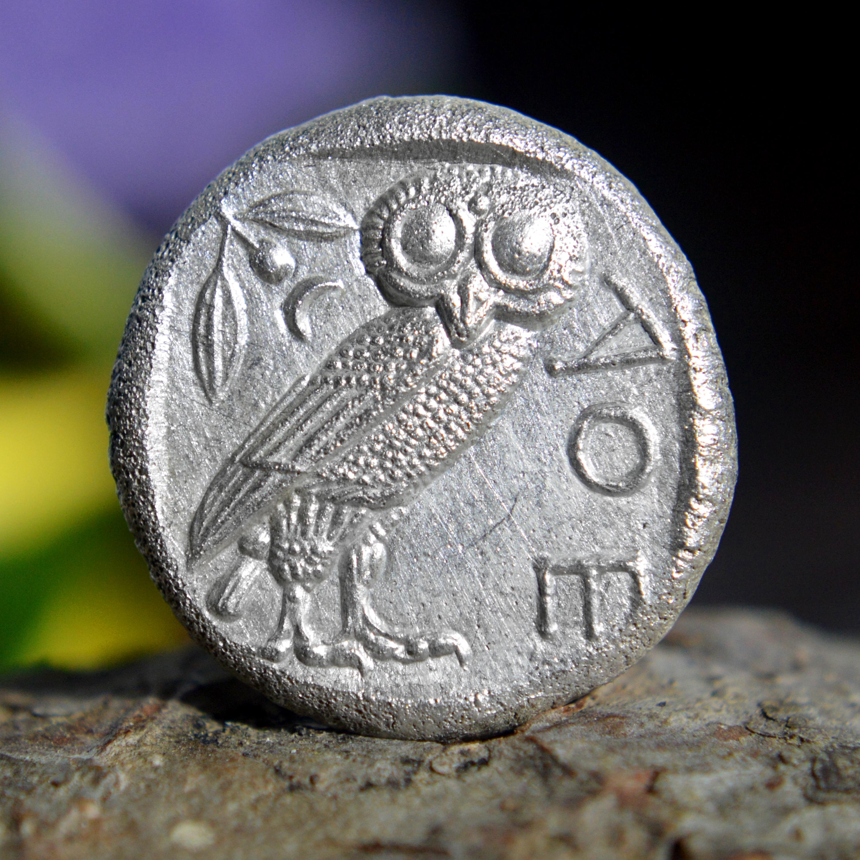 Athenian coins, bearing the helmeted head of Athena on the obverse and an owl on the reverse, became extremely popular throughout the ancient Greek world. Their success was due in part to quality of the silver used, from the Athenian mines at Laurion, and to Athens' military and political supremacy throughout much of the 5th century BC. The coins, known as « owls », were widely used in the 5th century and were copied by other regions, such as Egypt and southern Italy.