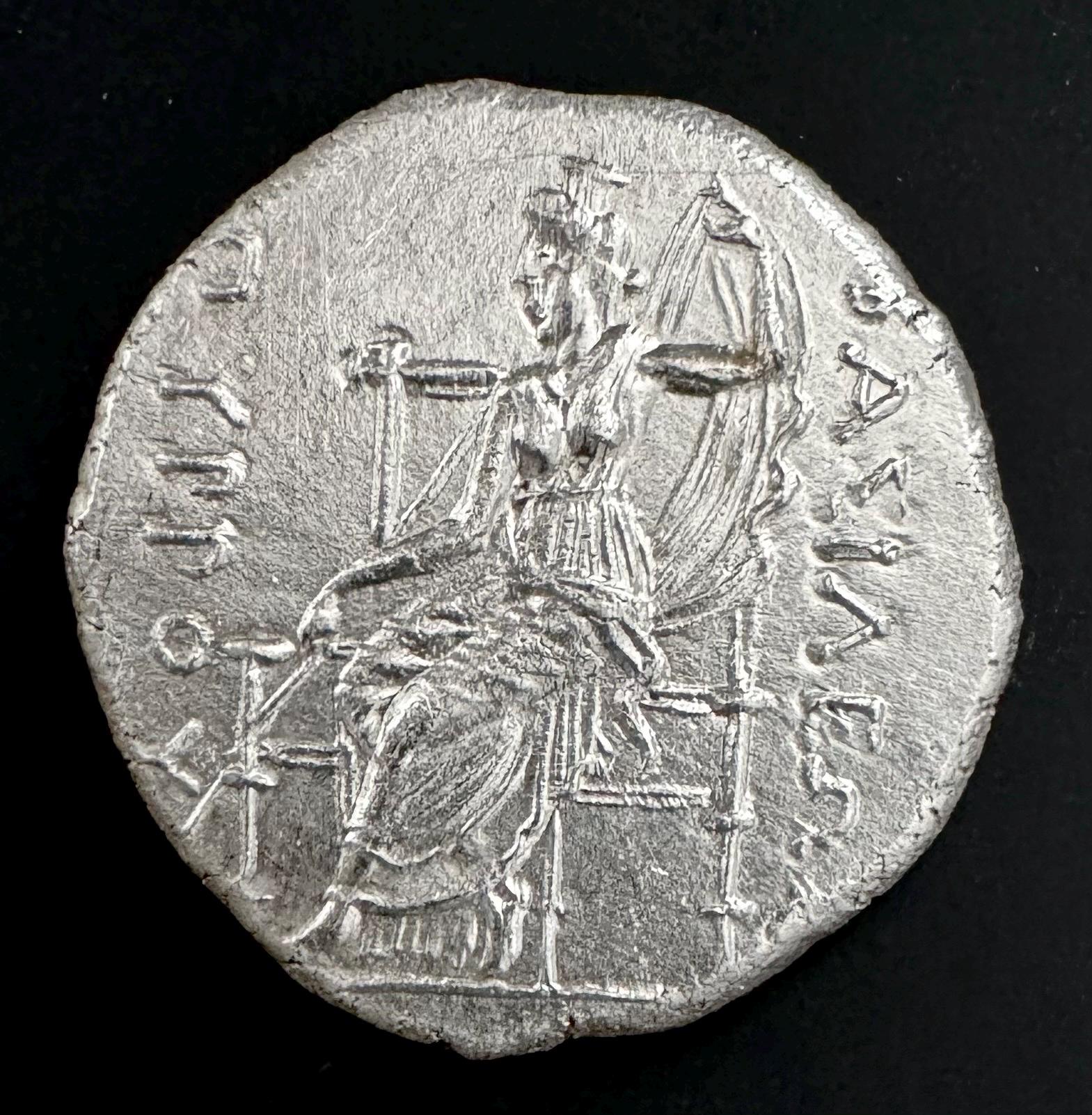 Reverse side: Dione seated left, holding staff in right hand and lifting her veil with her left