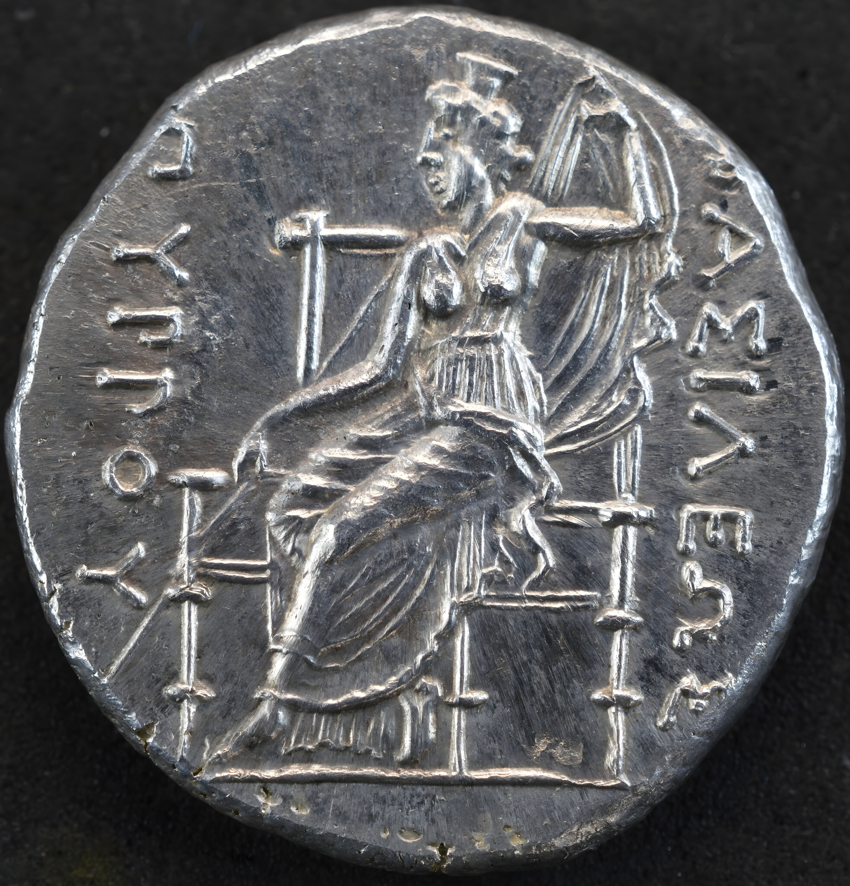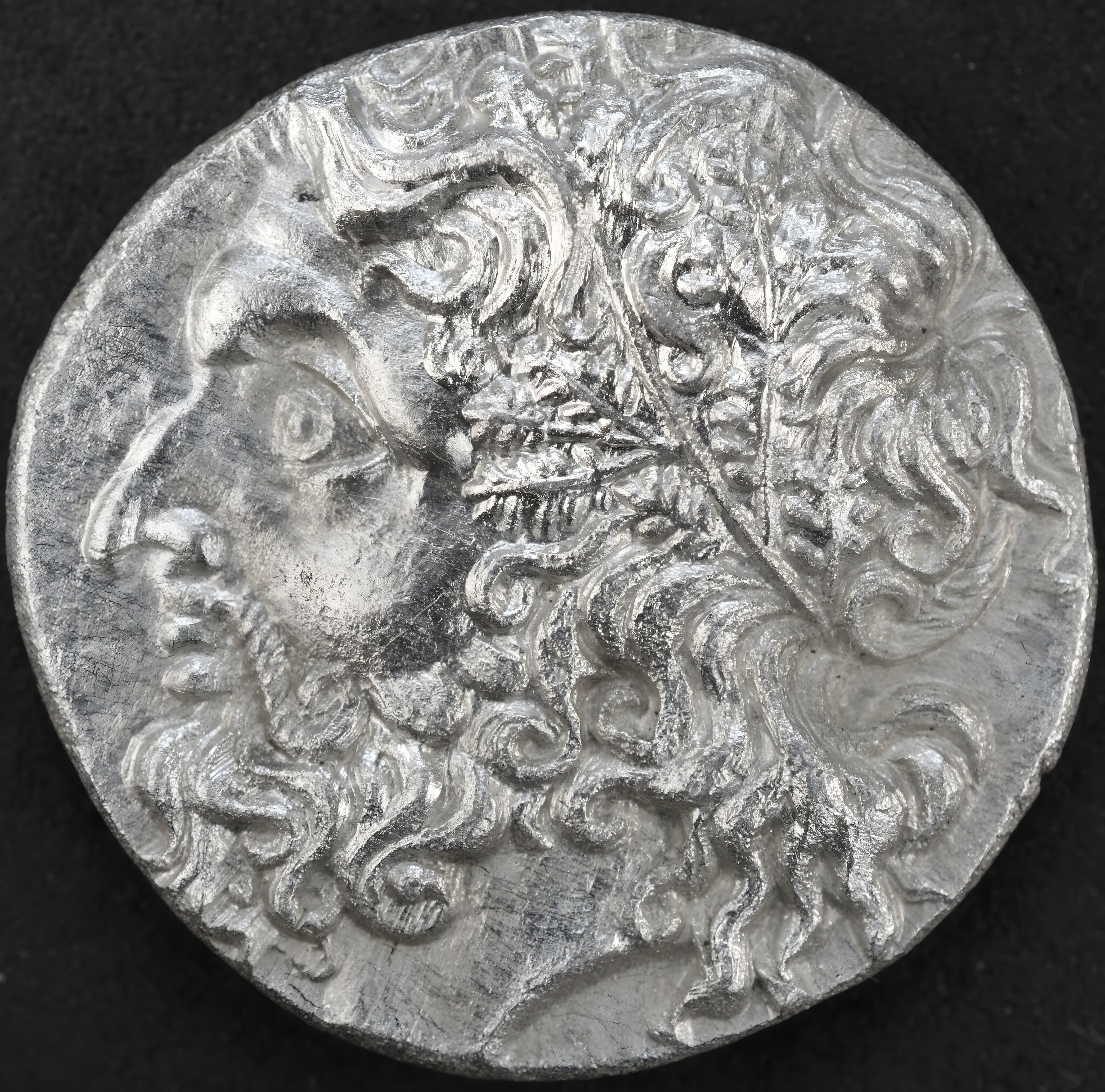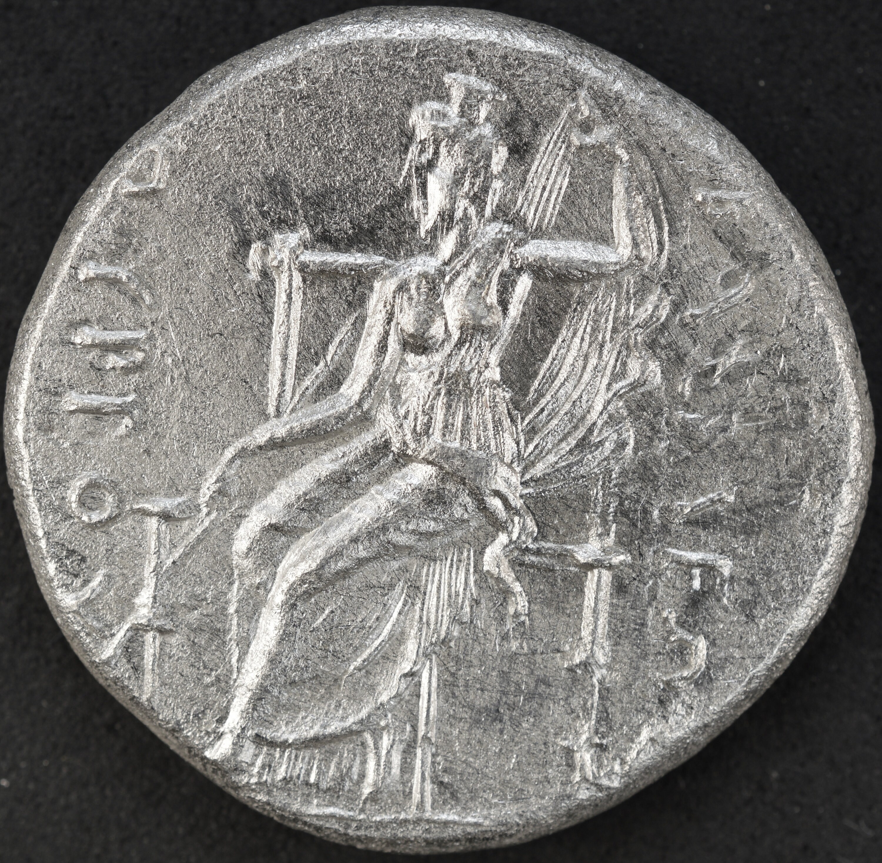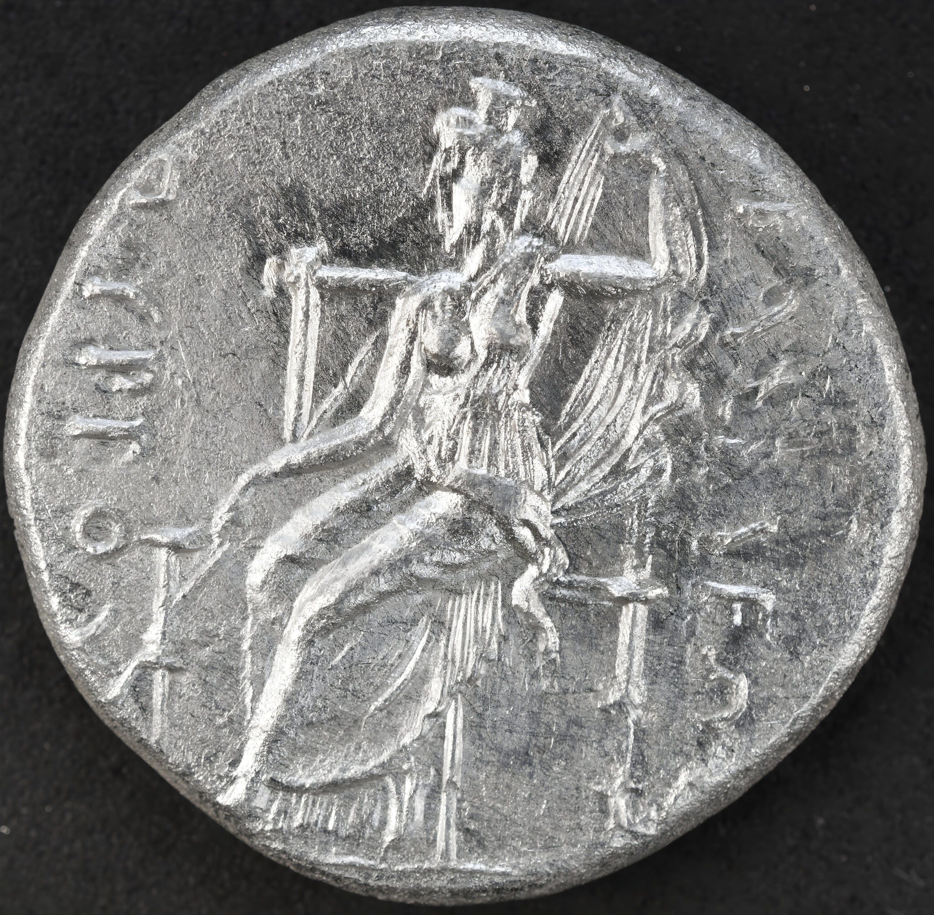 Although the increasingly powerful Romans had been extending their influence into Magna Graecia for years, in 282 BC, they installed garrisons in the cities of Thurii, Locri and Rhegium. Fearing that Tarentum would be next, in 281 BC the Tarentines asked for military aid from mainland Greece. Pyrrhos, the king of Epeiros in northwestern Greece, heeded the call and began assembling a great army that arrived in southern Italy the following year. His force of 20,000 infantry, 3000 cavalry and 20 war elephants were an impressive sight and with it he was able to defeat the Romans and their allies at the Battle of Heraclea in 280 BC although many of his best troops were killed in the fighting. Thanks to this success, the Roman garrison was expelled from Locri and the Locrians joined Pyrrhos in opposition to Rome. Although Pyrrhos offered peace terms to the Romans, these were refused, and the Pyrrhic War continued in Italy. In 279 BC, Pyrrhos faced the Romans again at the Battle of Asculum. This was also a defeat for the Romans, but it cost Pyrrhos so many of his experienced officers that he famously quipped, „If we are victorious in one more battle with the Romans, we shall be utterly ruined." Unsure of how best to proceed in the aftermath of this first pyrrhic victory, Pyrrhos then decided to answer a request from Syracuse to aid in driving the Carthaginians out of Sicily in the hopes of carving out a Sicilian kingdom for himself and tapping the wealth of the island for renewing the war against the Romans in Italy. During his Sicilian adventure, which lasted from 278 to 275 BC, Pyrrhos installed garrisons in many of the cities of Magna Graecia in order to hold them against the Romans during his absence. Locri was one of the cities to receive a garrison. Unfortunately, as Pyrrhos' absence in Sicily dragged on, the garrison at Locri became unruly and began to abuse its Locrian hosts. This behaviour went on for some time until the Locrians finally had enough and expelled the garrison in a popular uprising. When Pyrrhos finally returned in 275 BC and learned what had happened, he was furious and punished the city by imposing a heavy payment of tribute and by plundering the wealth of the Locrian temple of Persephone. The present coin is believed to have been struck at Locri to pay the tribute to Pyrrhos on this occasion and may perhaps even have been produced from silver stored in the temple. Unlike many other coinages of Magna Graecia and Sicily associated with financing the wars of Pyrrhos, the Locrian series has a strongly Epeirote character. The obverse depicts Zeus Naios, the chief deity of the oracular shrine at Dodona in Epeiros, while the reverse features Dione, the god's consort. The issue also explicitly names King Pyrrhos as the issuing authority. After an inconclusive battle with the Romans at Beneventum in 275 BC, it was clear that Pyrrhos had worn out his welcome in Magna Graecia and the king decided to return to Epeiros laden with the wealth of Locri. Unfortunately, on the return voyage storms destroyed many of his ships. It was determined that this great misfortune was caused by the wrath of the gods who were punishing him for the impiety of plundering the temple of Persephone. In an effort to set things right and prevent further misfortune, Pyrrhos subsequently returned what he had carried off from Locri.