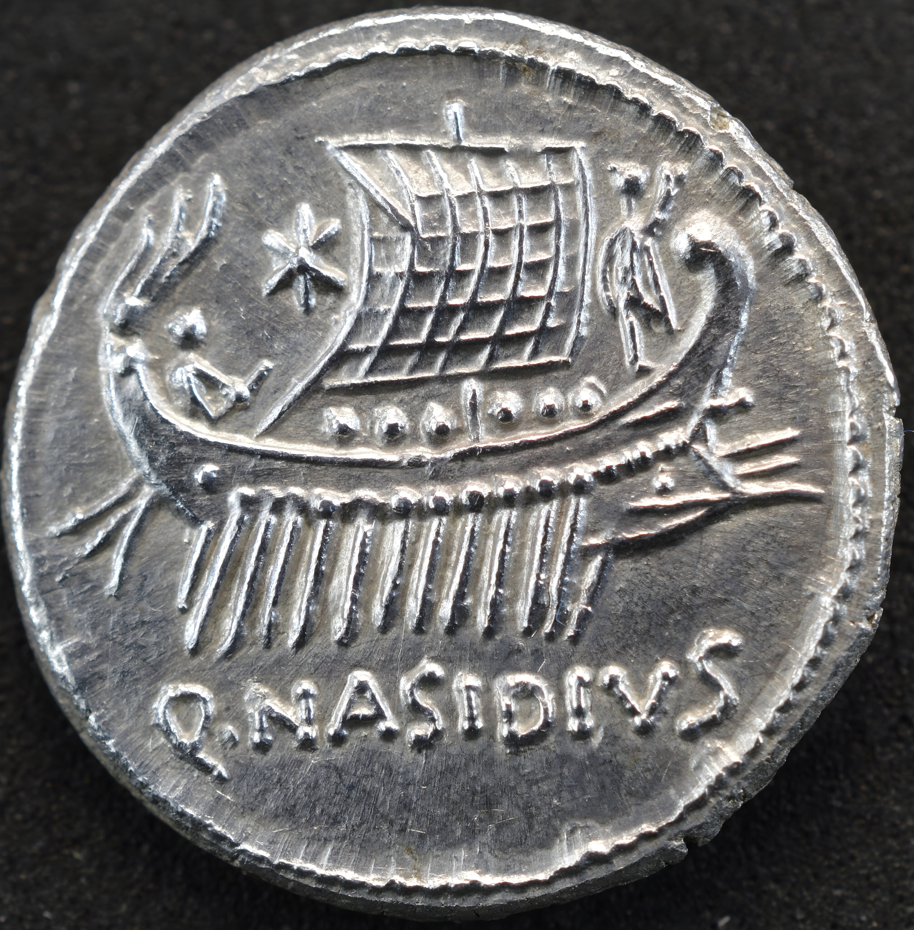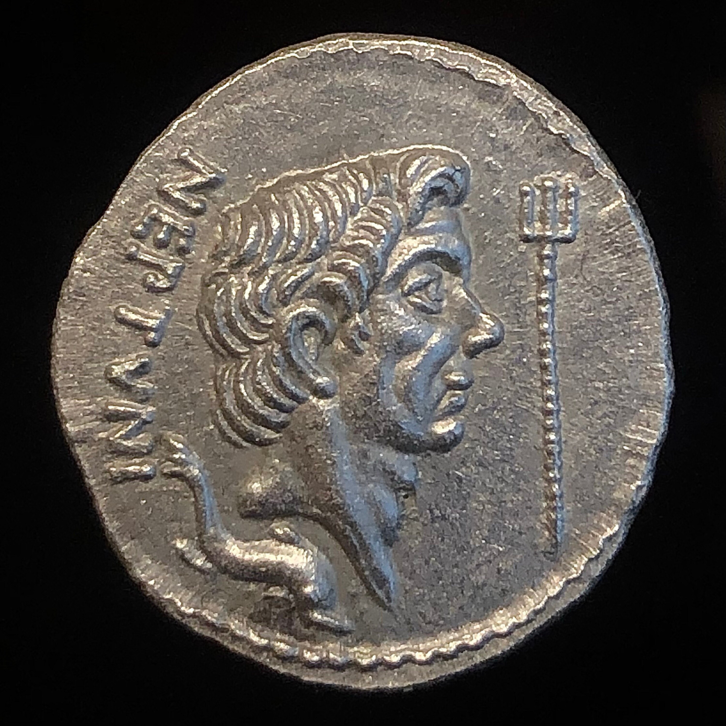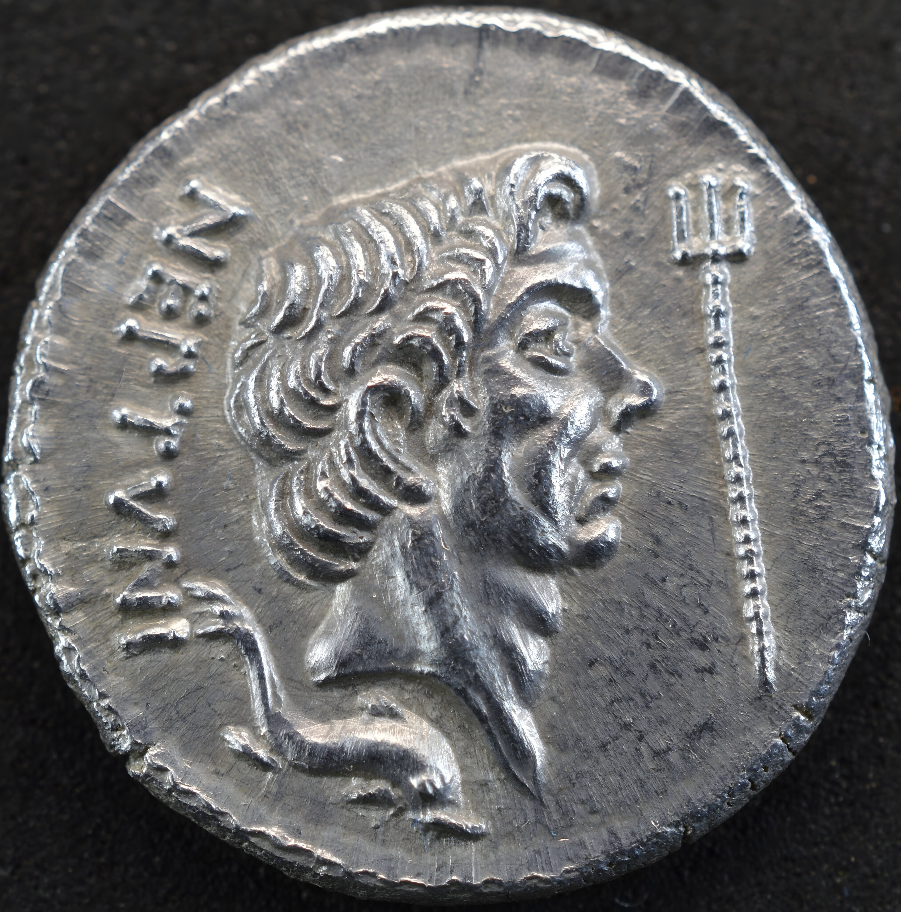 Sextus Pompey, the son of Pompey the Great, as an active player during the civil war (45-35 BC) minted several issues (RRC 477, 478, 479, 483, 511). He used them not only to pay his troops and followers but also to promote himself. To do that he started to propagate his exeptional piety – pietas. At first, he was doing that by emphasizing his devotion to his famous father (pietas erga patrem). On this coin you can see him portraying his father as Neptune. Then, he introduced also other meanings of pietas – adversus deos and erga patriam. Sextus promoted the concept in many various ways – using monetary legends, symbols, personifications and allegories. Such a consistency in his propaganda was very unusual for the previous Republican coinage. Thus, it was a key step toward the monetary propaganda we know from the later, imperial coinage.