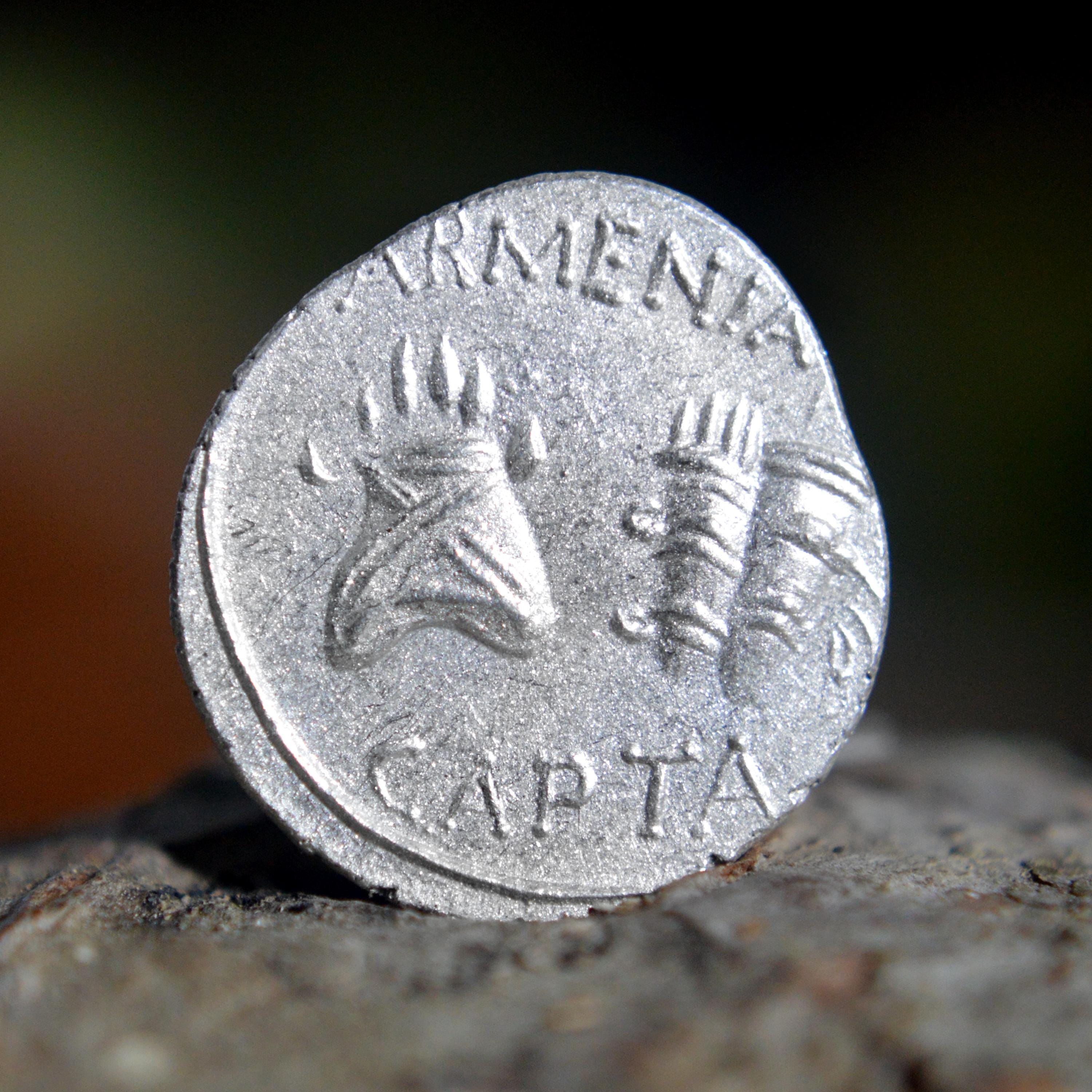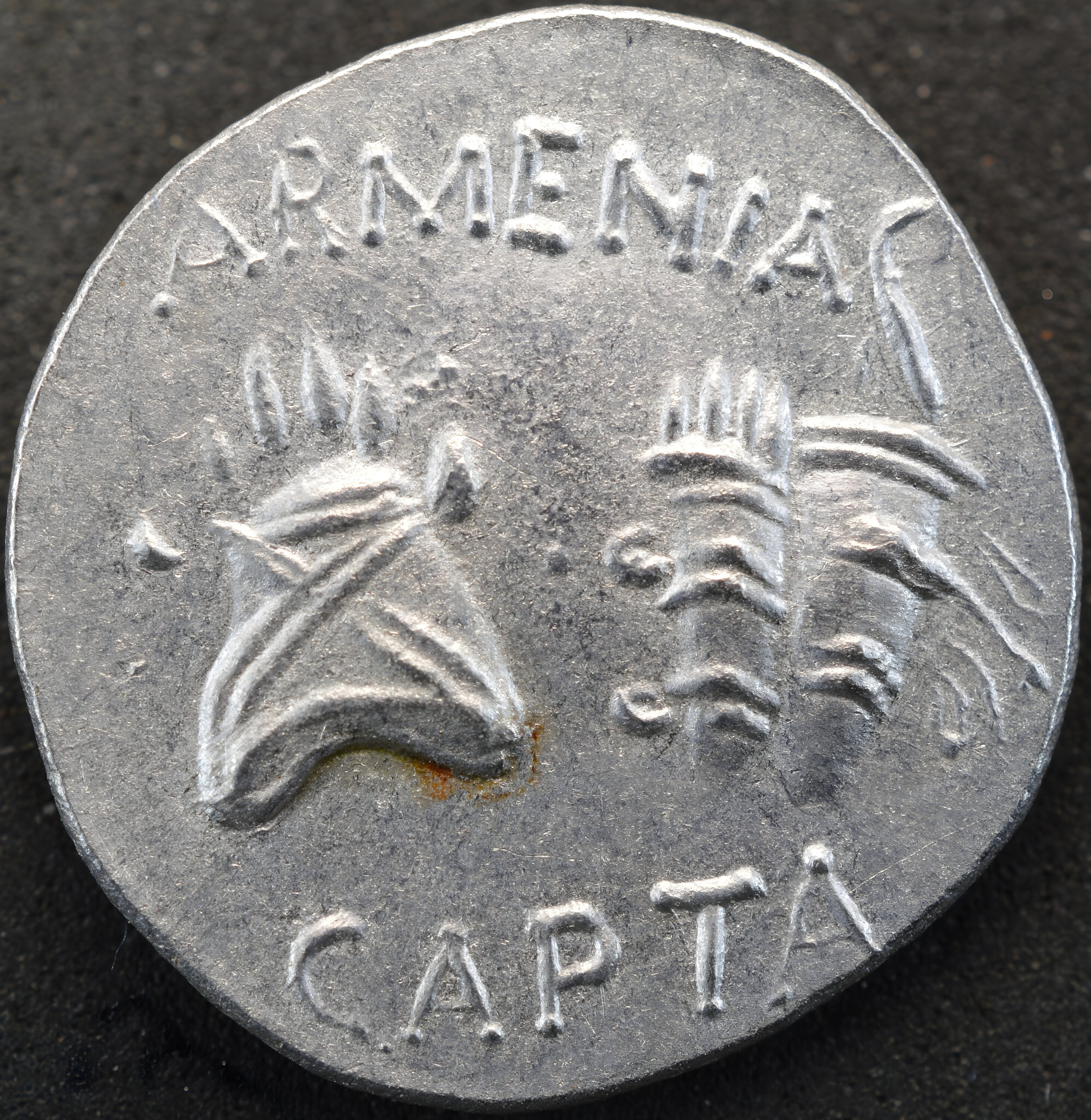 The silver denarius inscribed ARMENIA CAPTA combines symbols associated with the region: the distinctive tall “tiara” crown worn by Armenian kings, and a bow case and quiver (Armenian cavalry were famed for their skill in archery).