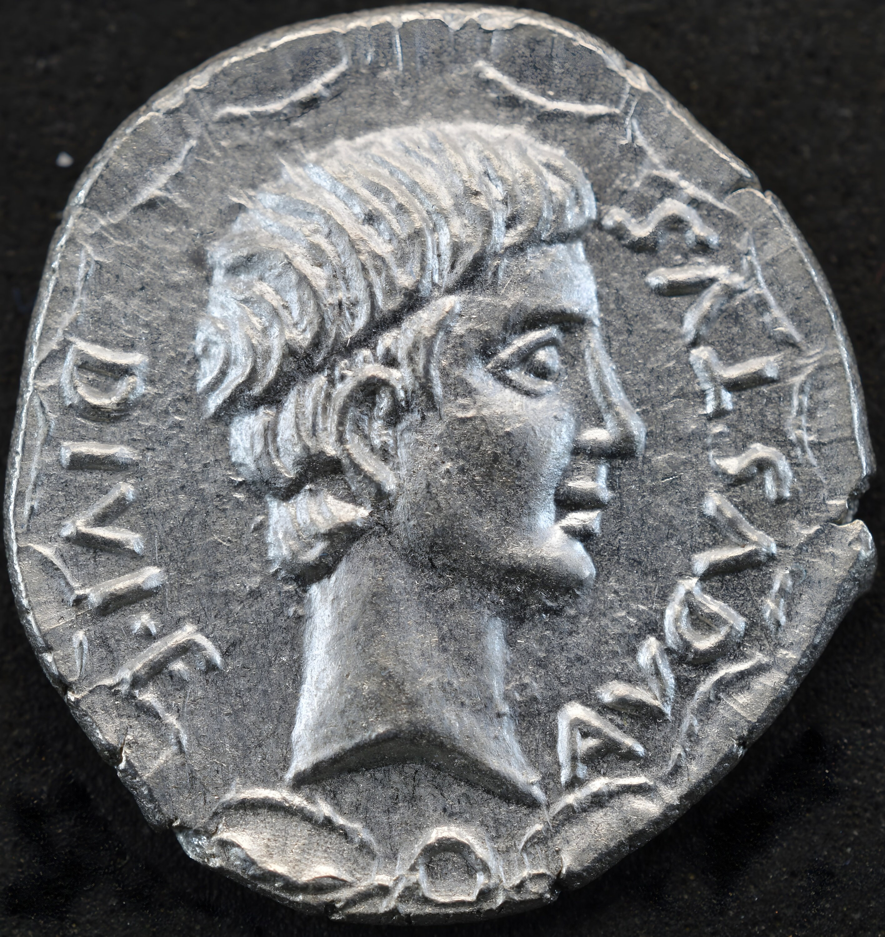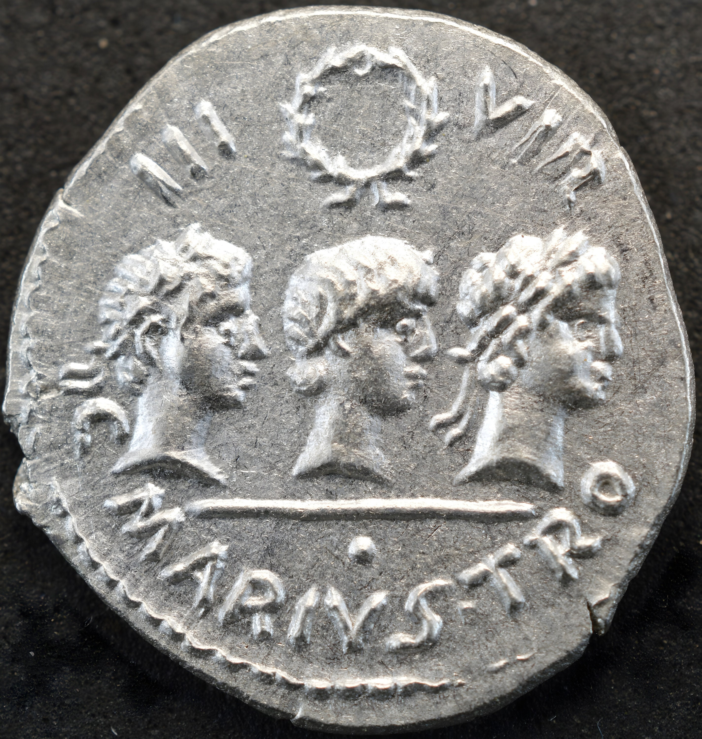 The entire process of appointing a successor a delicate one, and one of our first indications of an official statement of dynastic ideology can be found in a series of coins issued at Rome in 13 BC. This was the year the tribunician power of Augustus and Agrippa was renewed, and Agrippa is shown on the coinage as Augustus’ colleague (just as he is later named as a colleague in the Res Gestae Divi Augusti 8.2). Coins show Augustus and Agrippa side-by-side. Other issues of this year display the head of Augustus on one side, and the head of Agrippa on the other. On the silver denarius issue of this type, both Augustus and Agrippa are bare-headed, while on the gold aureus issue Augustus wears an oak-crown (an honour granted him by the Senate) and Agrippa a combined mural and rostral crown, which combined the walls of a city and the prow of a ship (RIC 12 409). Silver denarii were also struck showing Julia and her two sons: the obverse carries the portrait of Augustus, and the reverse displays the bust of Julia with a wreath above it, flanked by the busts of her sons.