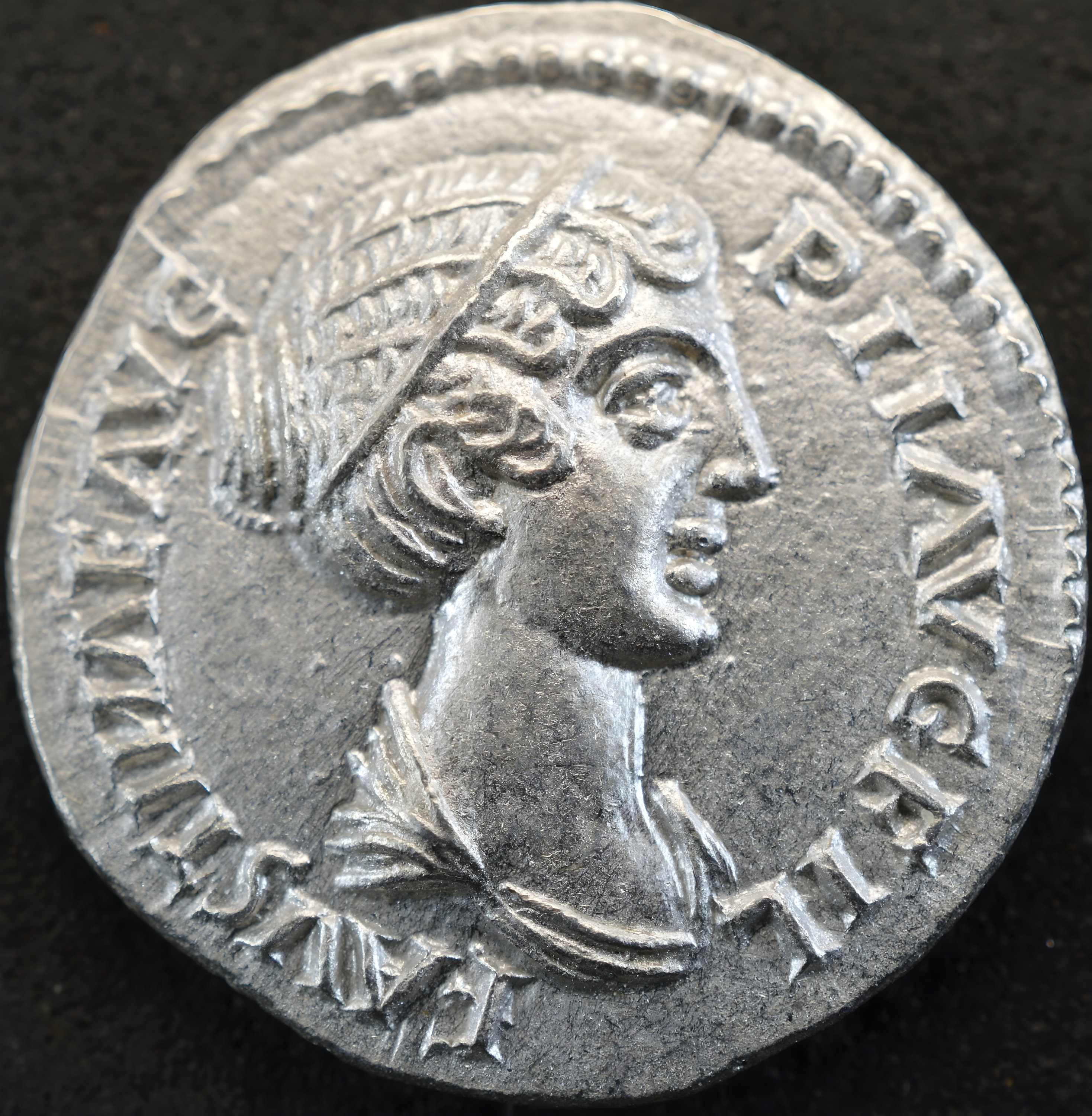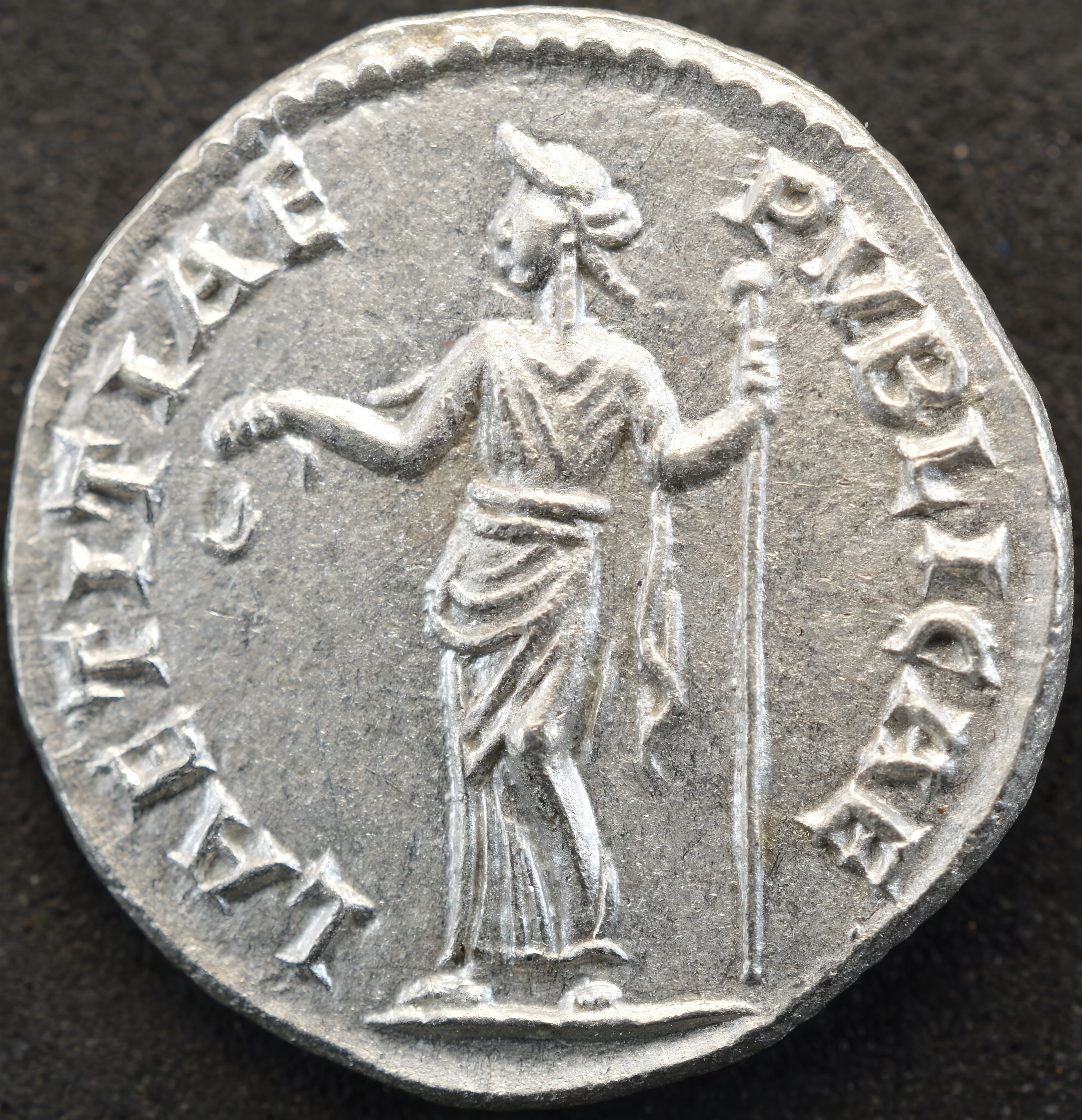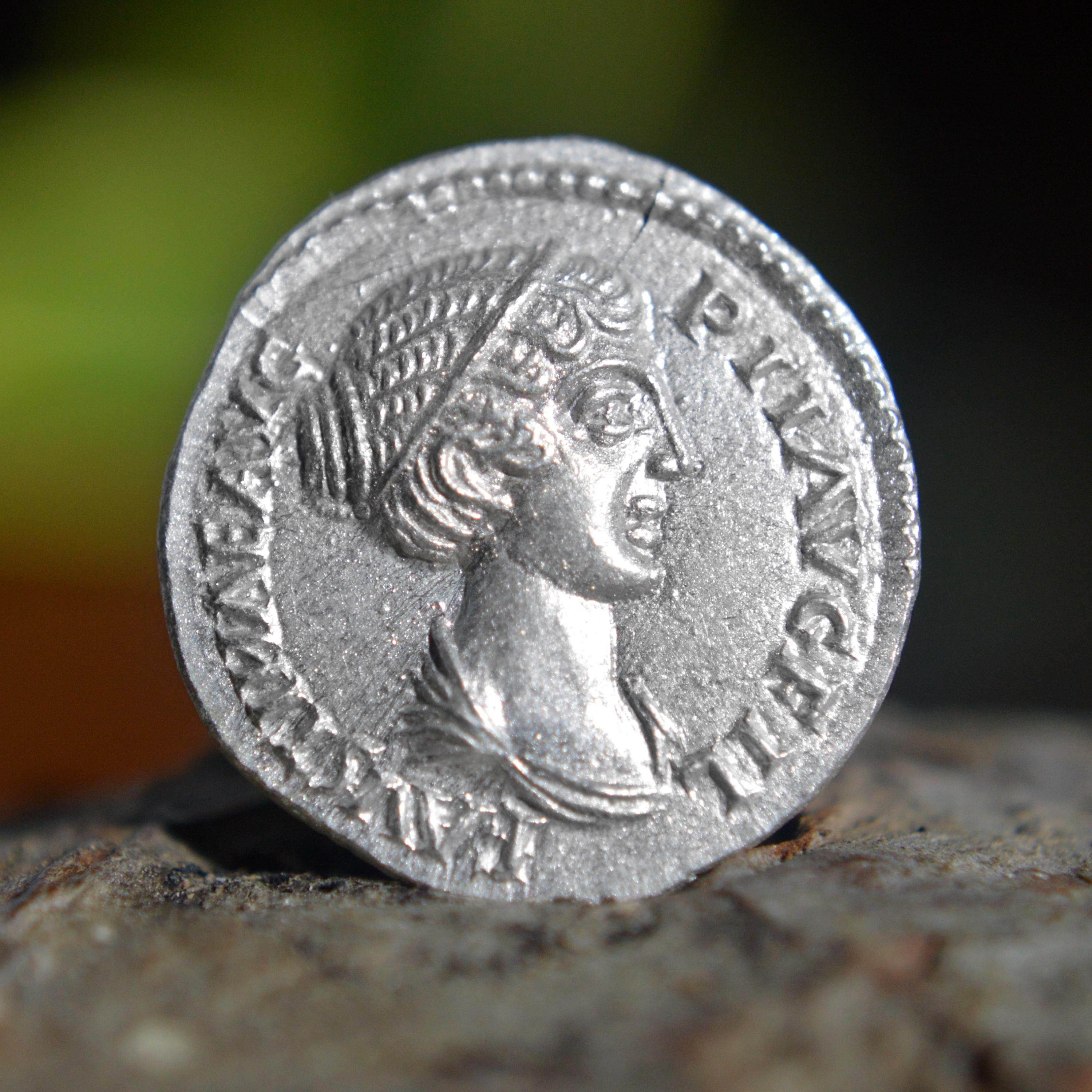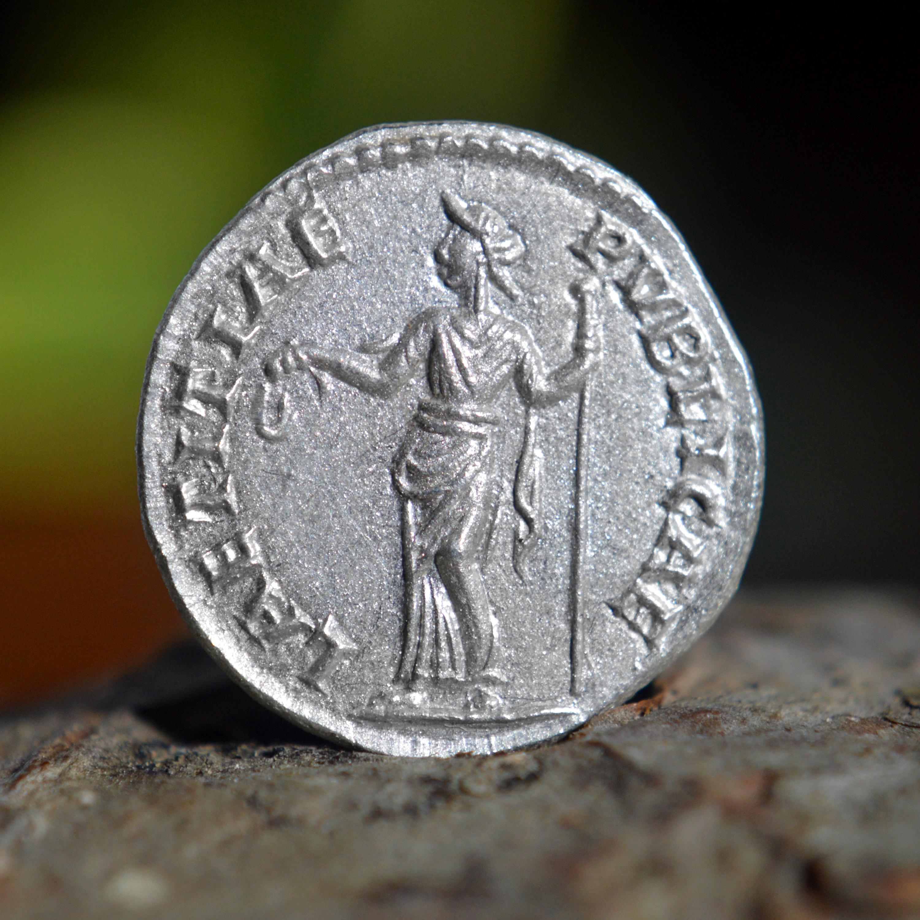 Silver Roman Denarius of Faustina II Junior, wife of Marcus Aurelius, minted under her father Antoninus Pius Solid Laetitia Silver Coin