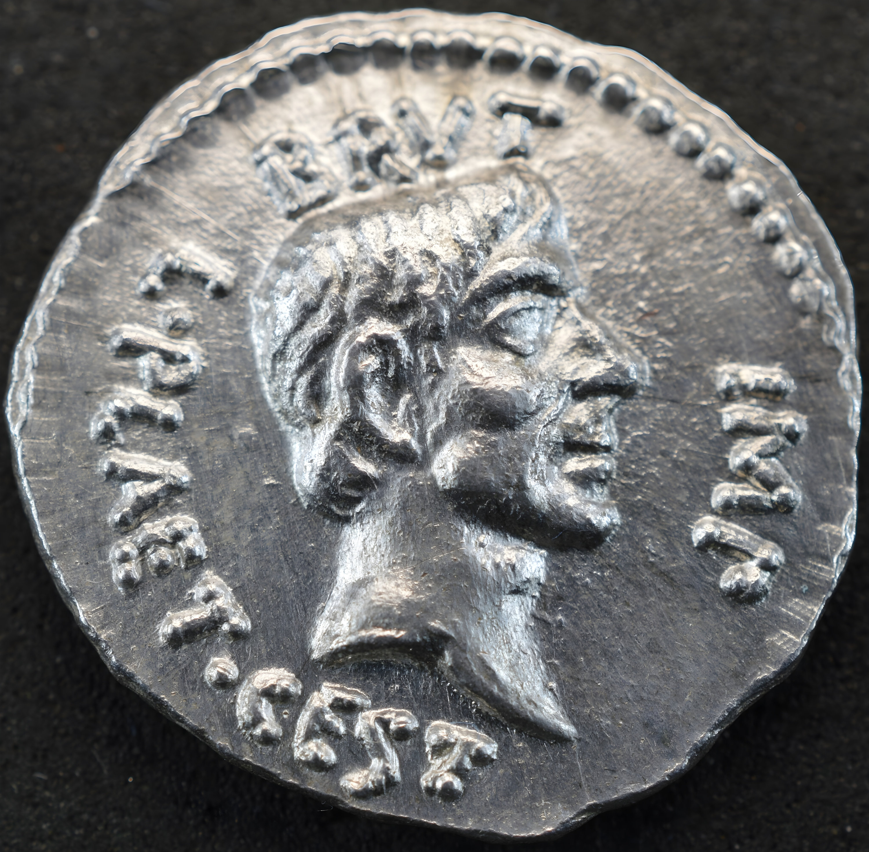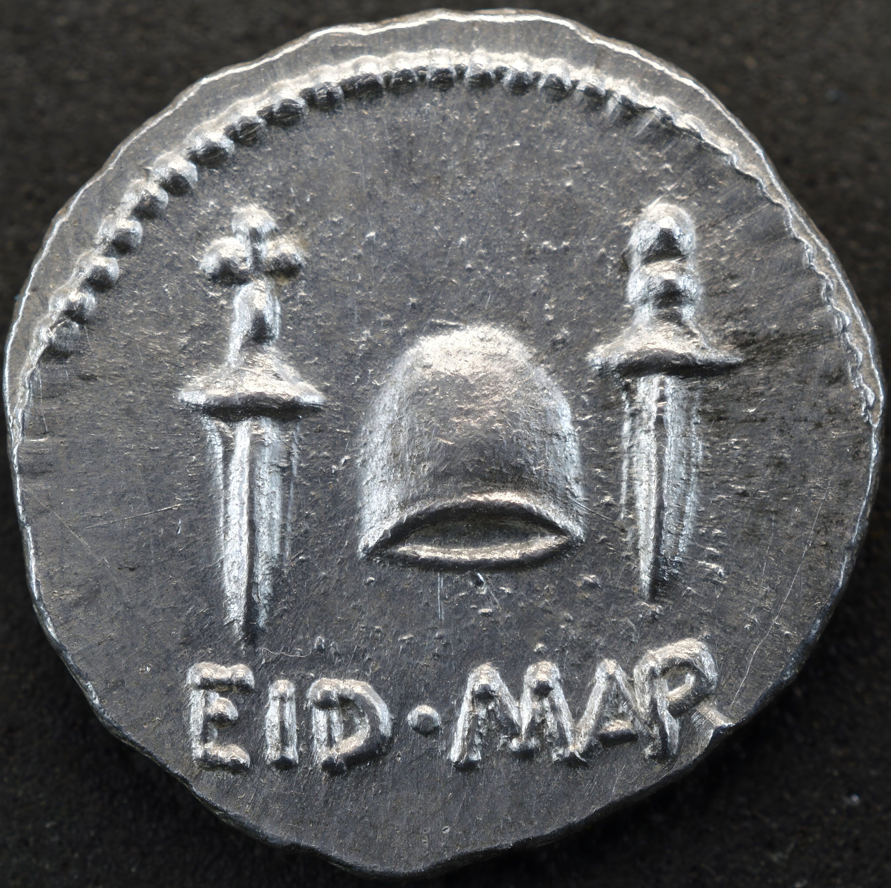 This extraordinary type is one of the few specific coin issues mentioned by a classical author, Dio Cassius, Roman History 47. 25, 3: “Brutus stamped upon the coins which were being minted his own likeness and a cap and two daggers, indicating by this and by the inscription that he and Cassius had liberated the fatherland.” The only securely identified portraits of Brutus occur on coins inscribed with his name; all others, whether on coins or other artifacts, are identified based on the three issues inscribed BRVTVS IMP (on aurei) or BRVT IMP (on denarii). A careful study of Brutus’ portraits by S. Nodelman segregates these inscribed portraits into three main categories: a ‘baroque’ style portrait on the aurei of Casca, a ‘neoclassical’ style on the aurei of Costa, and a ‘realistic’ style on the ‘EID MAR’ denarii, which Nodelman describes as “the soberest and most precise” of all.