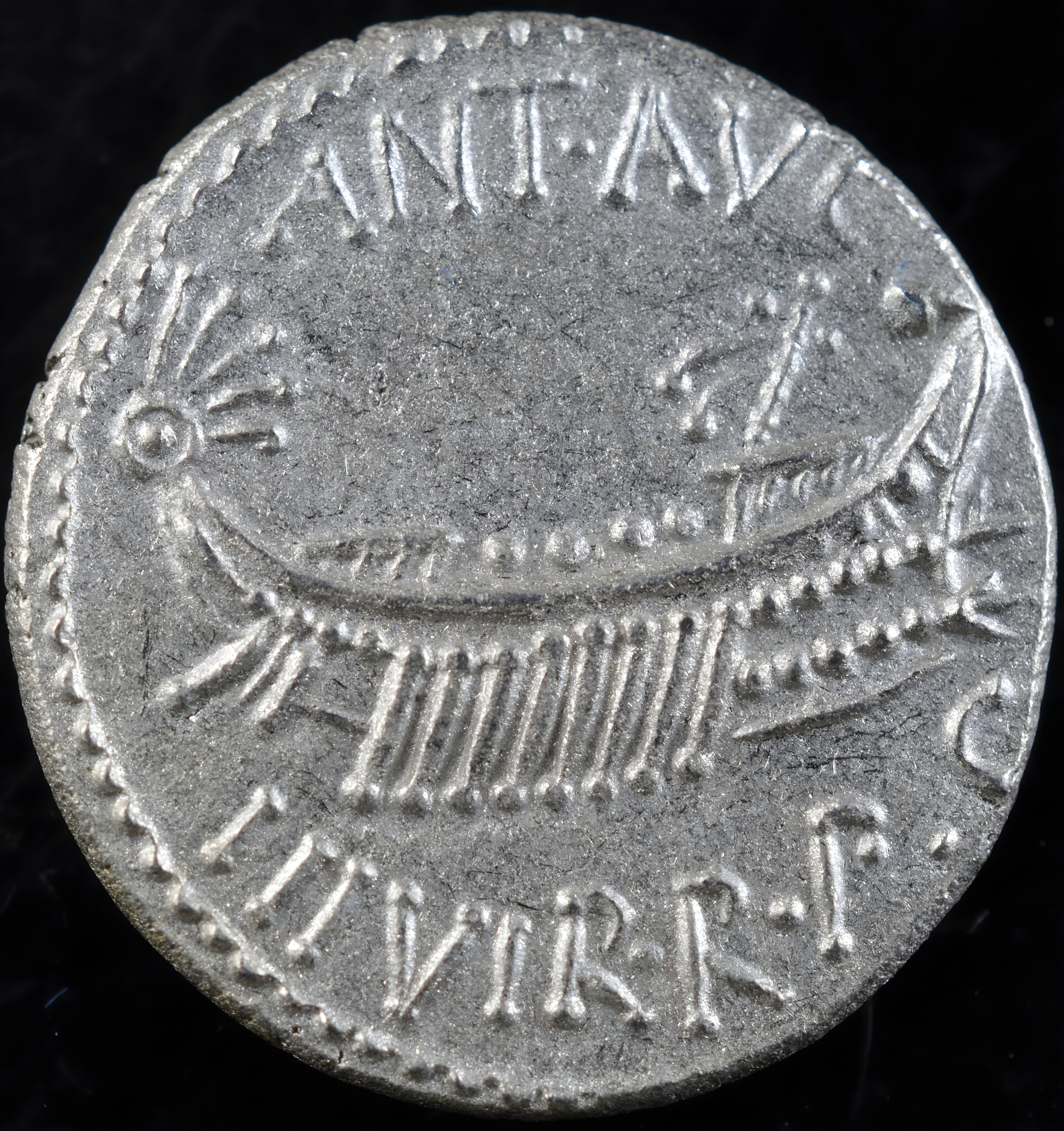 Issued before the Battle of Actium in 32 BC and likely minted at Antony’s winter headquarters in Patrae (Greece), it was silver denarii such as this that Mark Antony used to pay his legions and fleet. Seeking to associate himself with Julius Caesar, who had held the augurate, Antony too identified himself as augur; so one reads ANT AVG (abbreviating Antonius augurus); III VIR R P C abbreviates Triumvir rei publicae constituendae (“One of Three Men for the Restoration of the Republic”), which was adopted in 43 BC by Mark Antony, Octavian, and Lepidus when they formed the Second Triumvirate.