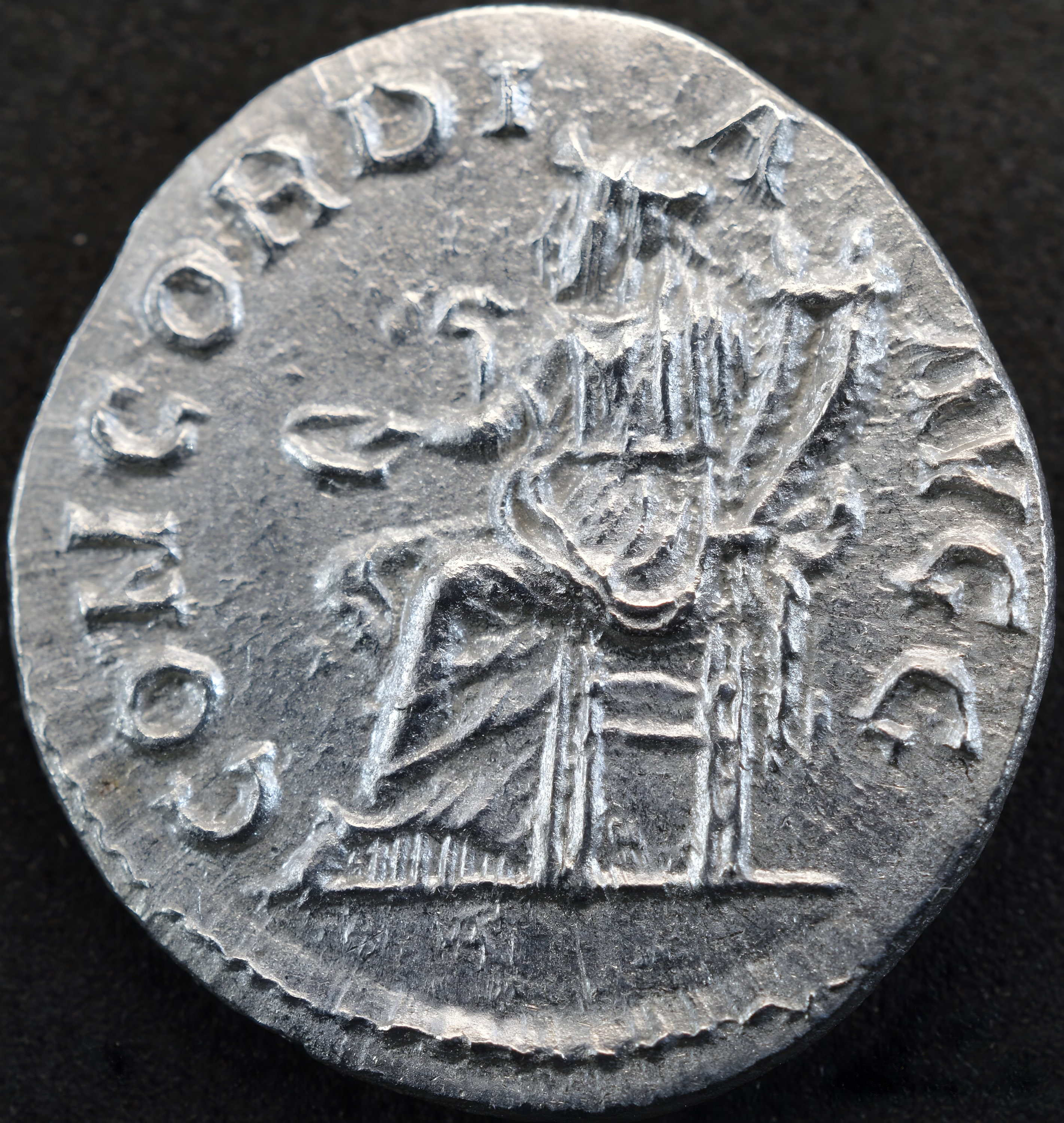 Reverse side: Concordia seated left on throne, holding patera & double cornucopiae