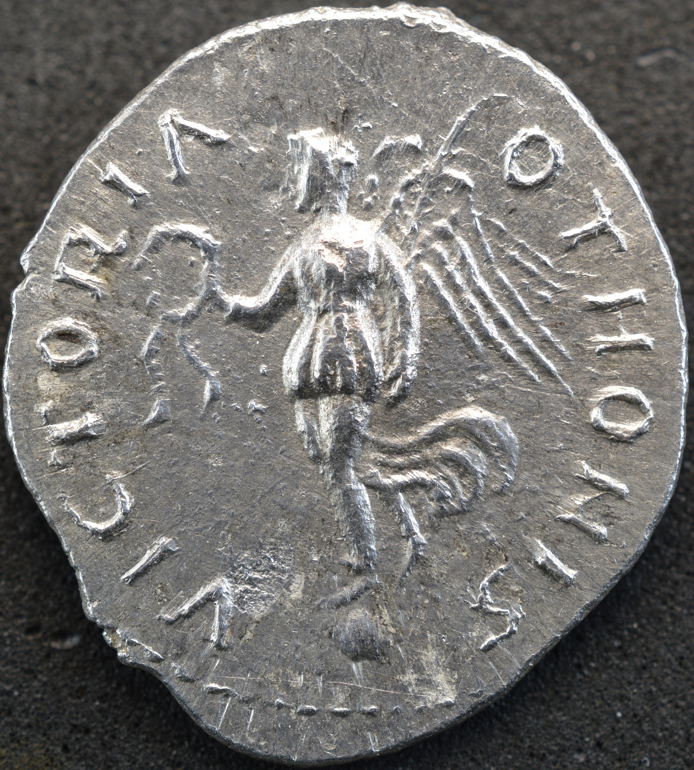 If Galba’s rise to power was a shocking novelty because he was the first emperor to be hailed by legions outside of Rome, the stakes were raised by his successor Otho, who was the first emperor to openly attain his office through the murder of his predecessor. Galba’s last moments were filled with terror, and, as Suetonius (Galba, 20) reports, his corpse was callously defiled: “Galba was murdered beside the Curian pool, and left lying just as he fell. A private soldier returning from the grain issue set down his load and decapitated Galba’s body. He could not carry the head by the hair – for there was none – but stuffed it in his cloak; and presently brought it to Otho with his thumb thrust into the mouth. Otho handed the trophy to a crowd of servants and camp-boys, who stuck it on a spear and carried it scornfully round the camp…” Such was the environment in which Otho took control – a disturbing state of affairs that seemed like it could not persist, yet would get worse for the next eleven months until soldiers loyal to Vespasian entered Rome on December 20, 69 and restored some semblance of order. Otho’s coinage is unique among his contemporaries, for he struck only at the mint in Rome, produced no imperial bronzes, nor any reverse types of direct historical value. The other emperors of the civil war – Galba, Vitellius and Vespasian – all had a variety of interesting reverse types, struck a full range of imperial bronzes, and produced many of their imperial coins at mints in the provinces. With this in mind we can see how this superb denarius distinguishes itself from the mass of Otho’s coinage: not only does it have an unusually sensitive and dignified portrait, but it employs his only interesting reverse type, with which he attempts to curry optimism among his soldiers despite the long odds they faced in the upcoming contest with Vitellius.