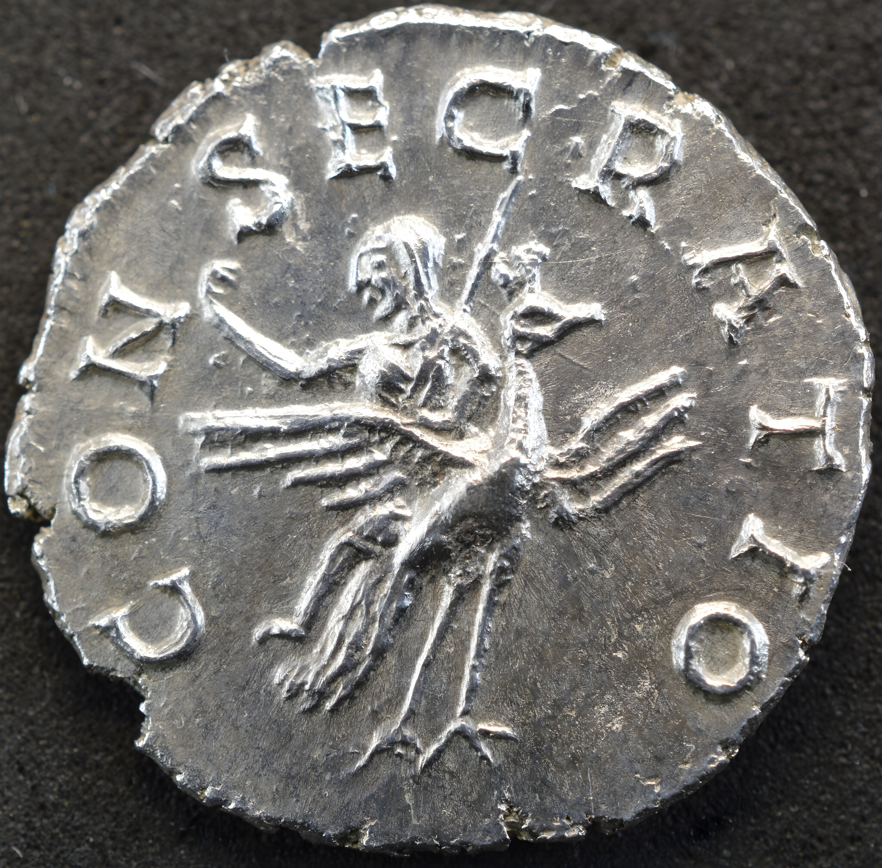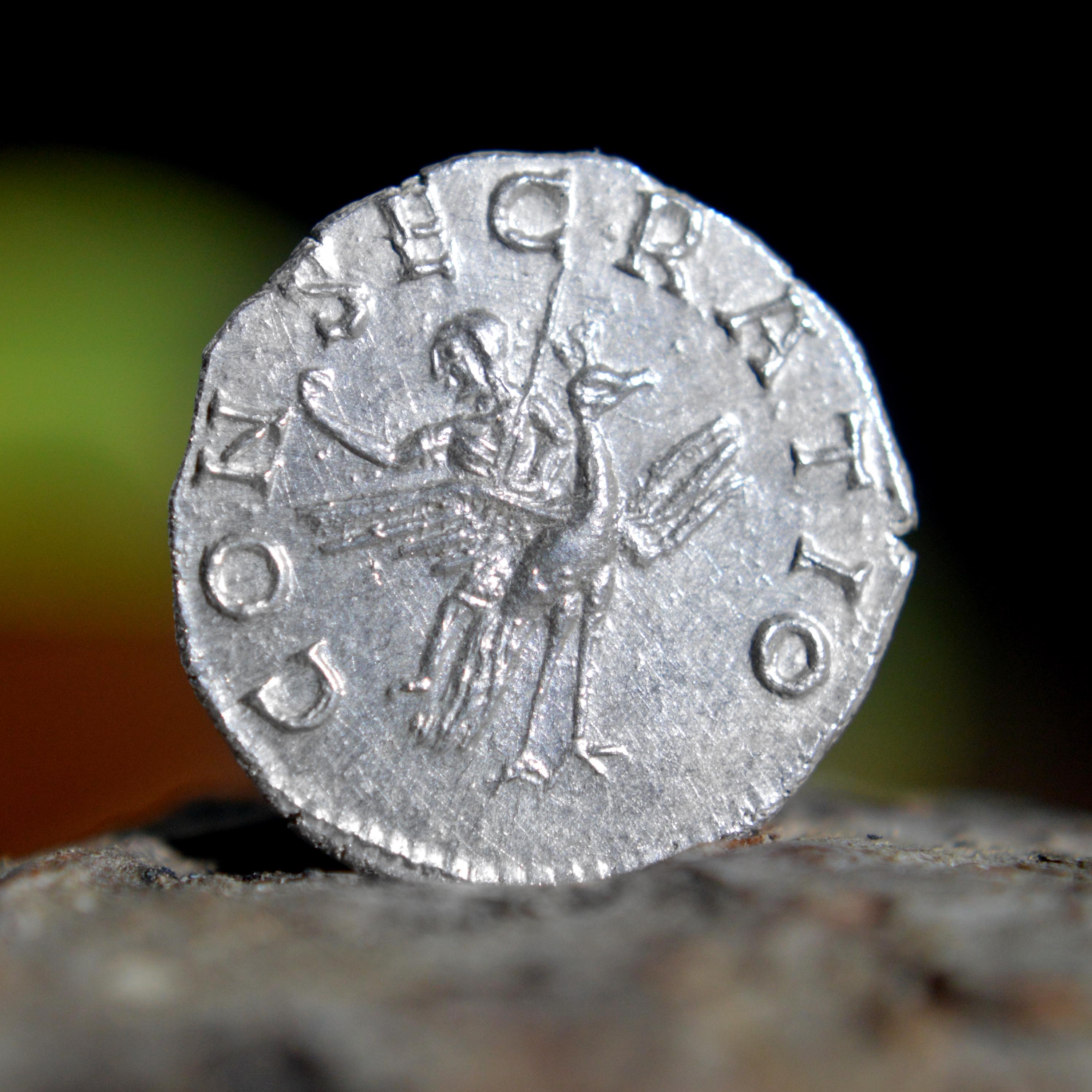 Diva Paulina Augusta, was the “most nobil” mother of Gaius Julius Verus Maximus, who had been appointed Caesar (in 236) by his Imperial father, emperor Maximinus. The coinage for Paulina, all of it posthumous “consecration” issues, consisted of a single aureus, and small numbers of denarii and sestertii. The silver occurs with two CONSECRATIO reverse types: one with Juno’s peacock standing facing with tail fully spread; the other with Paulina seated waving on the back of a peacock which is flying.