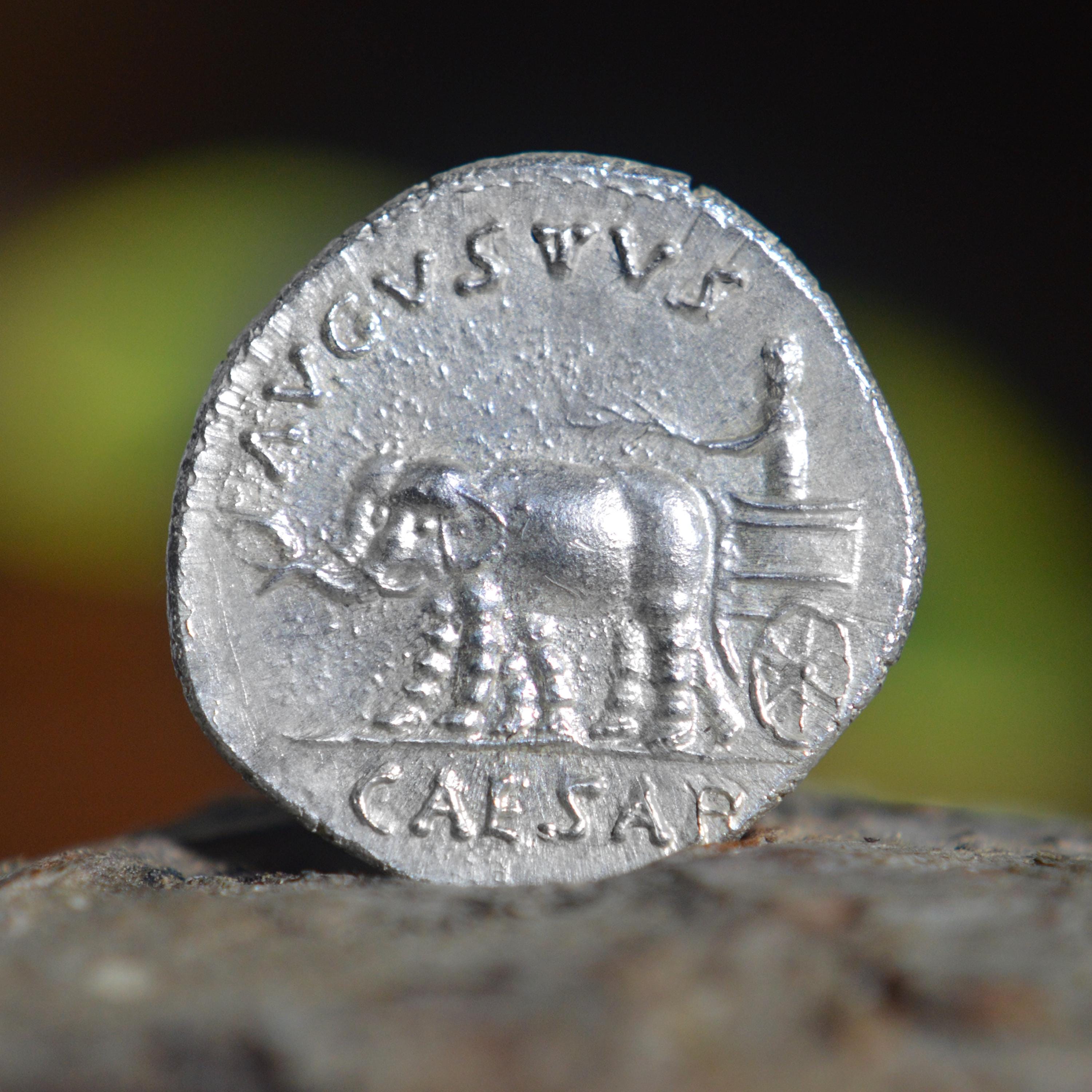 Reverse side: Augustus standing in biga of elephants, left, holding laurel branch in right hand and sceptre in left