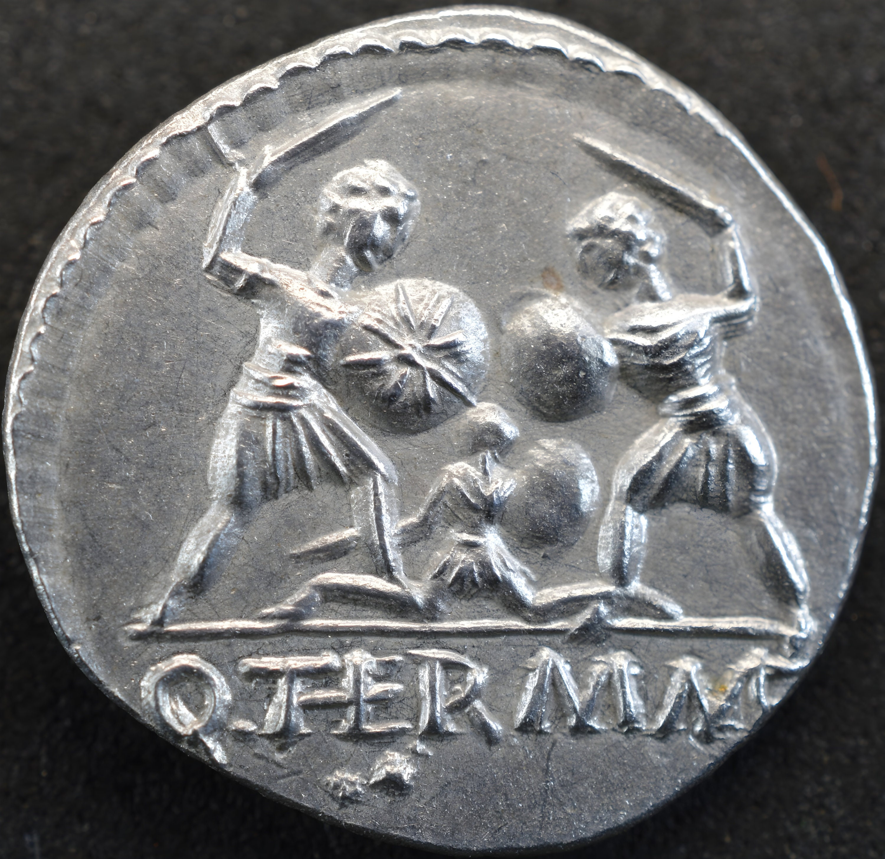 Reverse side: Roman soldier fighting barbarian soldier in protection of fallen comrade