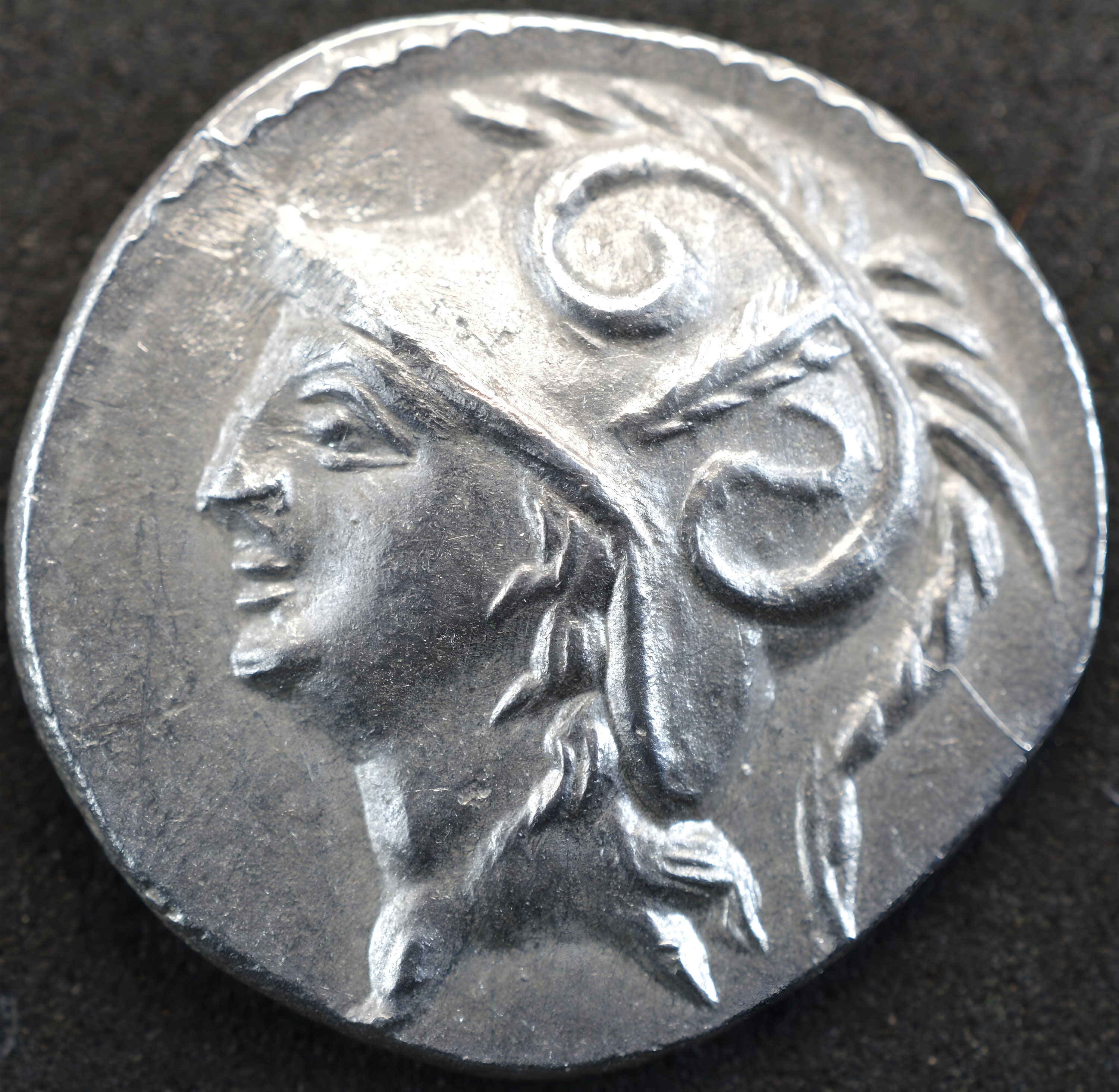 Obverse side: Helmeted head of young Mars left, ornamented with plume and annulet