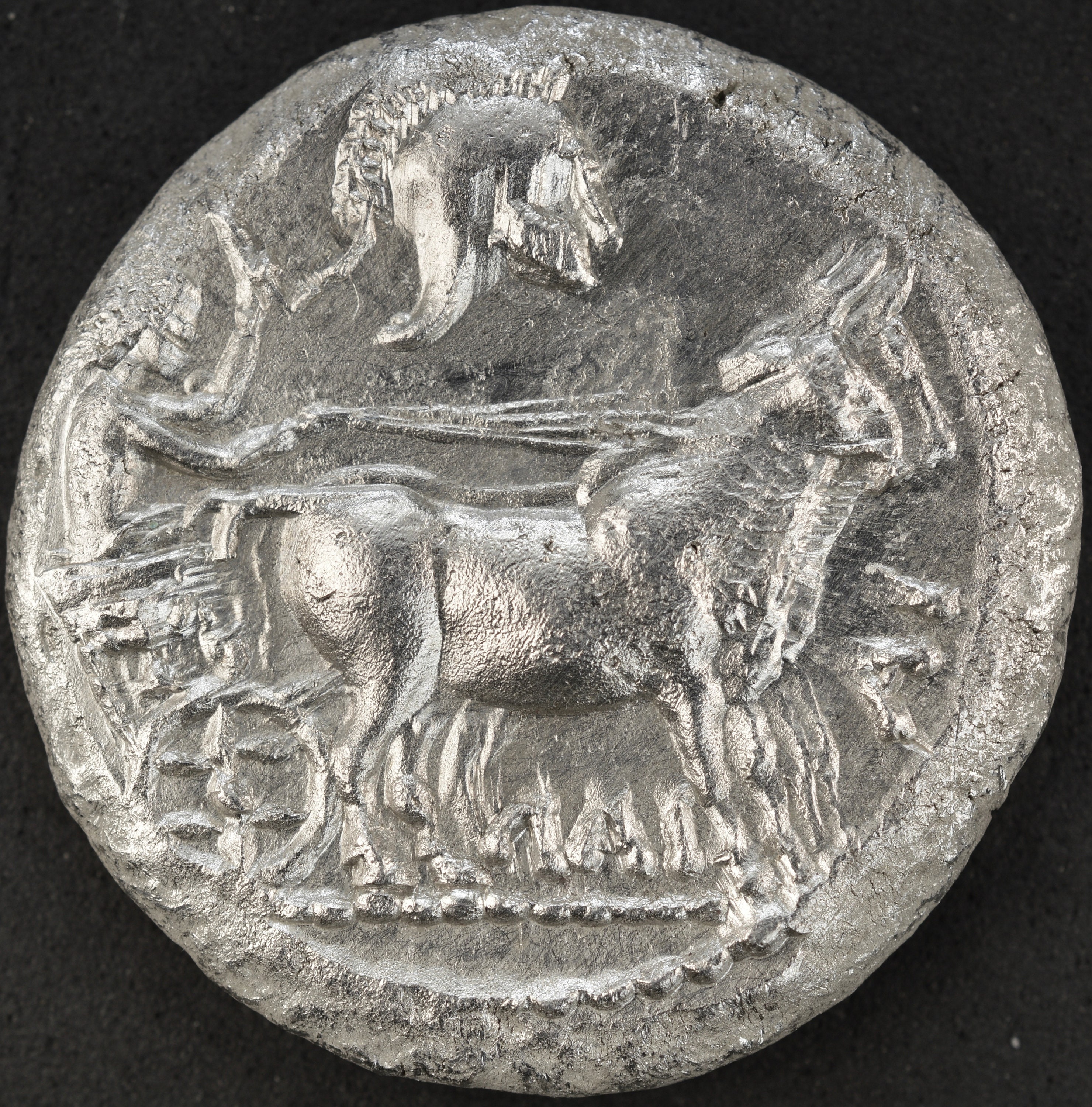 Obverse side: Male figure, wearing kausia and light robes, driving an ox cart to right, holding goad in his right hand. Above, crested Corinthian helmet