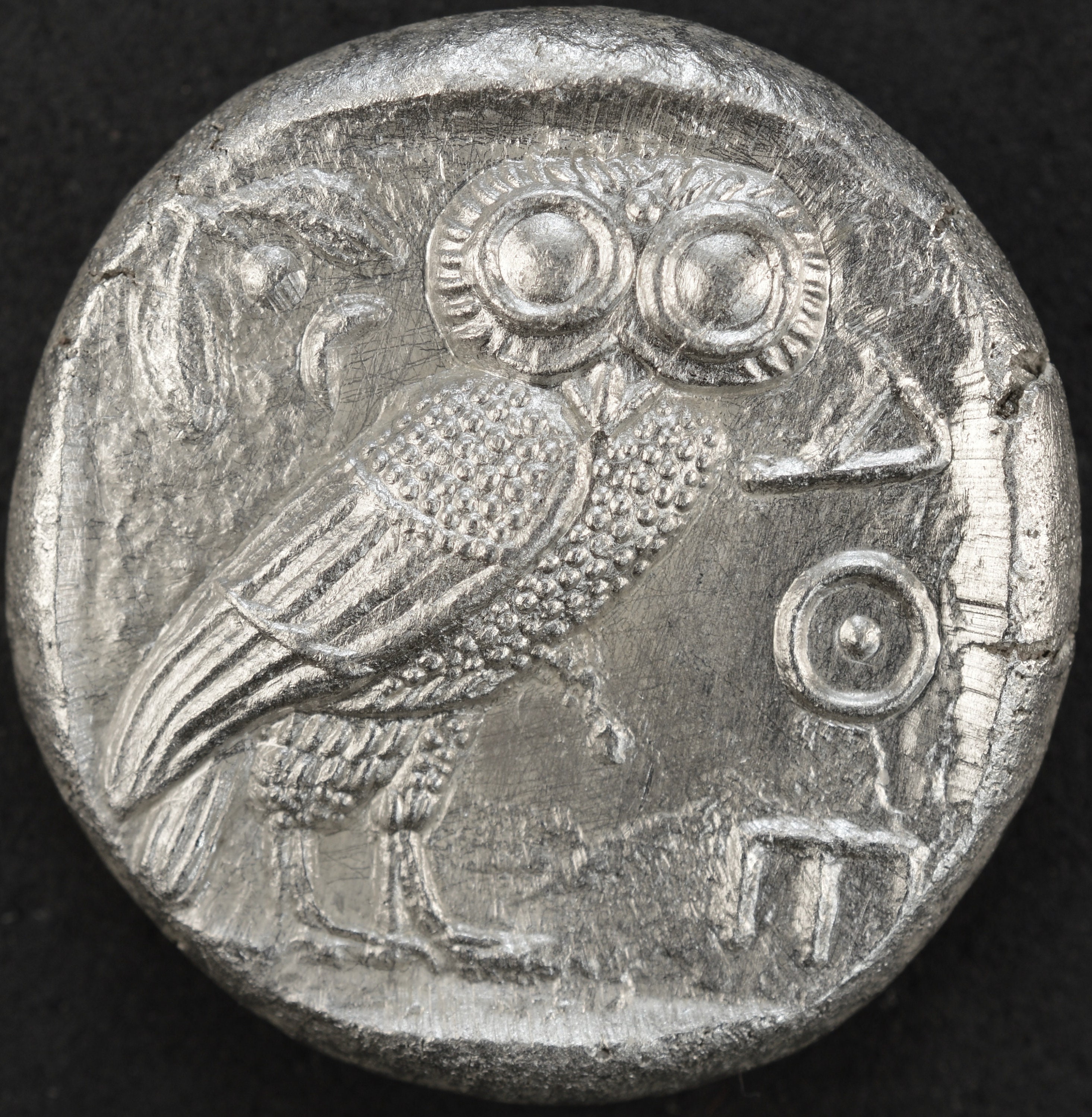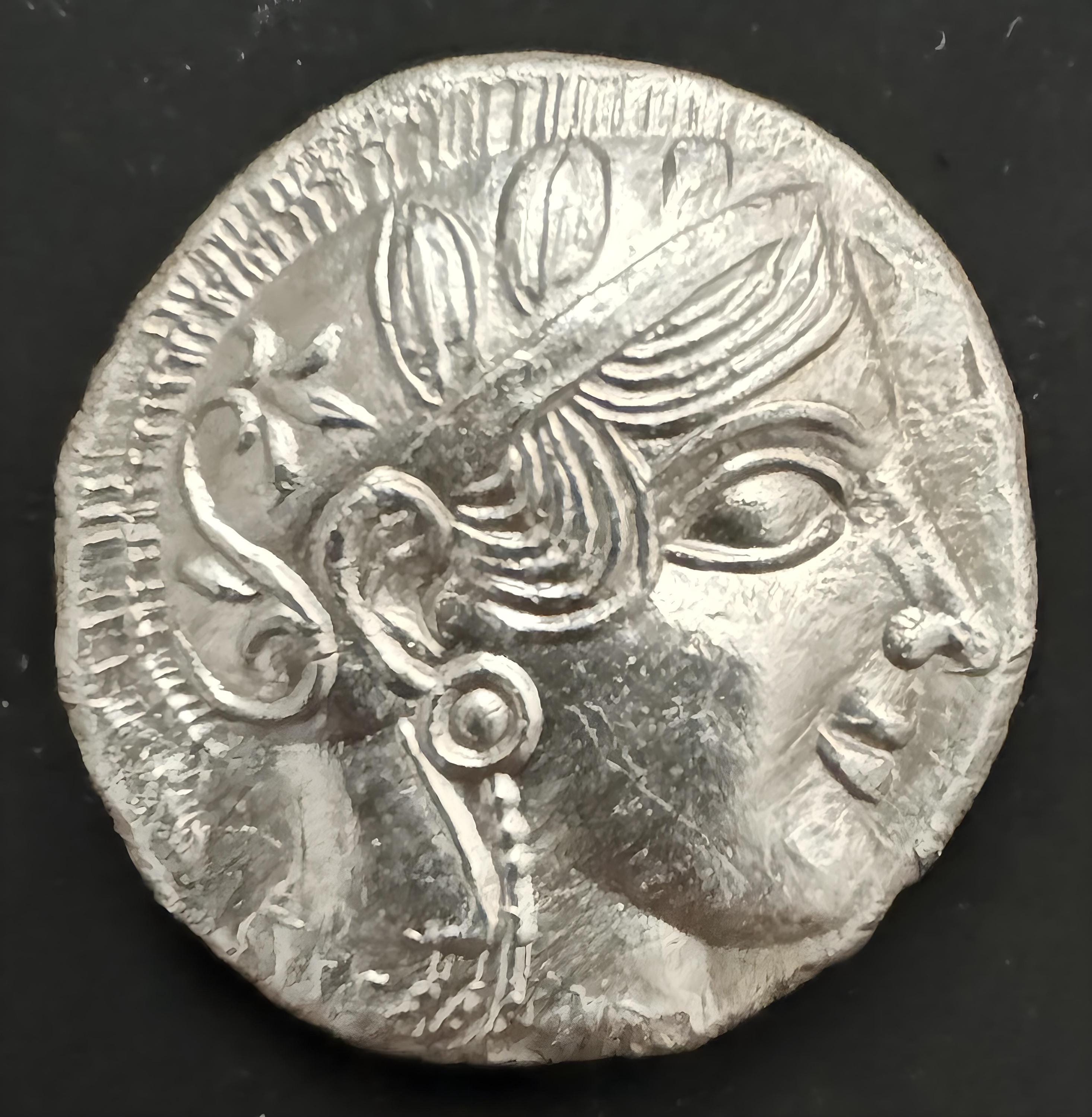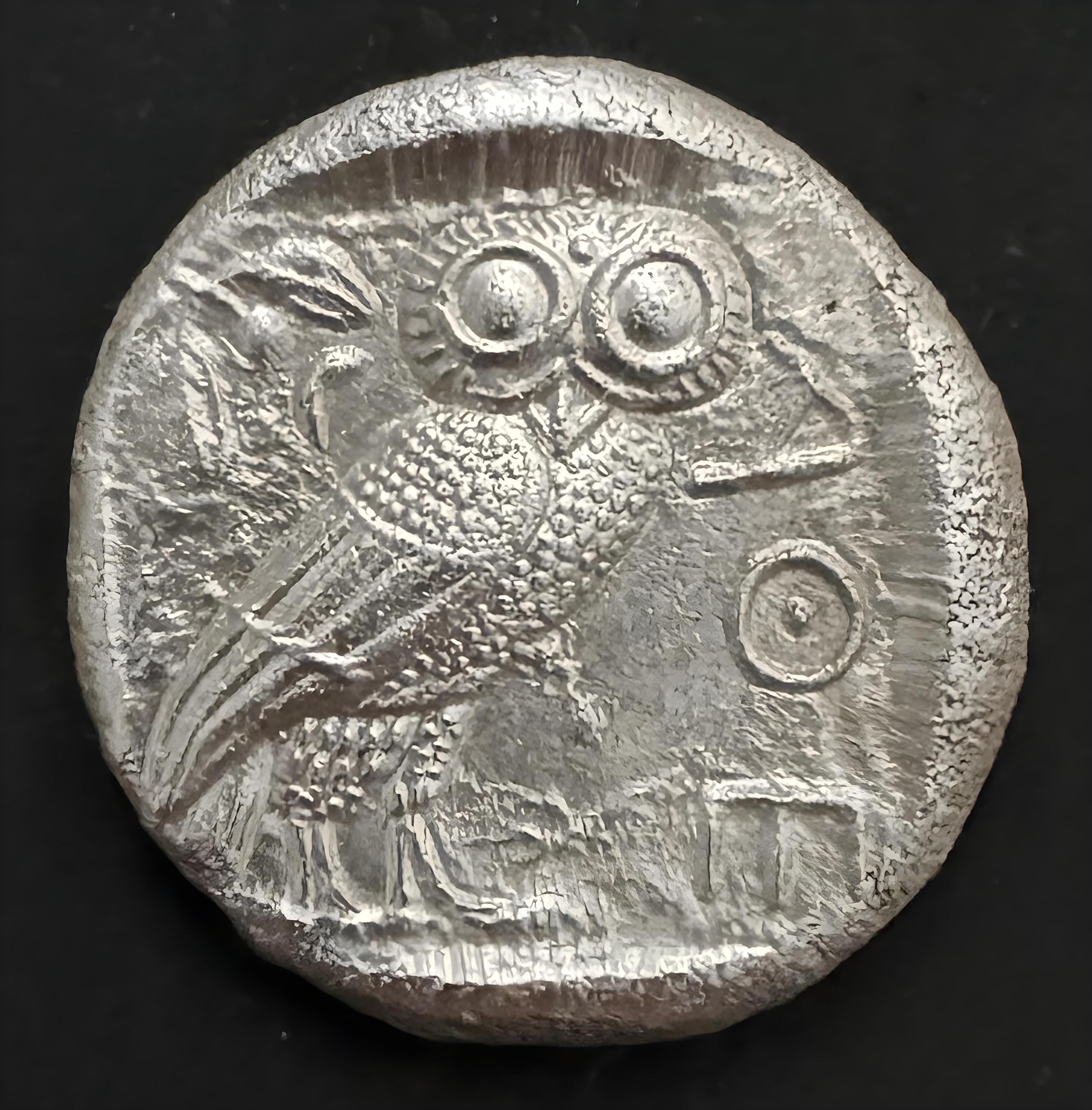 Athenian coins, bearing the helmeted head of Athena on the obverse and an owl on the reverse, became extremely popular throughout the ancient Greek world. Their success was due in part to quality of the silver used, from the Athenian mines at Laurion, and to Athens' military and political supremacy throughout much of the 5th century BC. The coins, known as « owls », were widely used in the 5th century and were copied by other regions, such as Egypt and southern Italy.