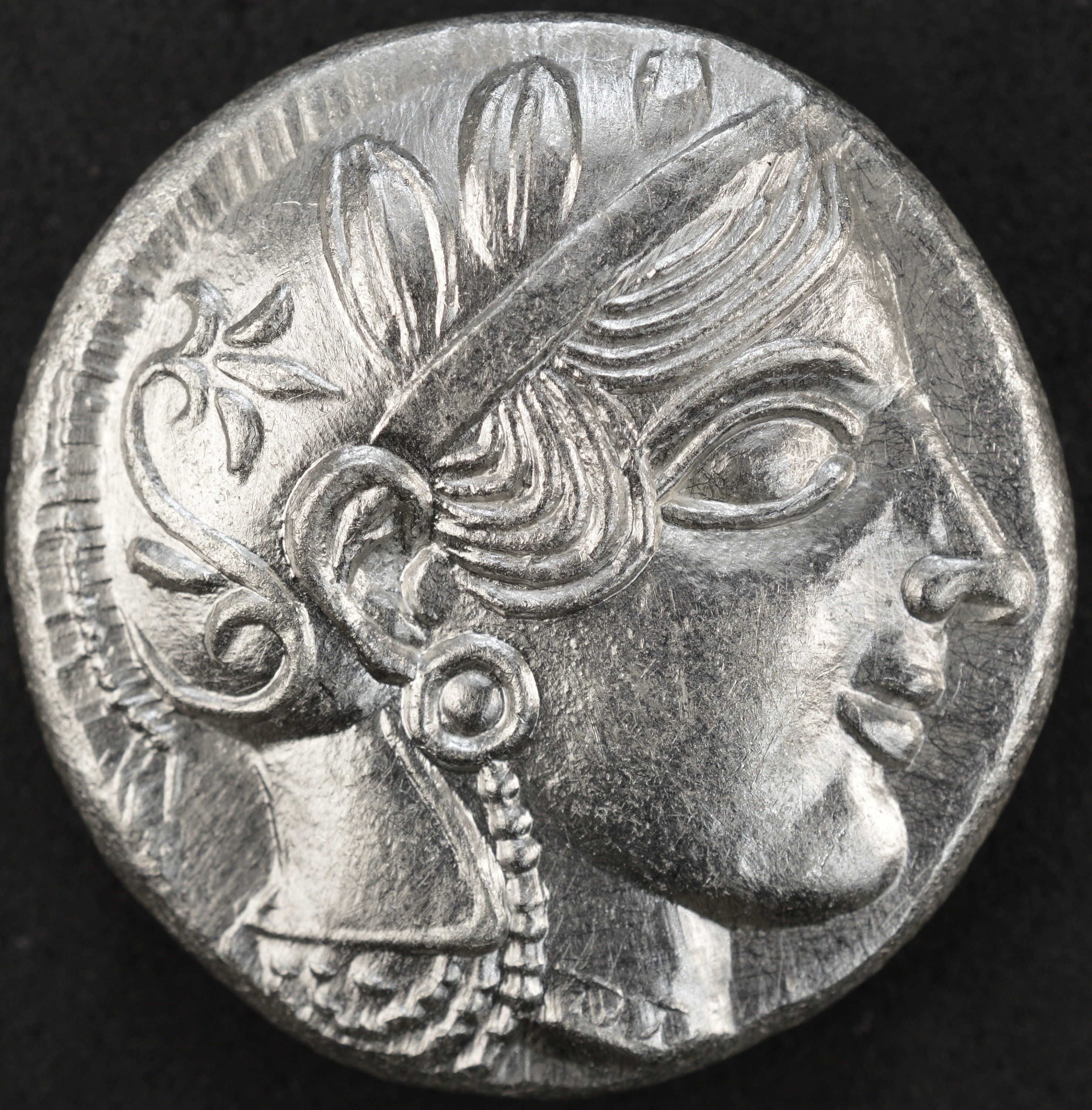 Obverse side: Head of Athena with frontal eye right, wearing crested Attic helmet ornamented with three olive leaves and floral scroll, pearl necklace hanging from earring