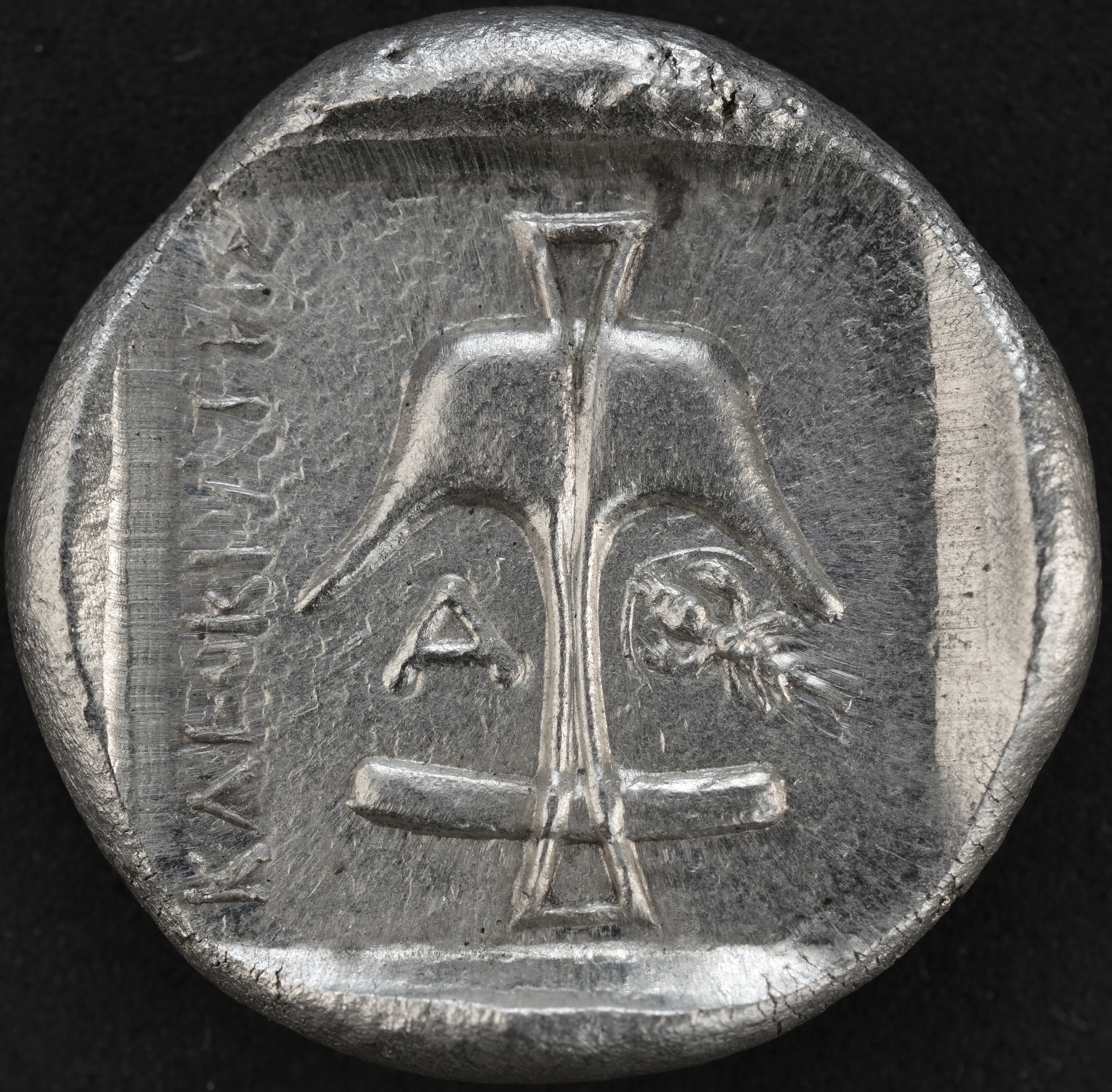 Rev. Upright anchor; A and crayfish flanking, all within shallow incuse square. ΚΛΕΟΚΡΑΤΗΣ (magistrate’s name)