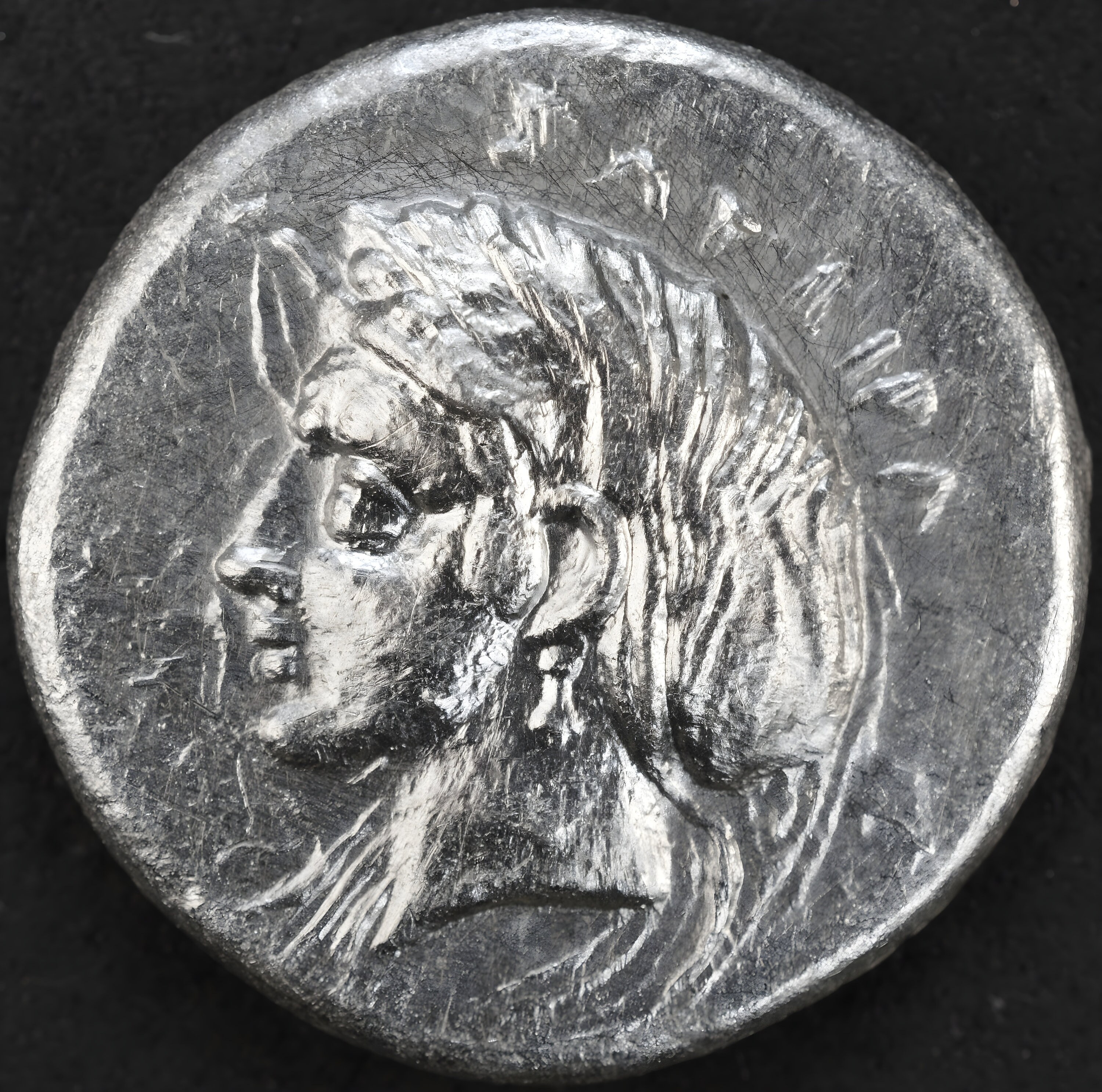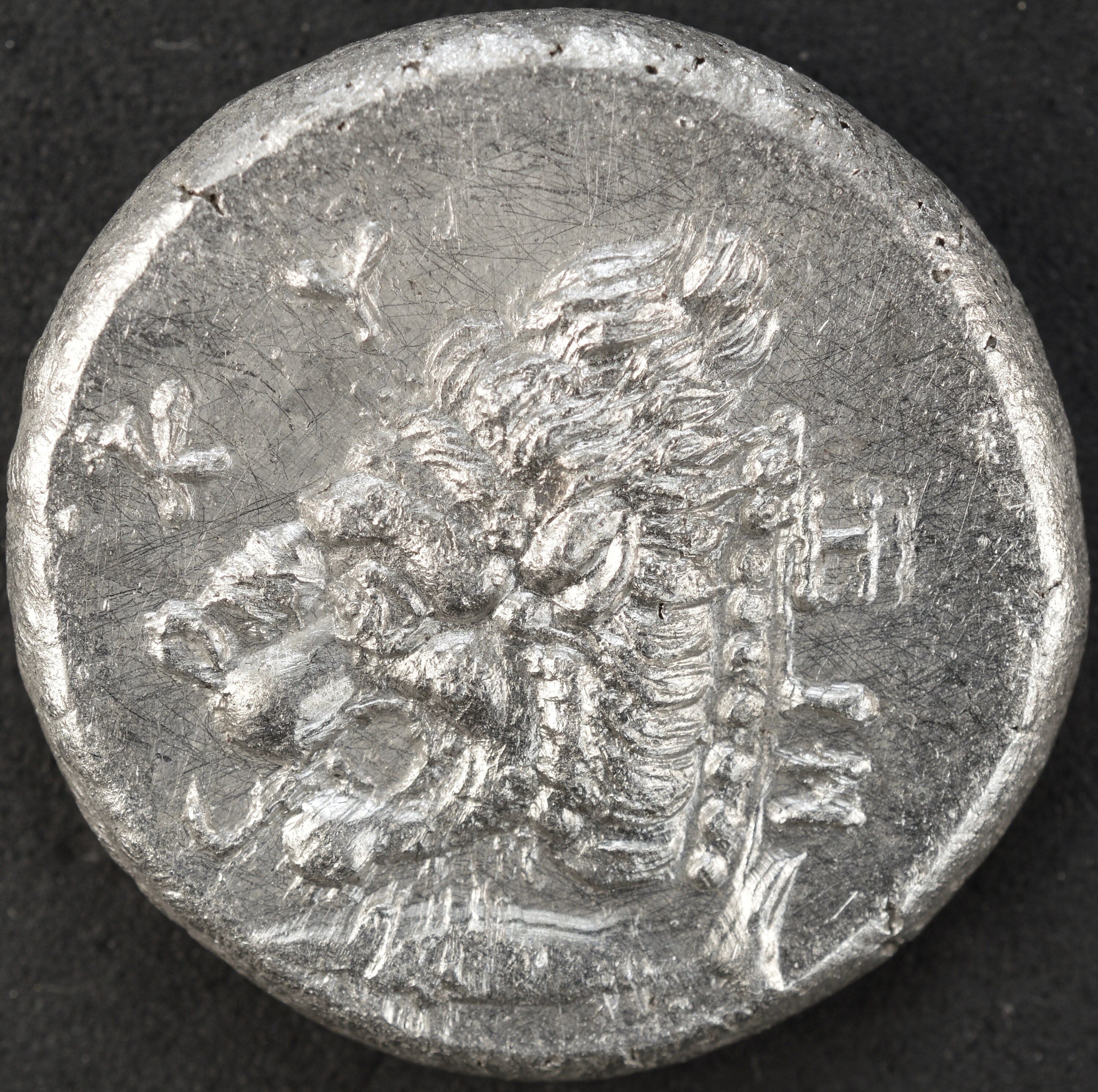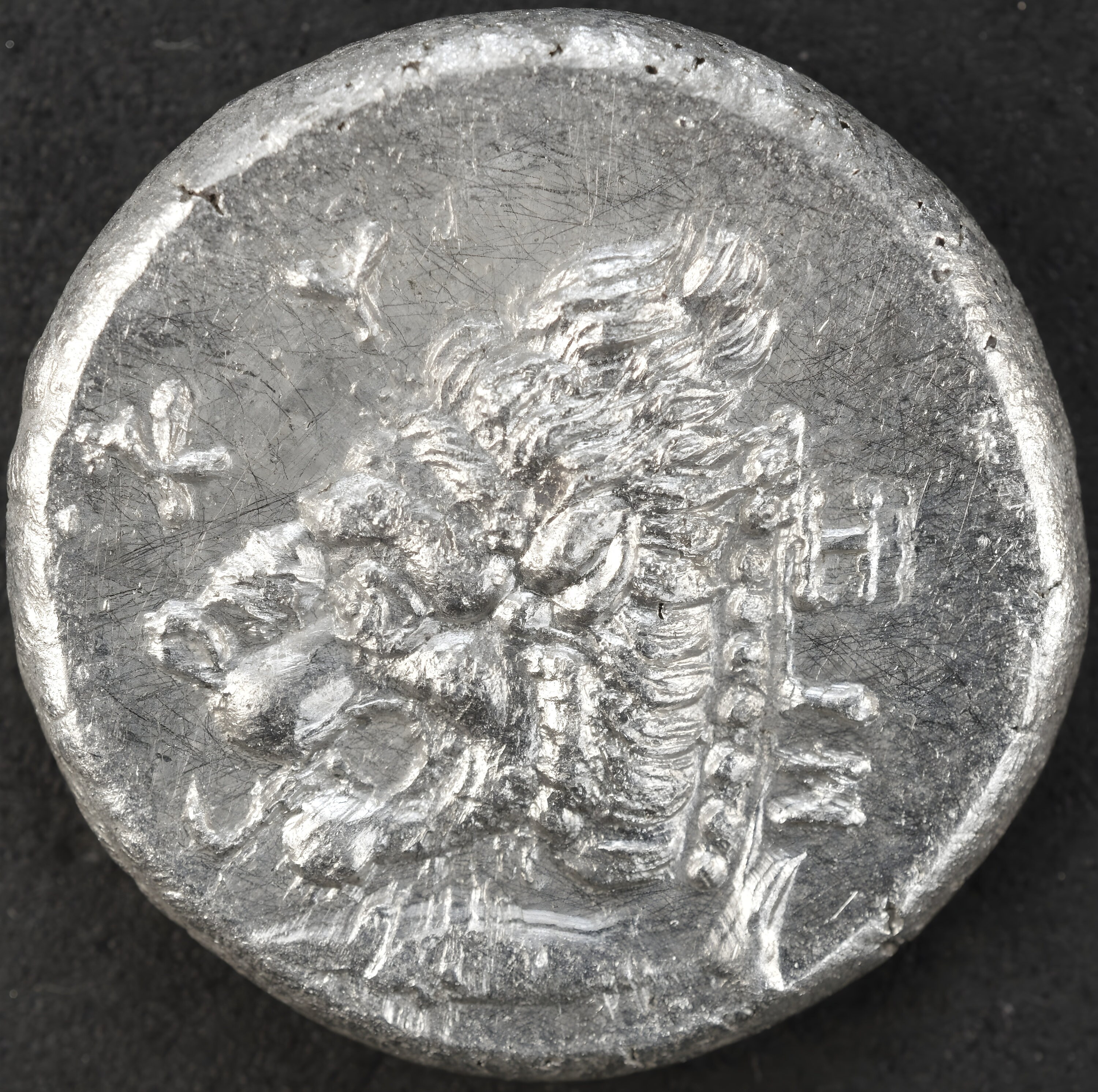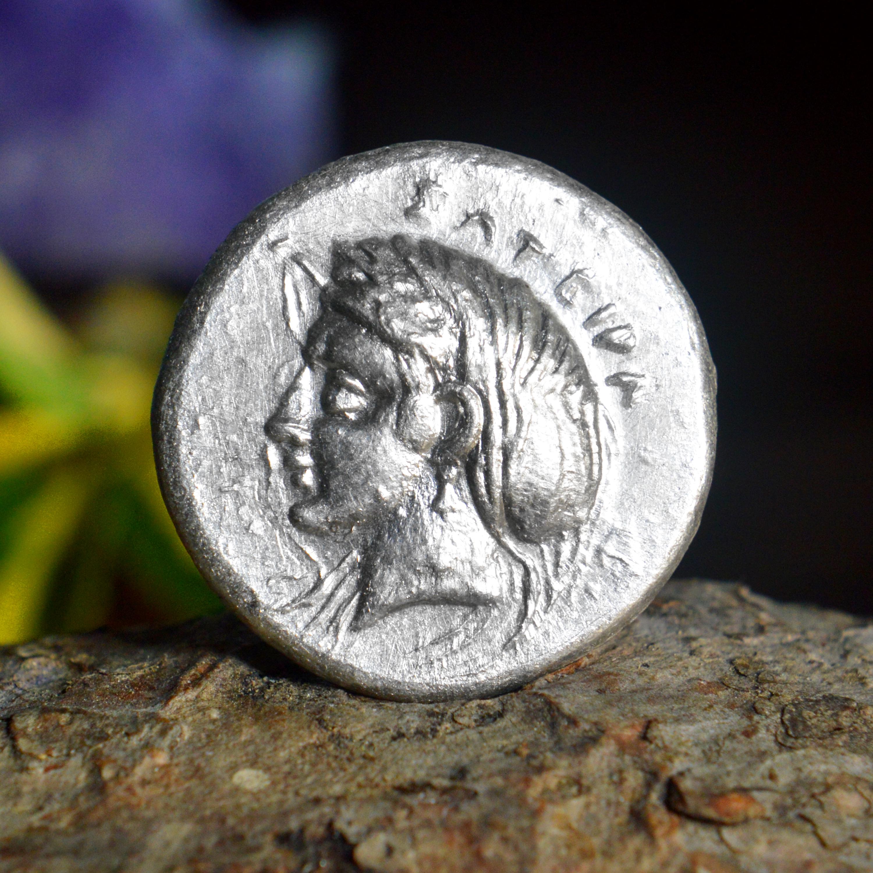 This beautiful tetradrachm points out the importance of grain for the inhabitants of Mysia in general and Cyzicus in particular. On one side of the coin we find Kore Soteira (Persephone), daughter of Zeus and Demeter, the embodiment of vegetation, connected with spring and fertility. Her head is garnished with a triangular earring, her hair held back with a band with a sprig finishing and the rest is covered by a veil.