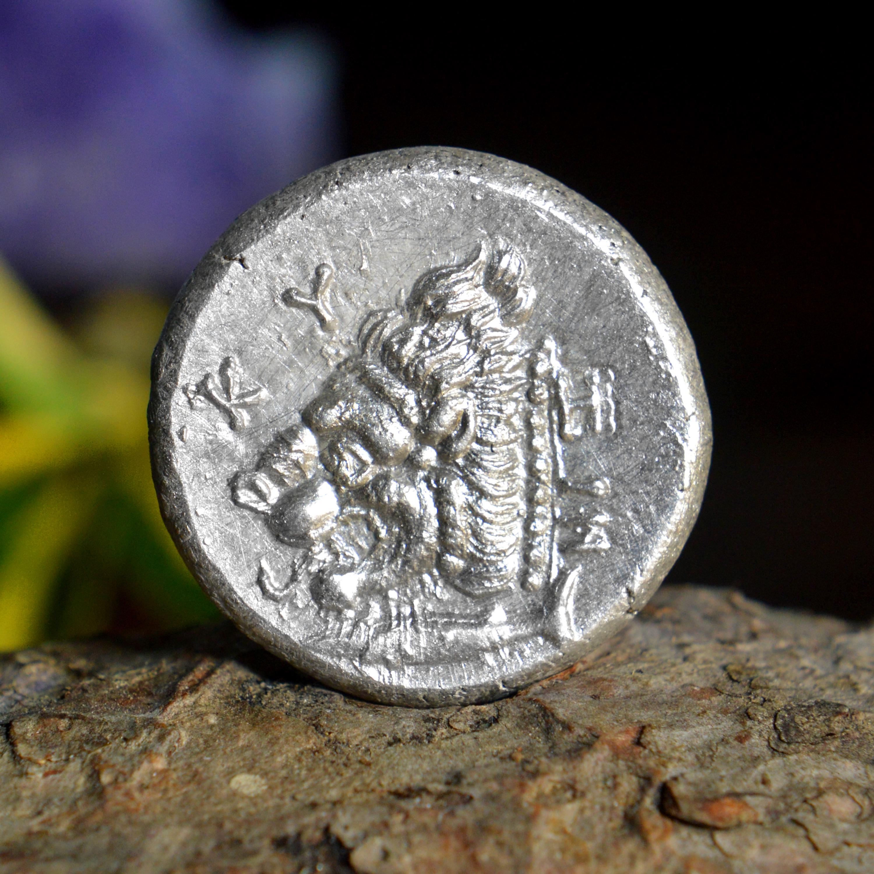 On the reverse are the lion and the tuna fish, classical symbols that have been mentioned above. It is a desirable piece full of symbolism in the purest Greek style.