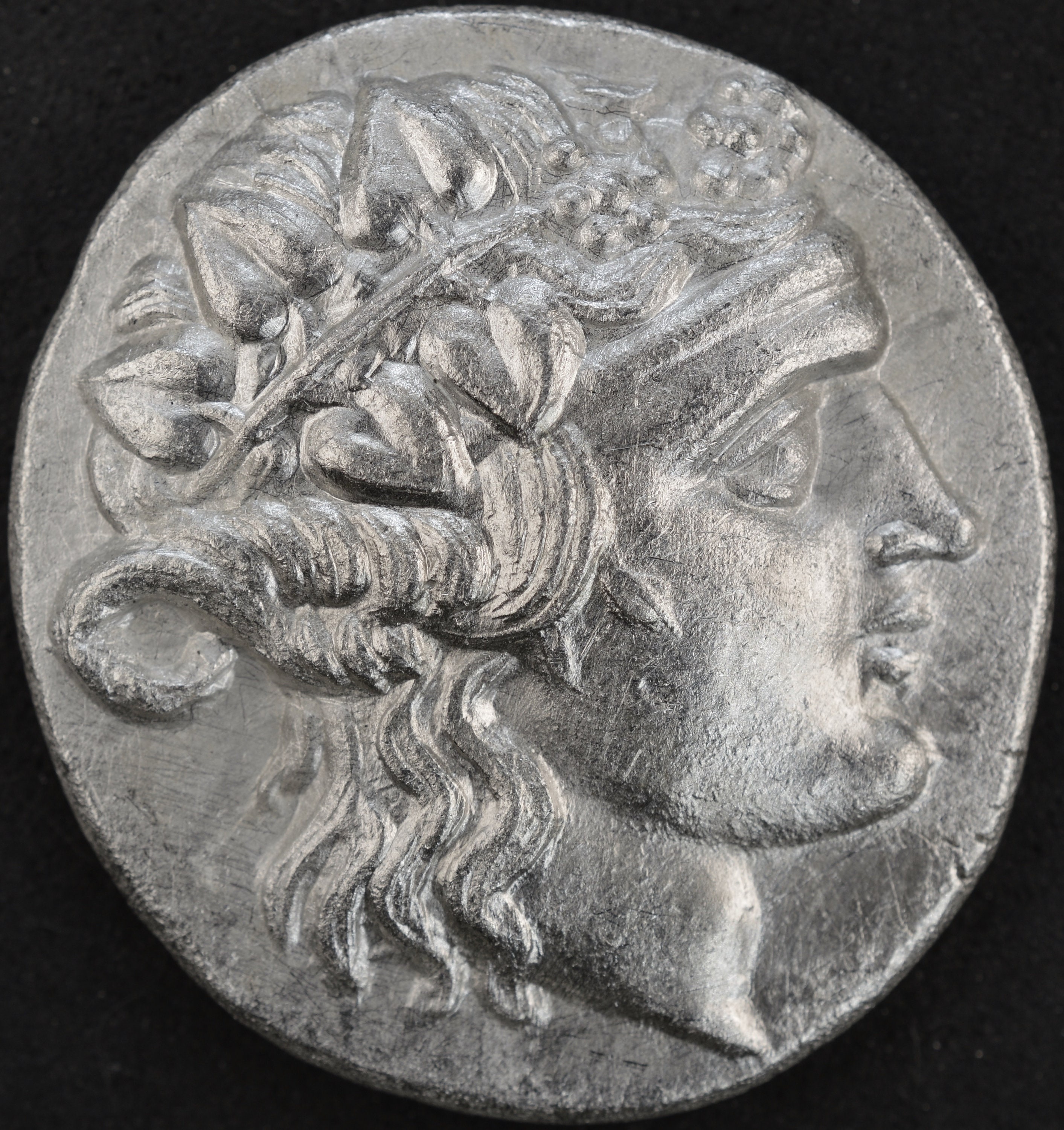 Obverse side: Head of young Dionysos right, wreathed in ivy and with band across forehead