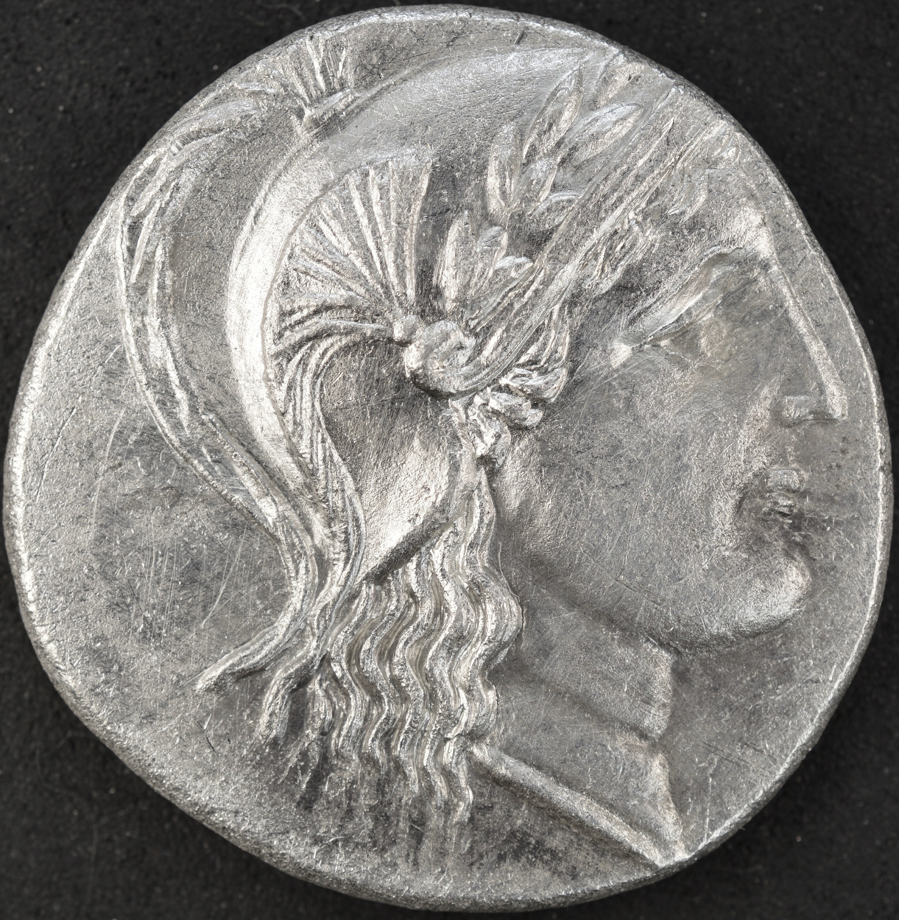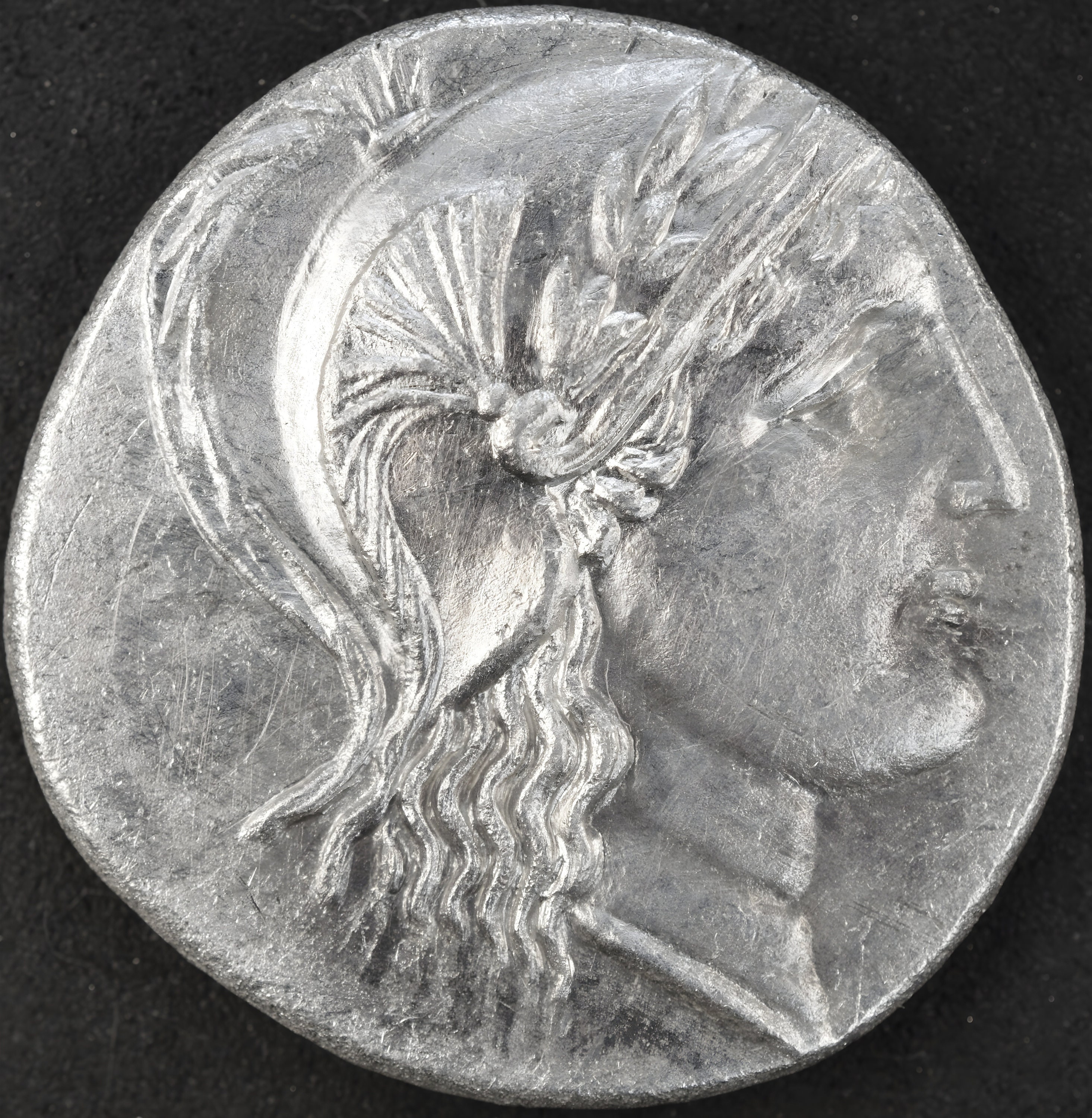 Obverse side: Head of Athena right, wearing laureate and triple-crested helmet
