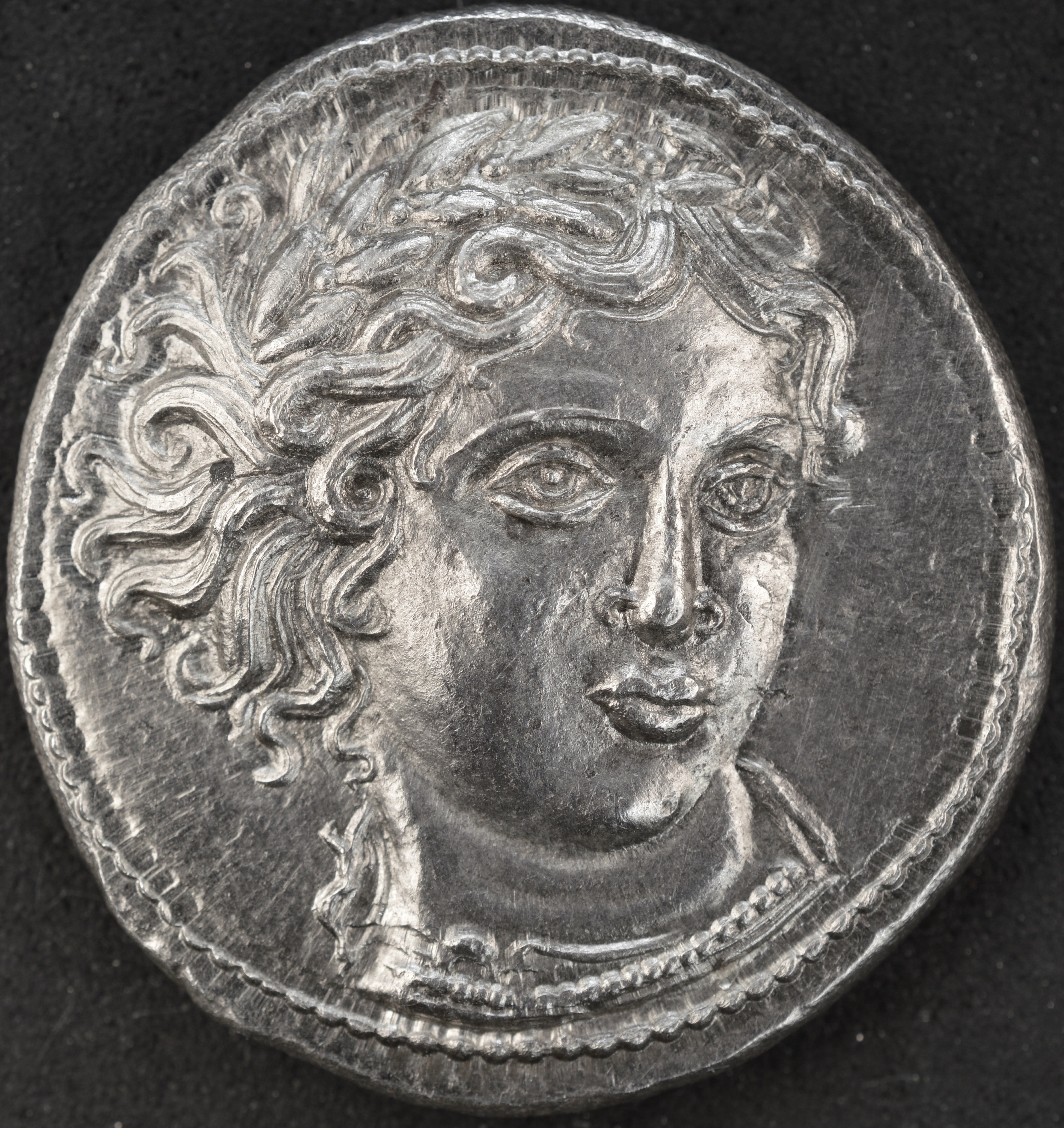 Obverse: Laureate head of Apollo, facing three-quarters r., hair flowing at sides of face.