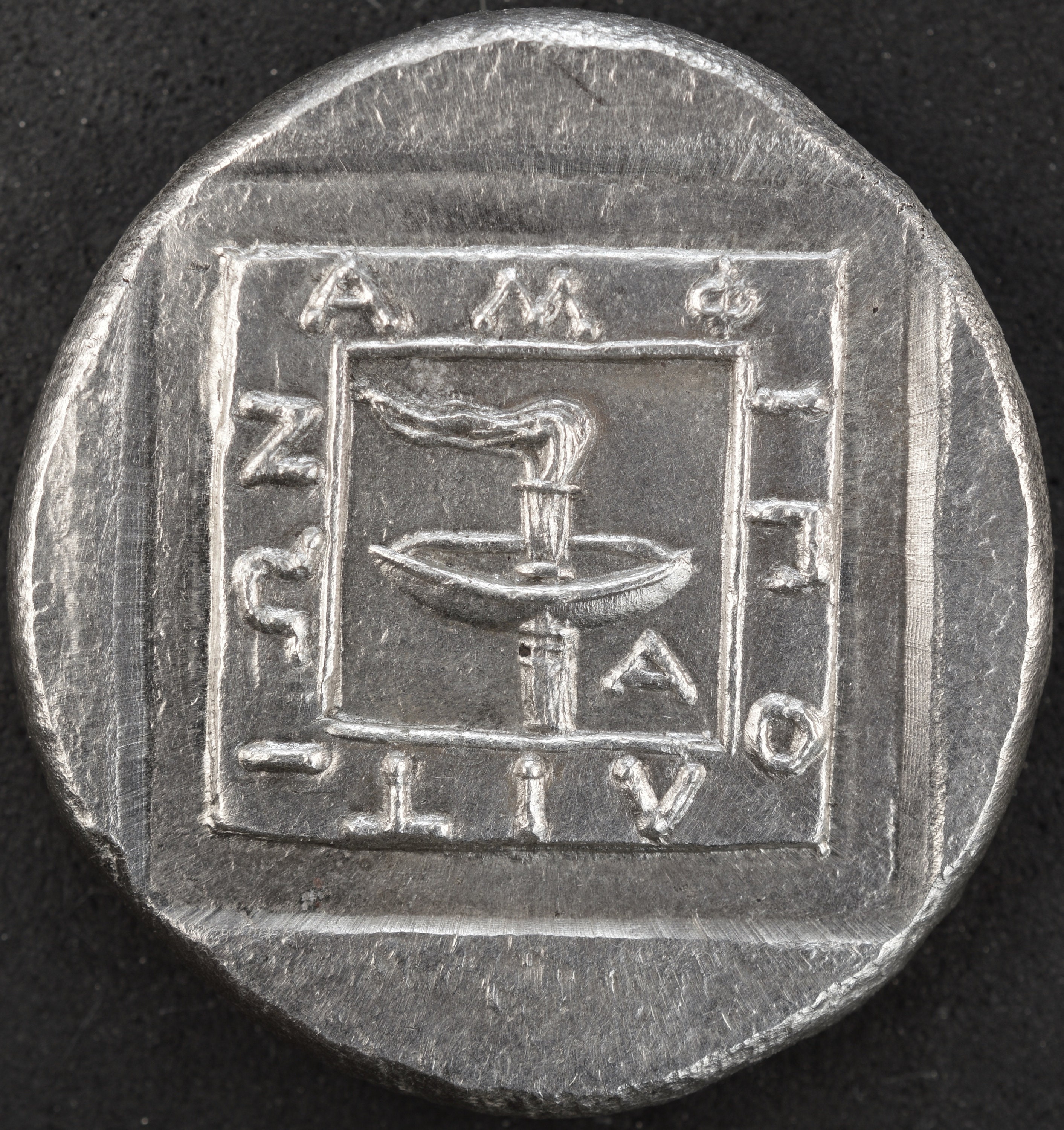 Reverse: AMΦ – ΙΠΟ – ΛΙΤ – ΕΩΝ around raised square frame within which racing torch; in lower l. field, cicada. All within partially incuse square.