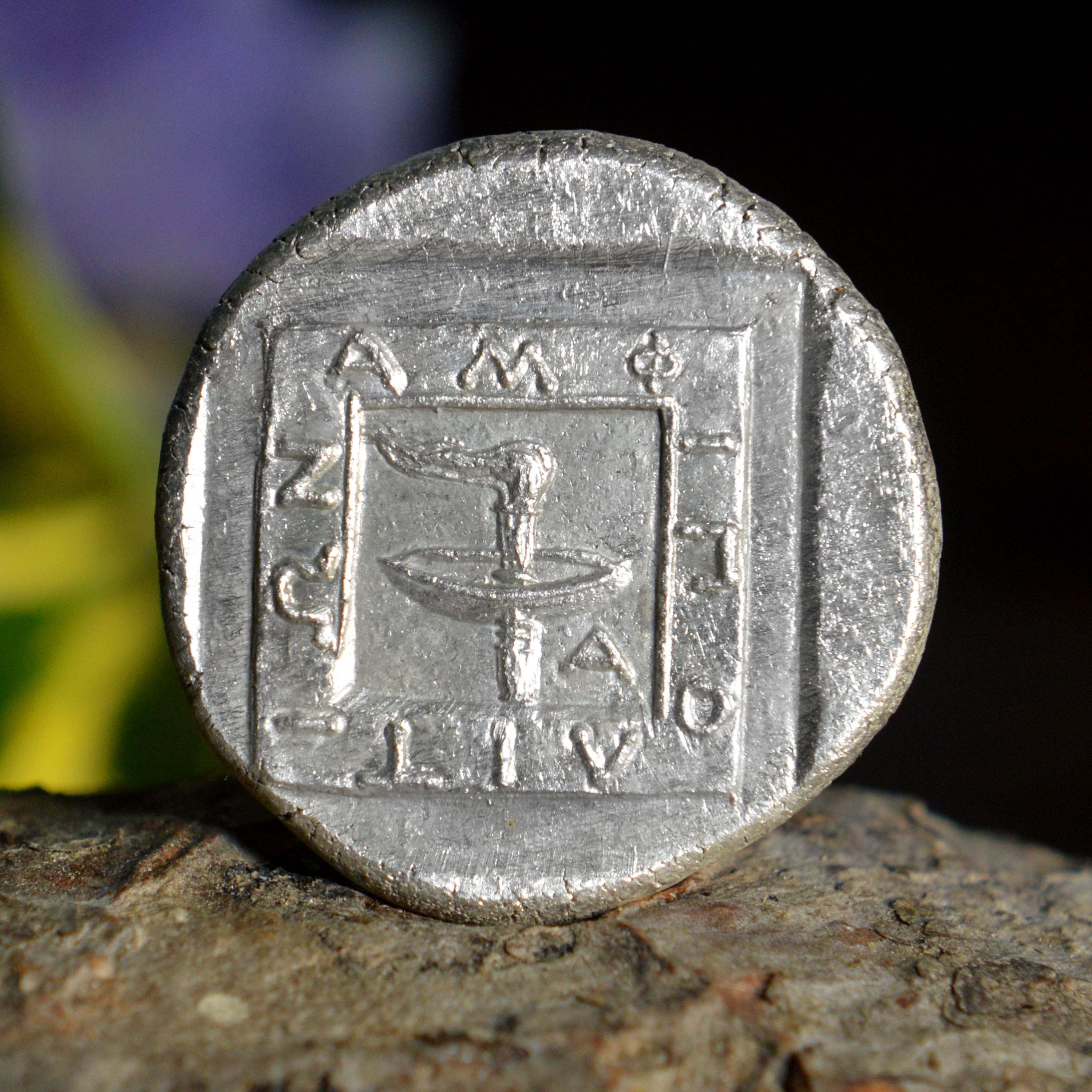 The facing head of the Pythian Apollo and a lit race torch within a raised square inscribed with an ethnic are characteristic of Amphipolitan tetradrachms, one of the most admired series of all Greek coins. Apollo was the patron deity of Amphipolis, and it would seem that the race torch alludes to games, perhaps those held there in honour of its oecist, or perhaps in honour of Apollo, though the evidence for the latter games exists only for a later period. The name of the city, which loosely translates to 'the surrounded city,' is derived from its peculiar geography, for it was hemmed in by Mount Pangaeus and the lower Strymon and its estuary. The advantageous site had long been occupied, but it was not until 437 B.C. that Greeks – principally Athenians – under the leadership of Hagnon, founded a colony, by which they hoped to exploit the gold and silver mines of the adjacent mountain. Because of its strategic location at an ideal crossing of the Strymon, and its proximity to extraordinarily productive mines, the city was a bone of contention for various external powers in the Greek world: Persians, Athenians, Spartans and Macedonians, and finally the Romans, who assumed control in 146 B.C.Amphipolis (literally "the Surrounded City") was so named for its strategic location on the lower Strymon River where it was defended on three sides by the river and on the fourth by Mount Pangaeus. The city was located at a junction of nine important roads into Thrace and Macedonia, including a major river crossing, and had been known originally as Ennea Hodoi ("Nine Ways"). This Thracian settlement gained notoriety in 480 BC, when the Persian Great King Xerxes I reportedly sacrificed nine boys and nine girls at the site to gain divine protection for his campaign against the Greeks.As Athenian economic interests in Thrace grew over the course of the fifth century BC, the importance of Ennea Hodoi became obvious. At last, in 437 BC, the site was claimed by Athenian colonists under the leadership of the oecist Hagnon and refounded as Amphipolis. The city prospered from the exploitation of the gold and silver mines of Mount Pangaeus and trade with the peoples of the Thracian and Macedonian interior.The economic and strategic importance of the city made it a frequent bone of contention between states with interests in Thrace. In 424 BC, early in the Peloponnesian War (431-404 BC), Amphipolis was captured by the celebrated Spartan general Brasidas despite the presence of an Athenian naval squadron led by Thucydides, the man who later became the historian of the great Greek conflict. In 421 BC, Athenians mounted a counterattack under the leadership of the demagogue Kleon. This was defeated, but both Brasidas and Kleon were killed in the fighting. The terms of the temporary Peace of Nikias made later the same year required the return of Amphipolis to Athens, but the subsequent events of the war prevented the Athenians from reclaiming the city.For much of the fourth century BC, the Amphipolitans were largely consumed with forming alliances with regional powers like the Chalkidian League and the Macedonian kings to prevent their city from returning to Athenian domination. Even the great Athenian generals of the age, Iphikrates and Timotheos were unable to retake the city despite frequent attempts. At last, in 357 BC, the Macedonian king Philip II besieged and captured Amphipolis out of concern that the independent city would constantly draw Athenian military attention and as a steppingstone to his conquest of Thrace. The city remained an important center of the Macedonian kingdom until 167 BC, when the monarchy was abolished and Amphipolis was established as the administrative capital of an autonomous district (meris) under Roman control.The facing head of the Pythian Apollo and a lit race torch within a raised square inscribed with an ethnic are characteristic of Amphipolitan tetradrachms, one of the most admired series of all Greek coins. Apollo was the patron deity of Amphipolis, and it would seem that the race torch alludes to games, perhaps those held there in honour of its oecist, or perhaps in honor of Apollo, though the evidence for the latter games exists only for a later period. ssumed control in 146 B.C.