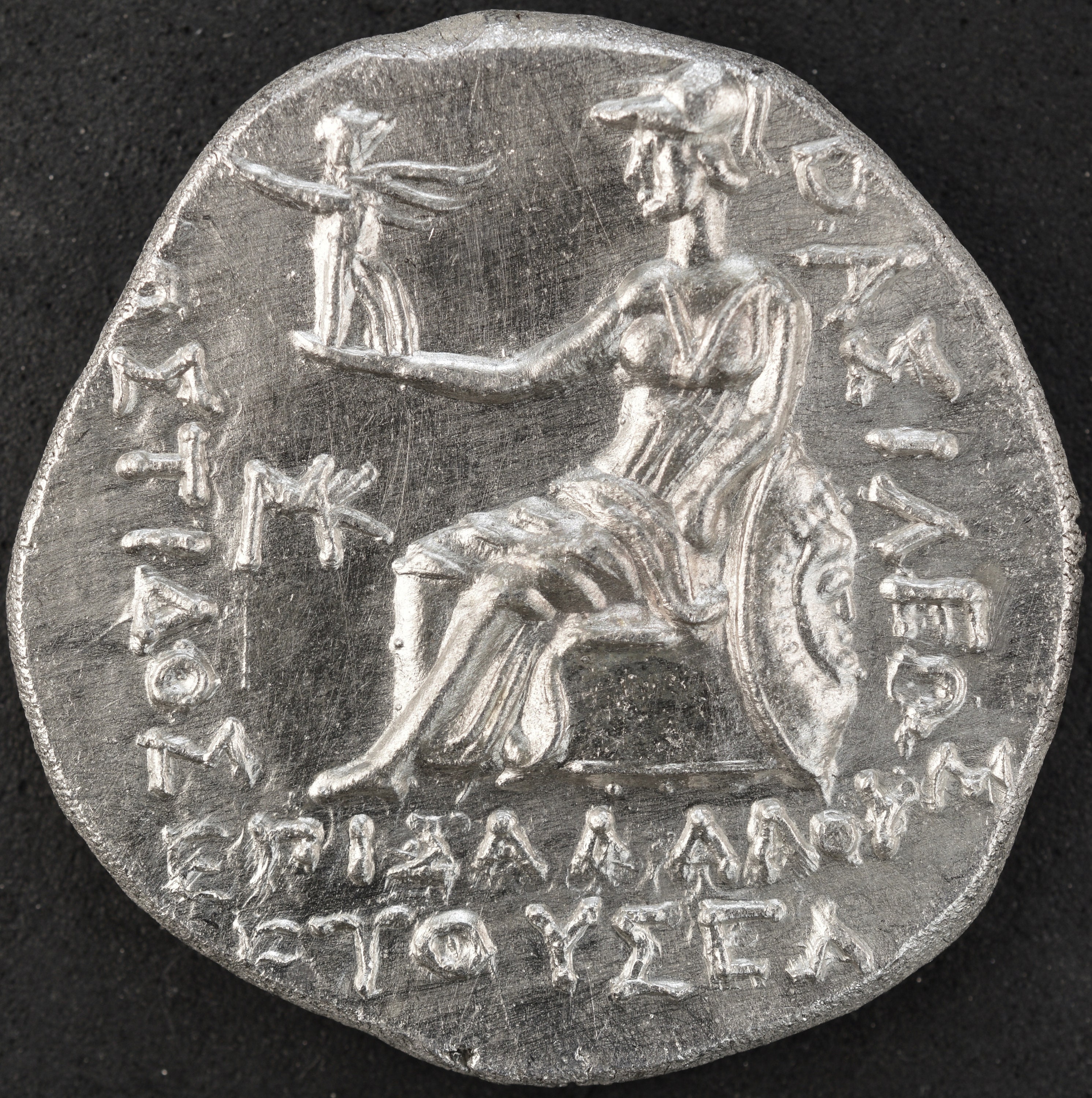 Rev: Athena Nikephoros enthroned to left, resting elbow on grounded shield; ΒΑΣΙΛΕΩΣ to right, MOΣTIΔOΣ to left, monogram in inner left field, EΠI ΣAΔAΛOY ETOYΣ ΛH in exergue.