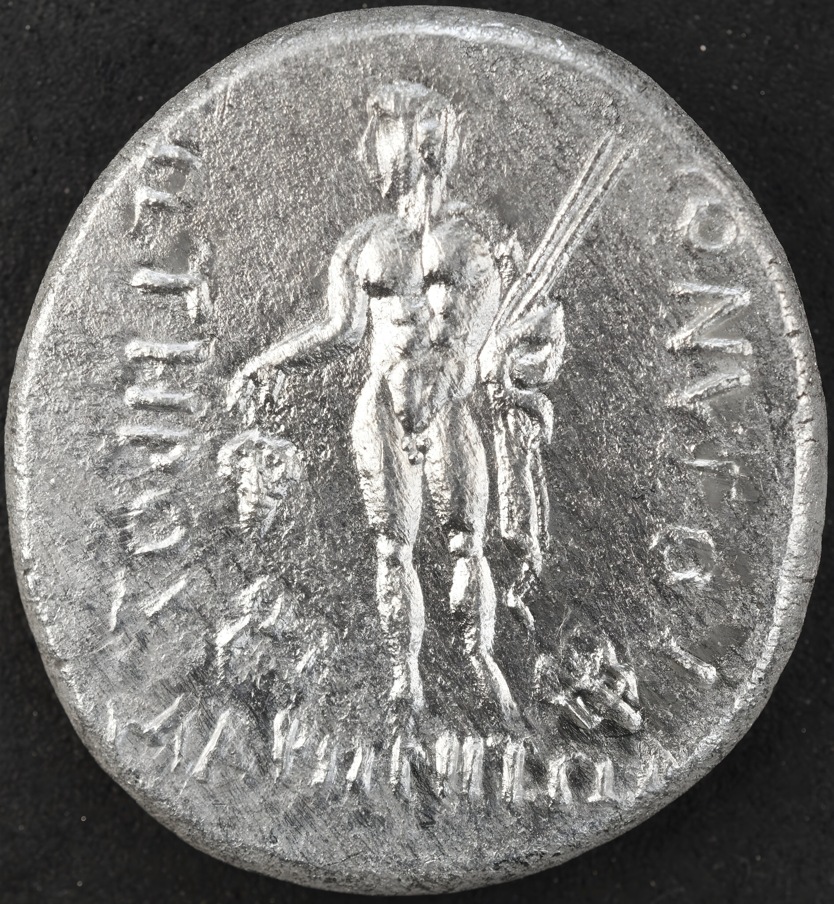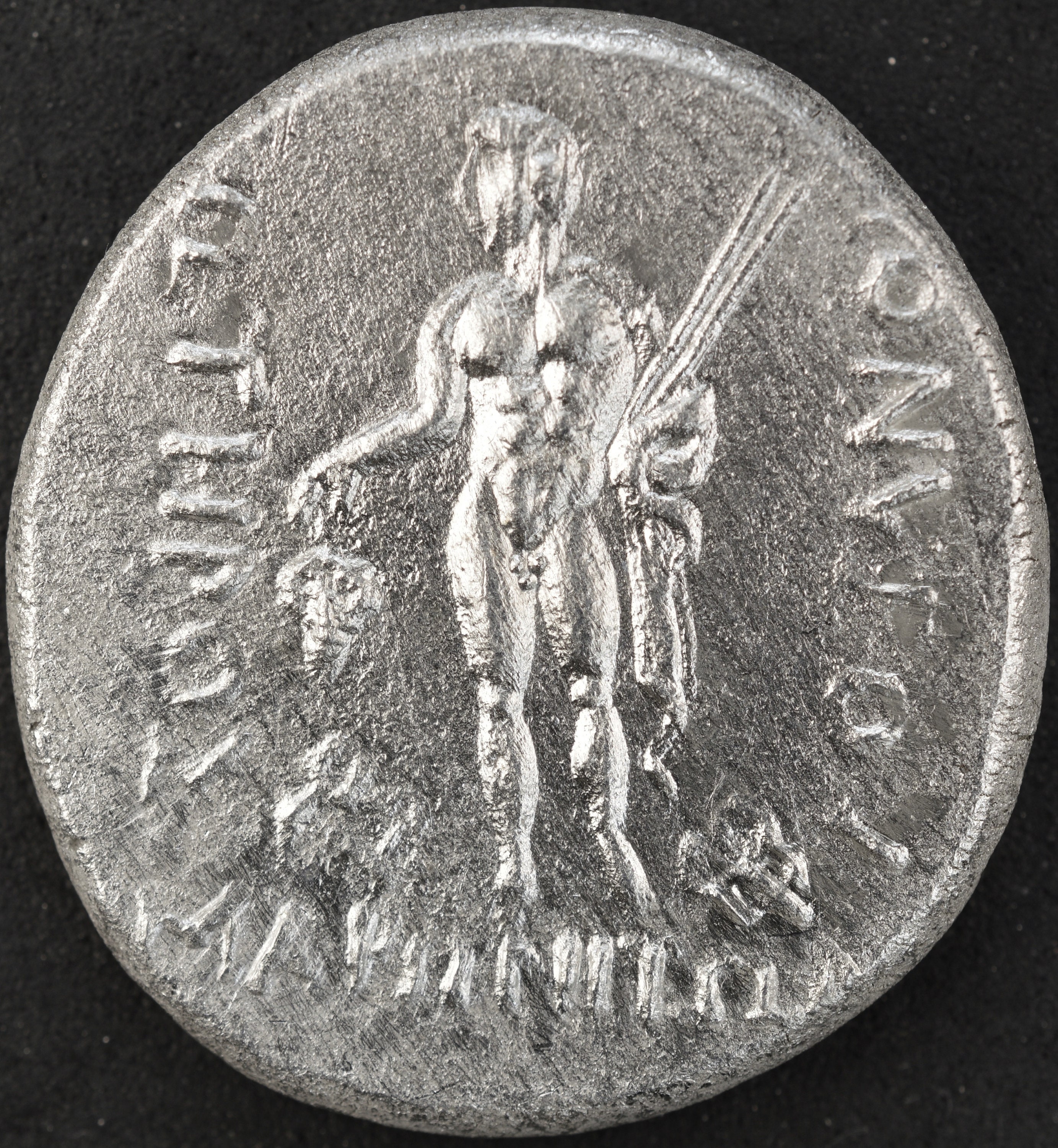 Reverse side: Dionysos standing left, holding narthex stalks and grapes, monograms in left and right lower fields