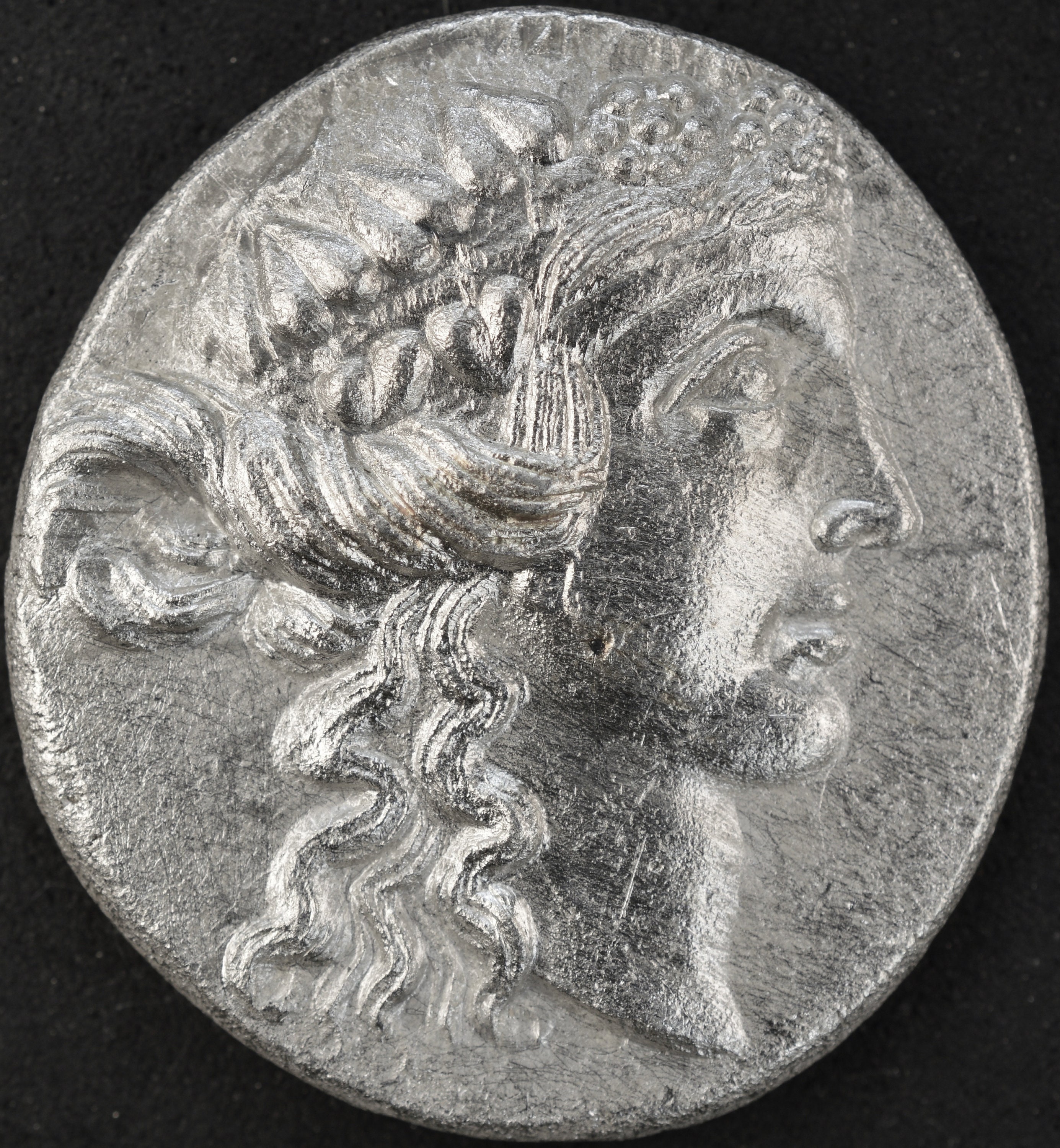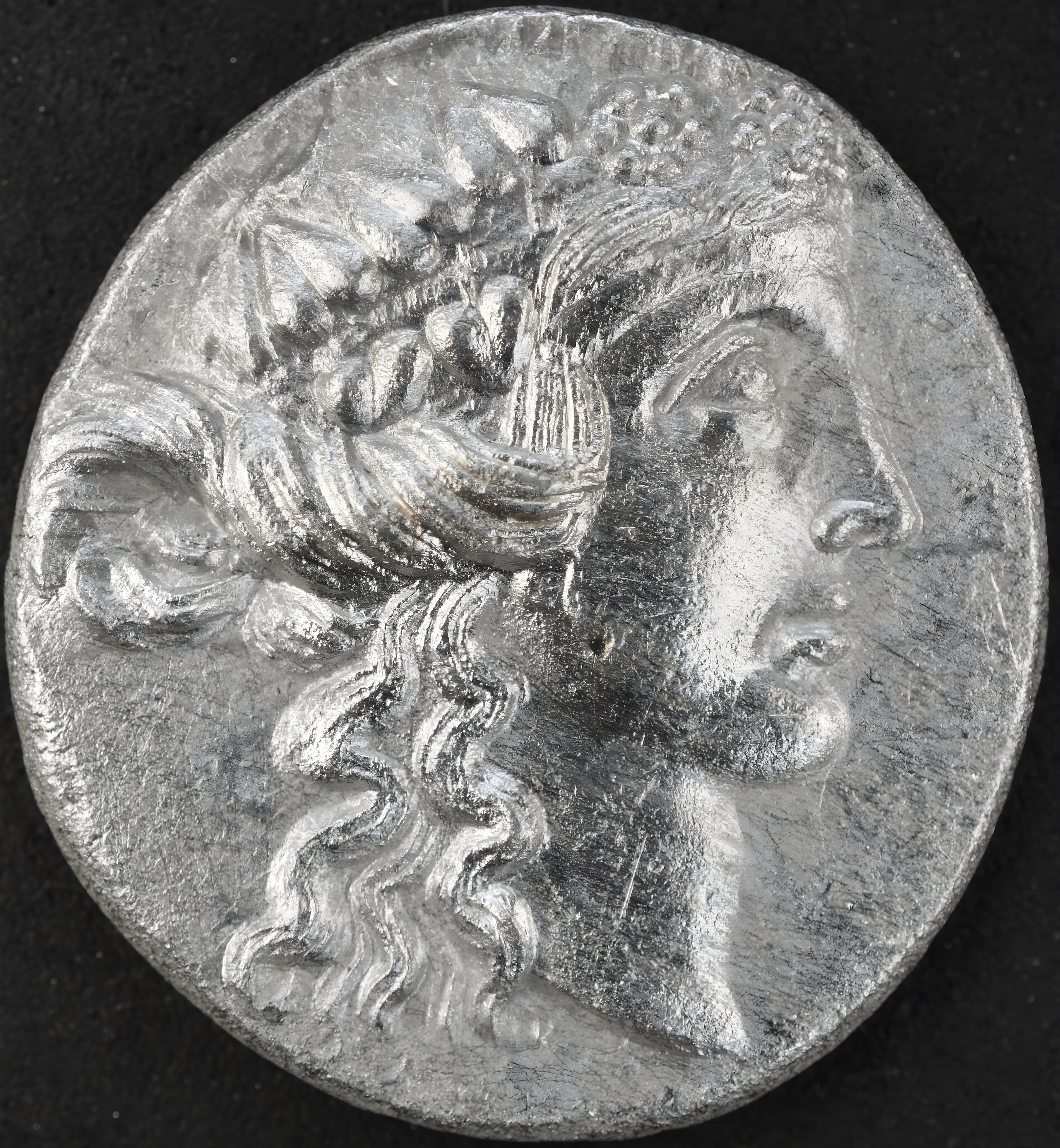 Maroneia was located on the coast about midway between the mouths of the Hebrus and the Nestus. It was named after Maron, son of Euanthes, a priest of Apollo, who in the Odyssey gives Odysseus the wine with which he intoxicates Polyphemos. Maron is also called a son of Dionysos. Grapes and vines are symbols of Dionysos or Maron, and advertise the famous wine of Maroneia, which was said to be capable of mixture with twenty times its quantity of water. The autonomous coinage of Maroneia ceased when it fell under the dominion of Philip of Macedon, but the town appears to have remained a place of mintage under Philip, Alexander, Philip Aridaeus, Lysimachus, etc. Not until the second century B.C., when the Romans were supreme in Greece, did Maroneia regain its autonomy. The date of the commencement of the new series of tetradrachms is uncertain, but it is likely that neither Maroneia nor Thasos began to coin again until after the closing of the Macedonian mints for silver in 148 B.C.