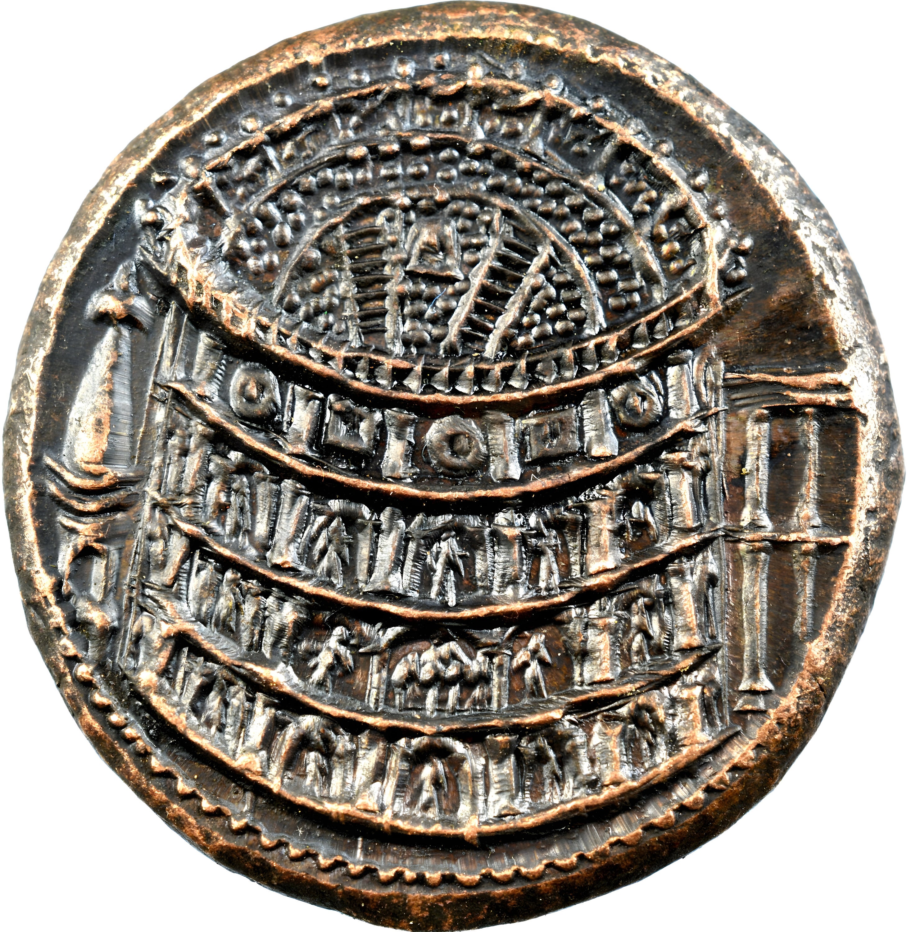 Reverse: The Flavian Amphitheatre (Colosseum), seen from slightly above. The exterior includes statues between the arches on the second and third levels and enough of the interior to show a row of seats and in the middle the imperial throne in the half circle. To the left is the conical fountain known as the Meta Sudans and to the right a two-storey portico.