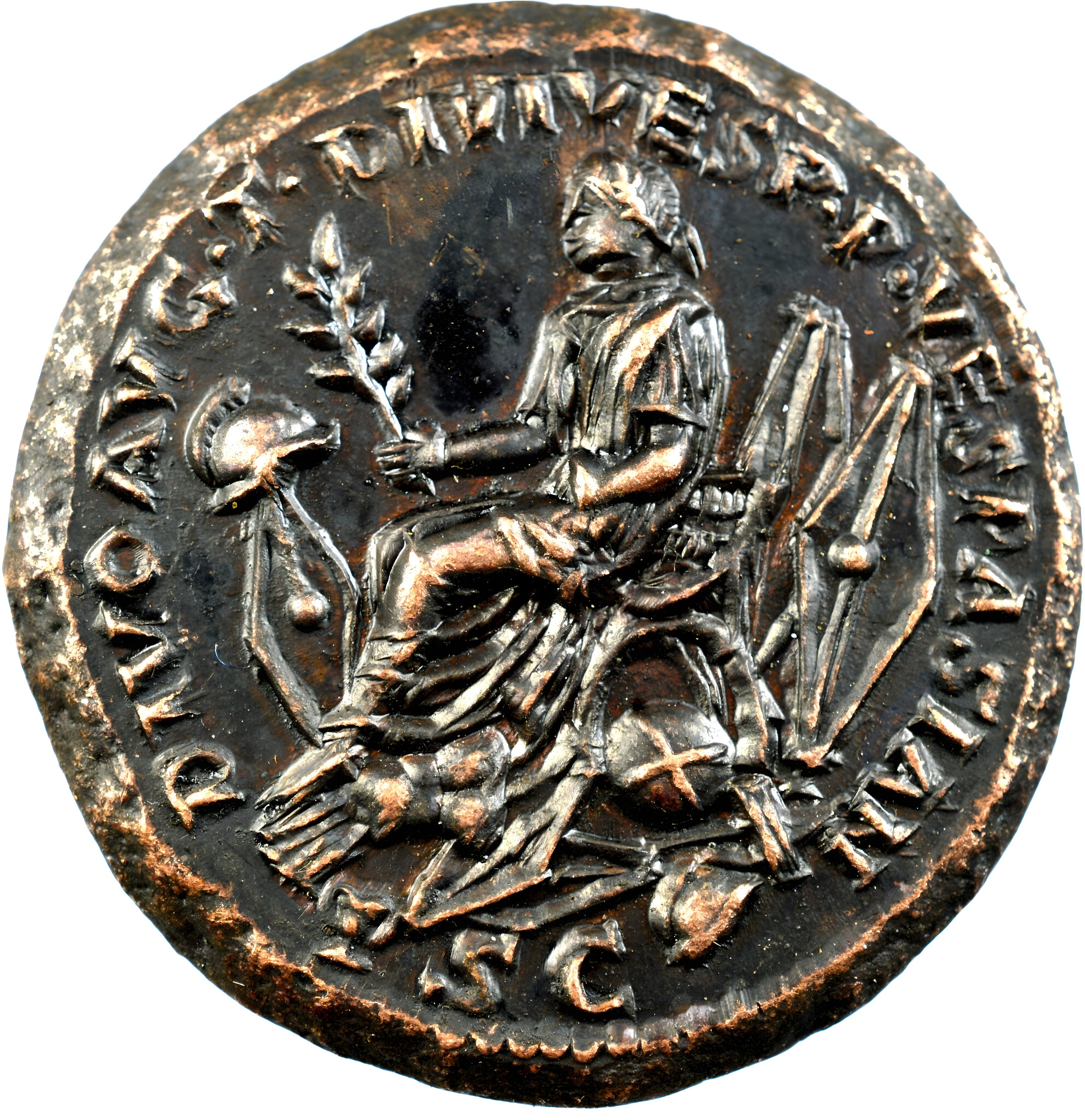 Obverse: DIVO AVG T DIVI VESP F VESPASIAN. SC in exe., Titus in toga, left, holding olive branch in outstretched right hand, seated on stella curulis, under which is a globe, to the left and right captured weapons.
