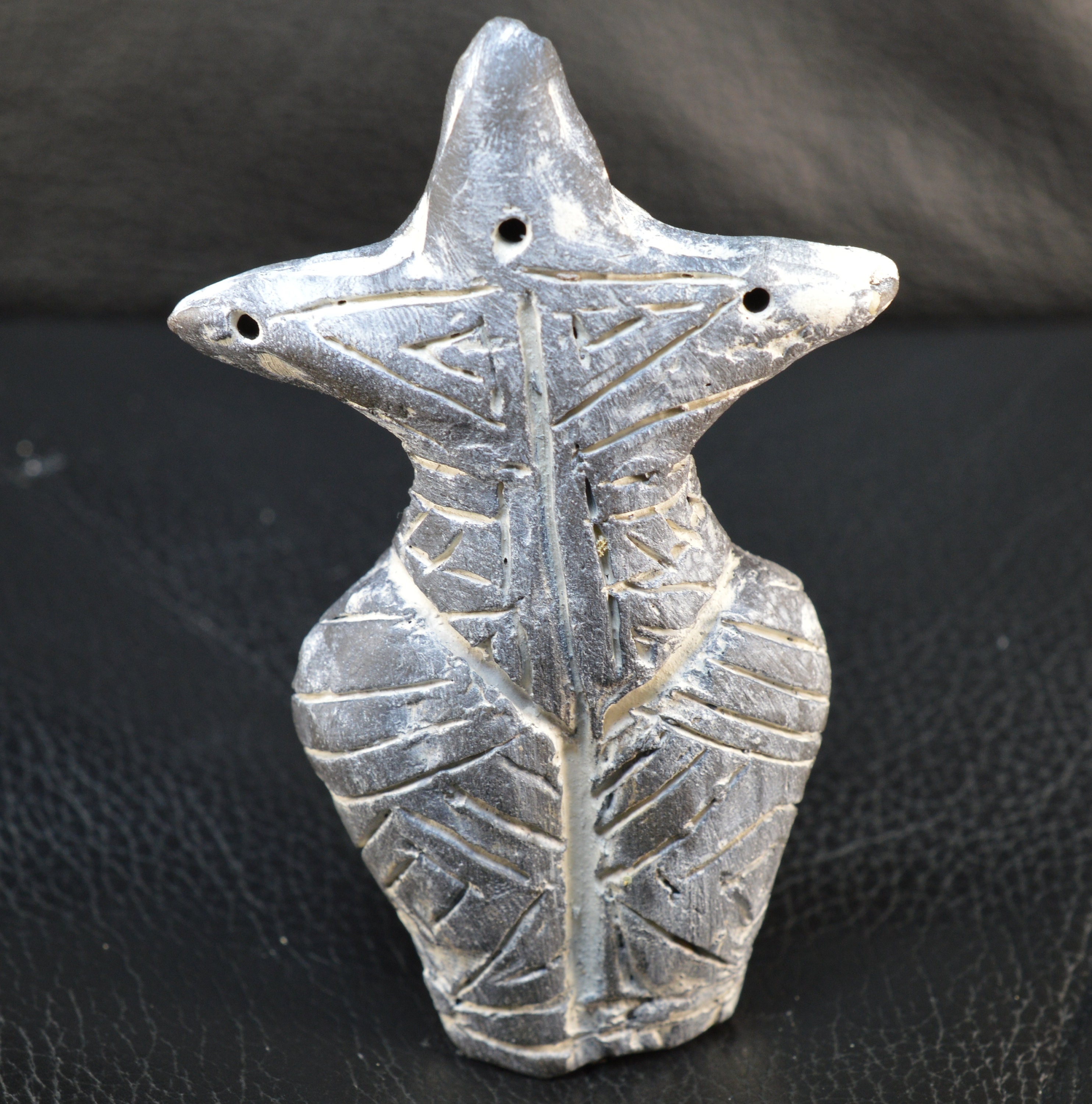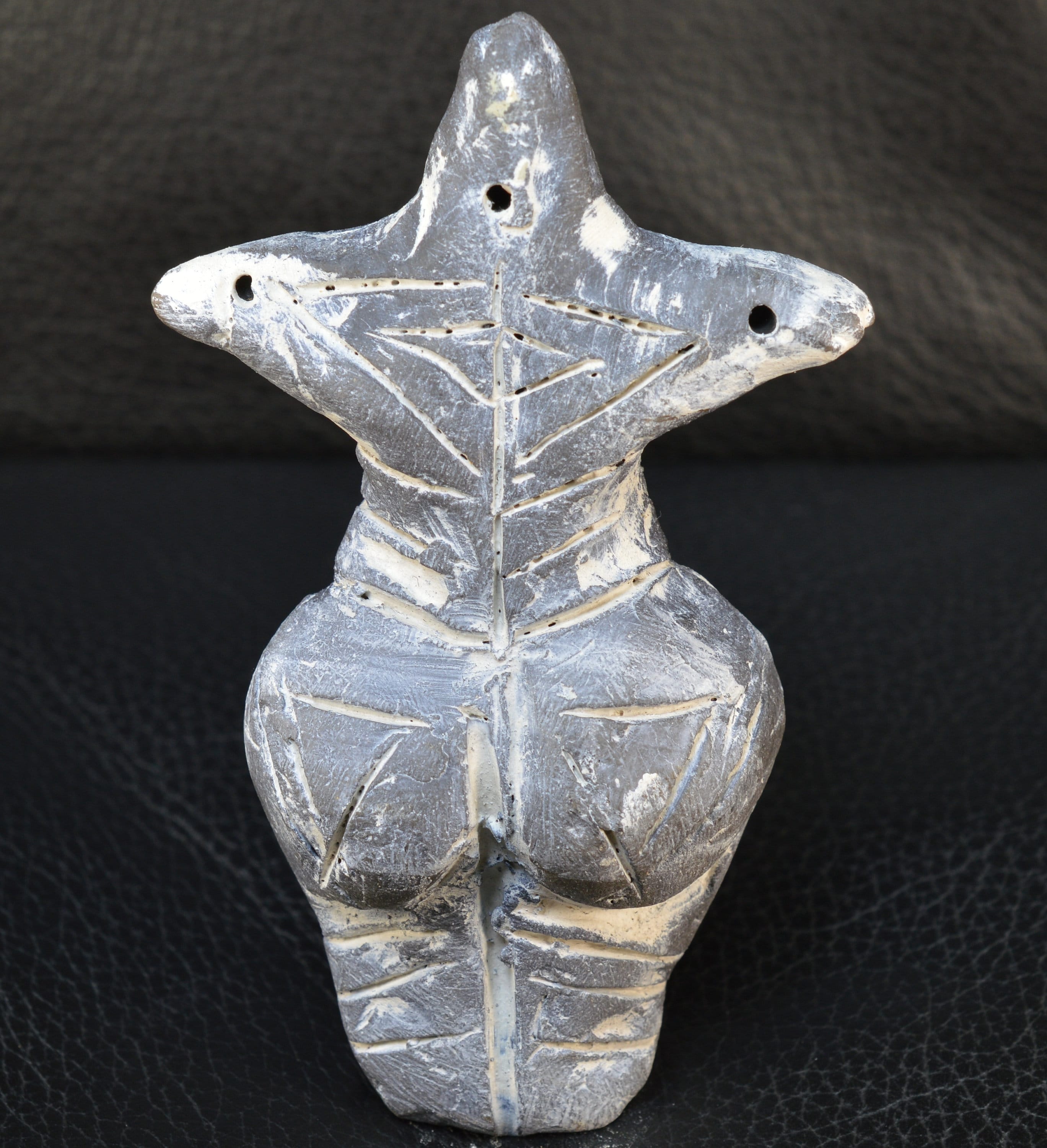 Handcrafted from clay, the figurine depicts a sitting, pregnant women with large belly and full hips. The female Goddess is believed to be a symbol of fertility and prolificacy.