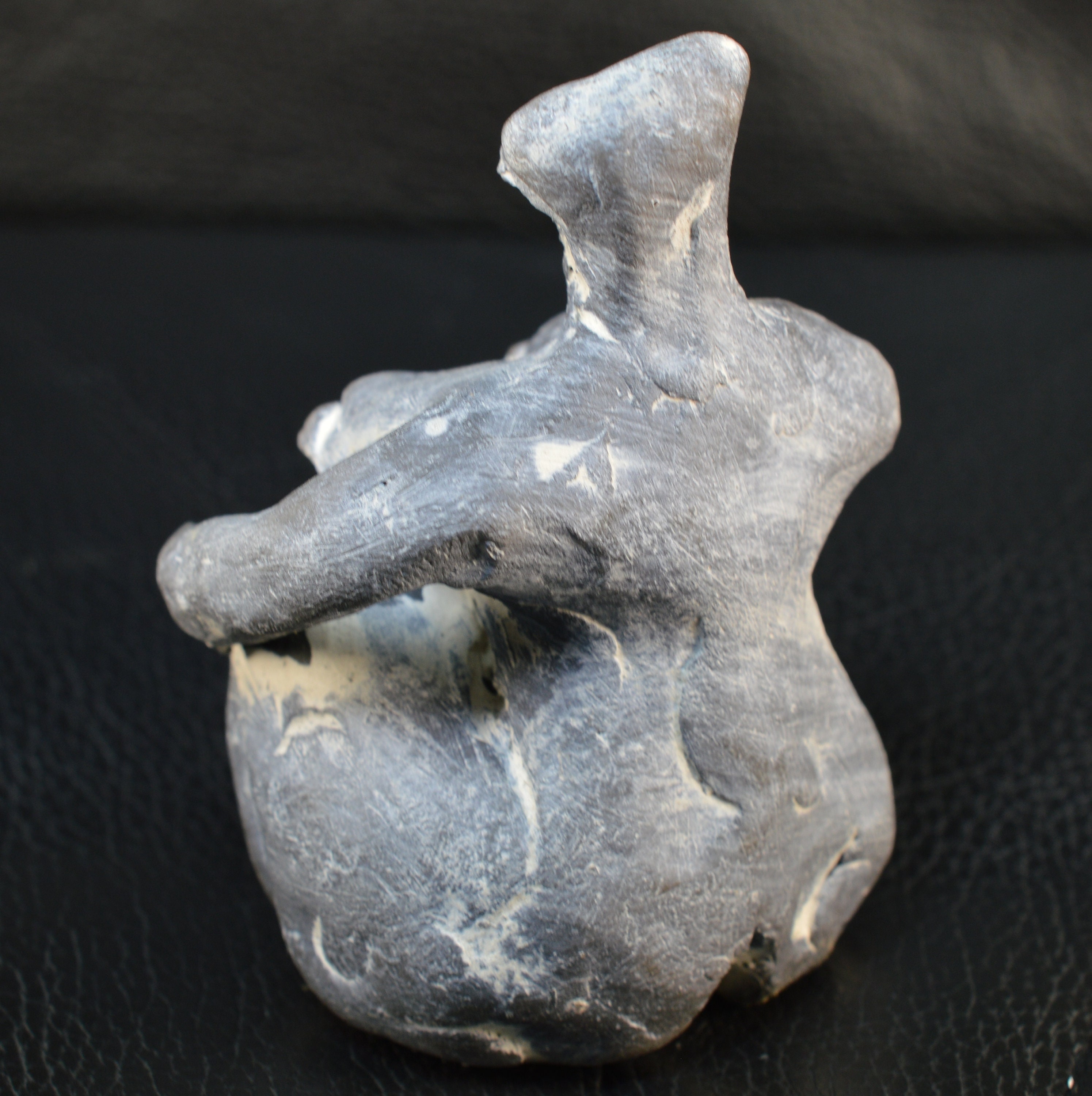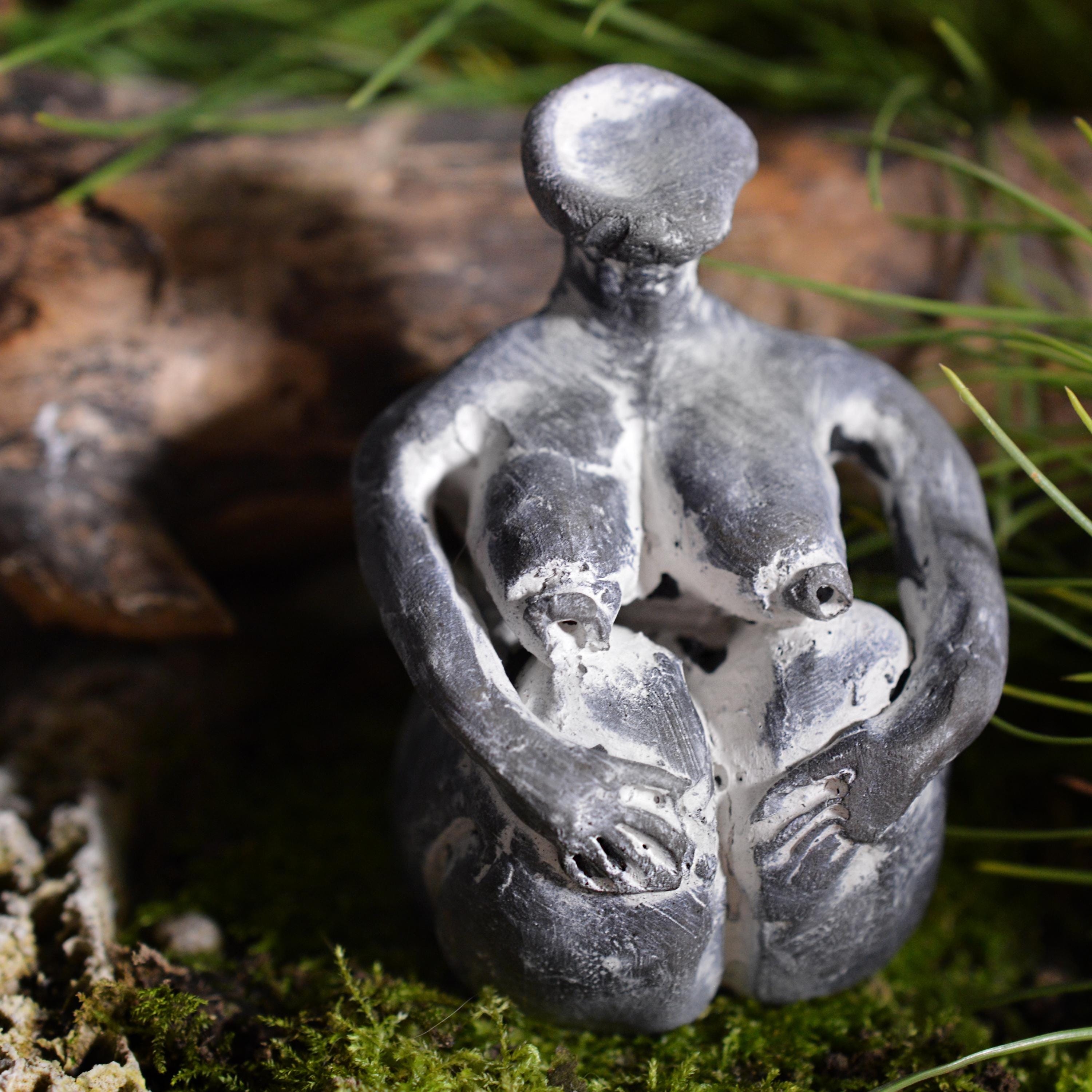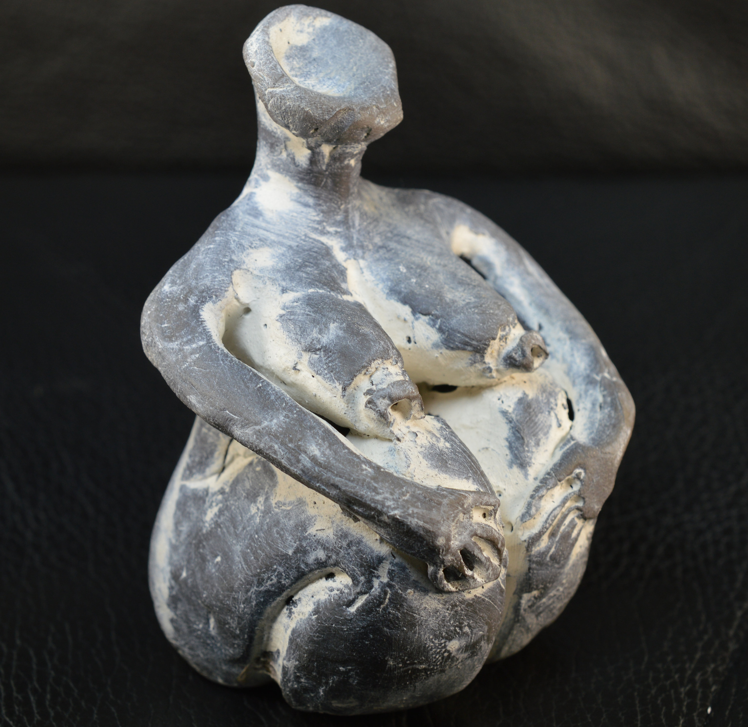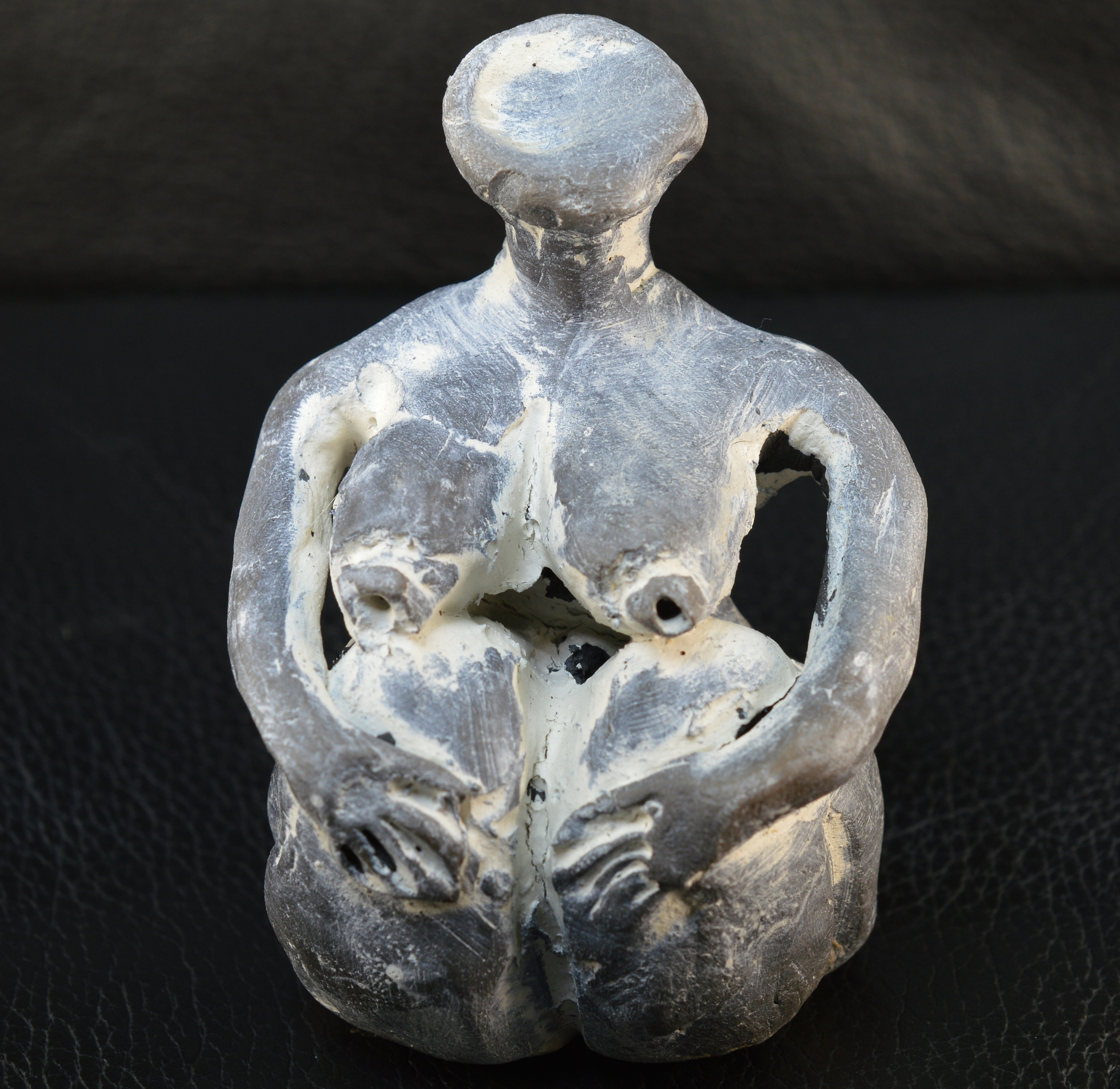 Handcrafted from clay, the figurine depicts a sitting, pregnant women with large belly and full hips. The female Goddess is believed to be a symbol of fertility and prolificacy.