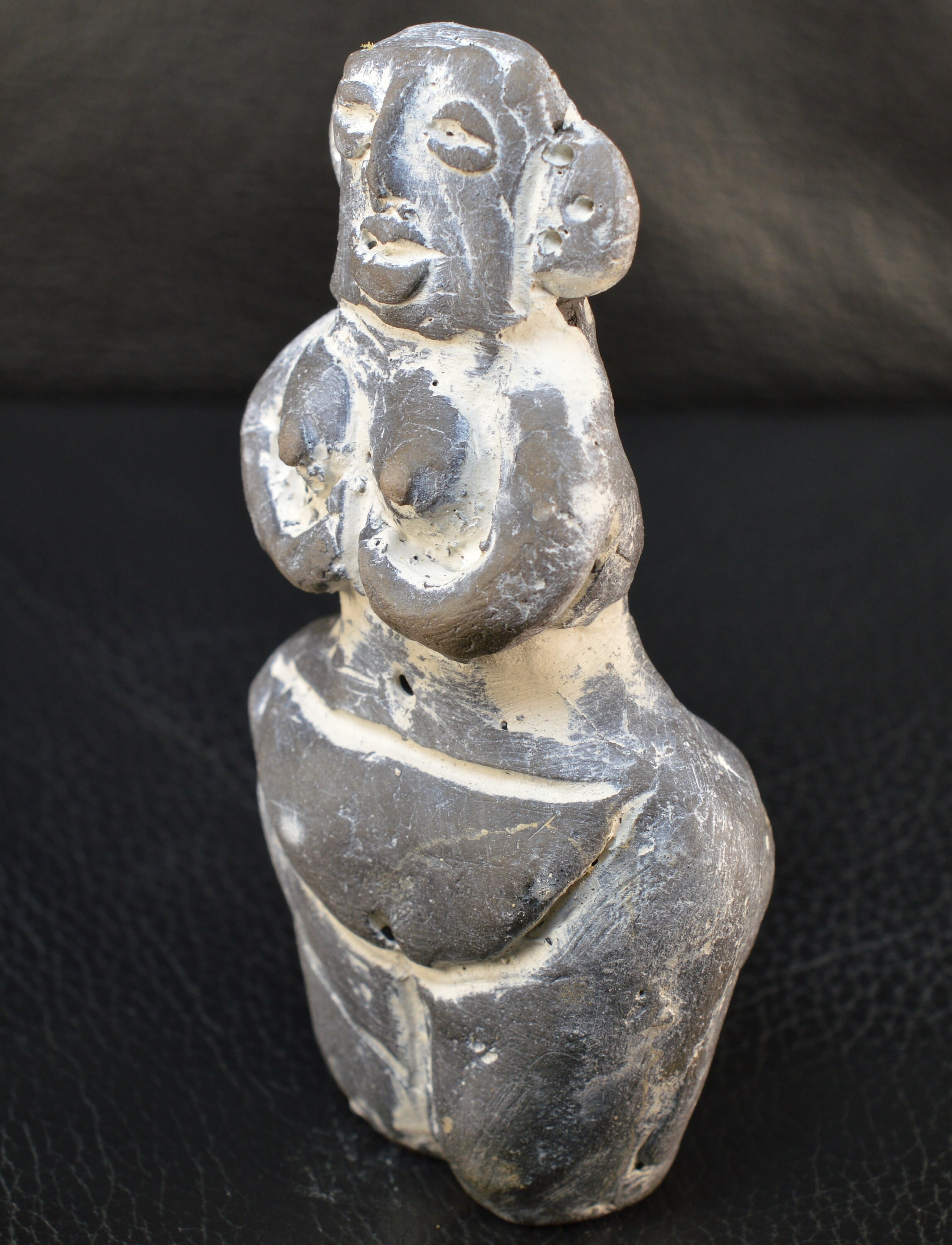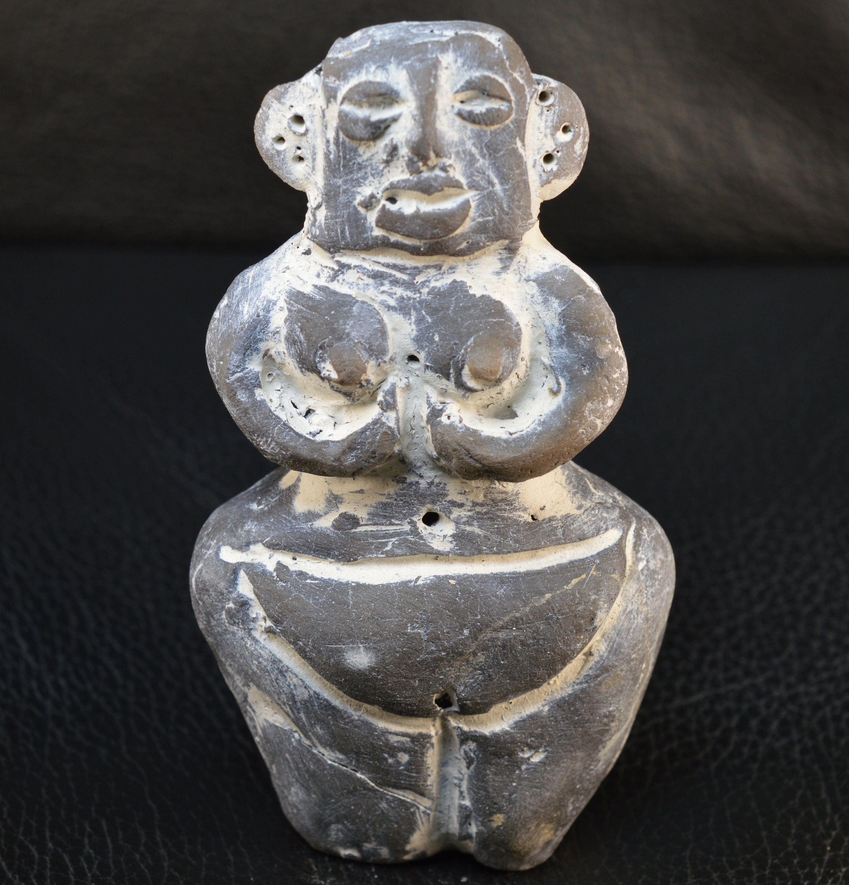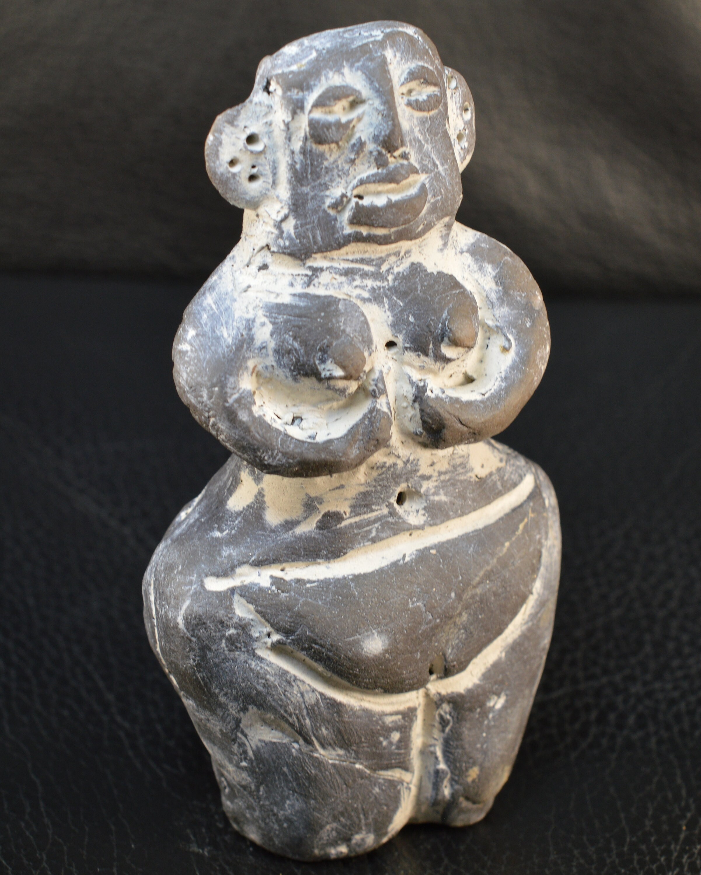 Handcrafted from clay, the figurine depicts a sitting, pregnant women with large belly and full hips. The female Goddess is believed to be a symbol of fertility and prolificacy.